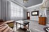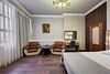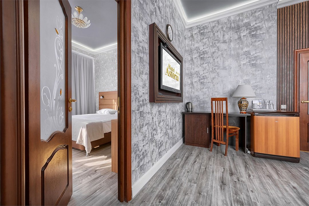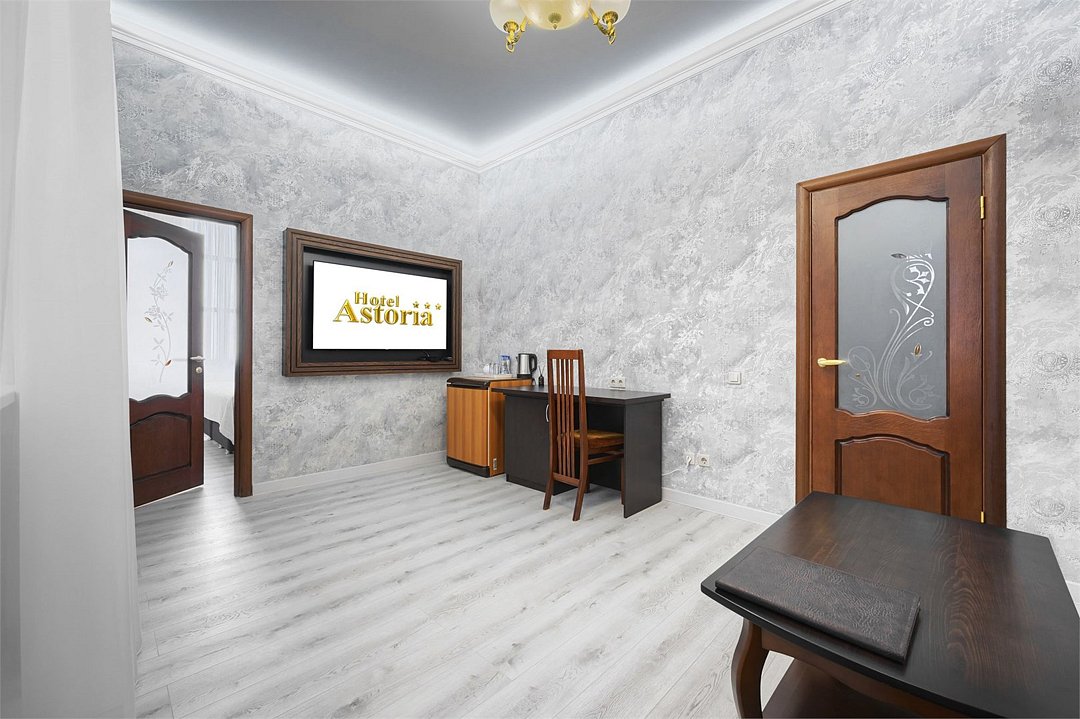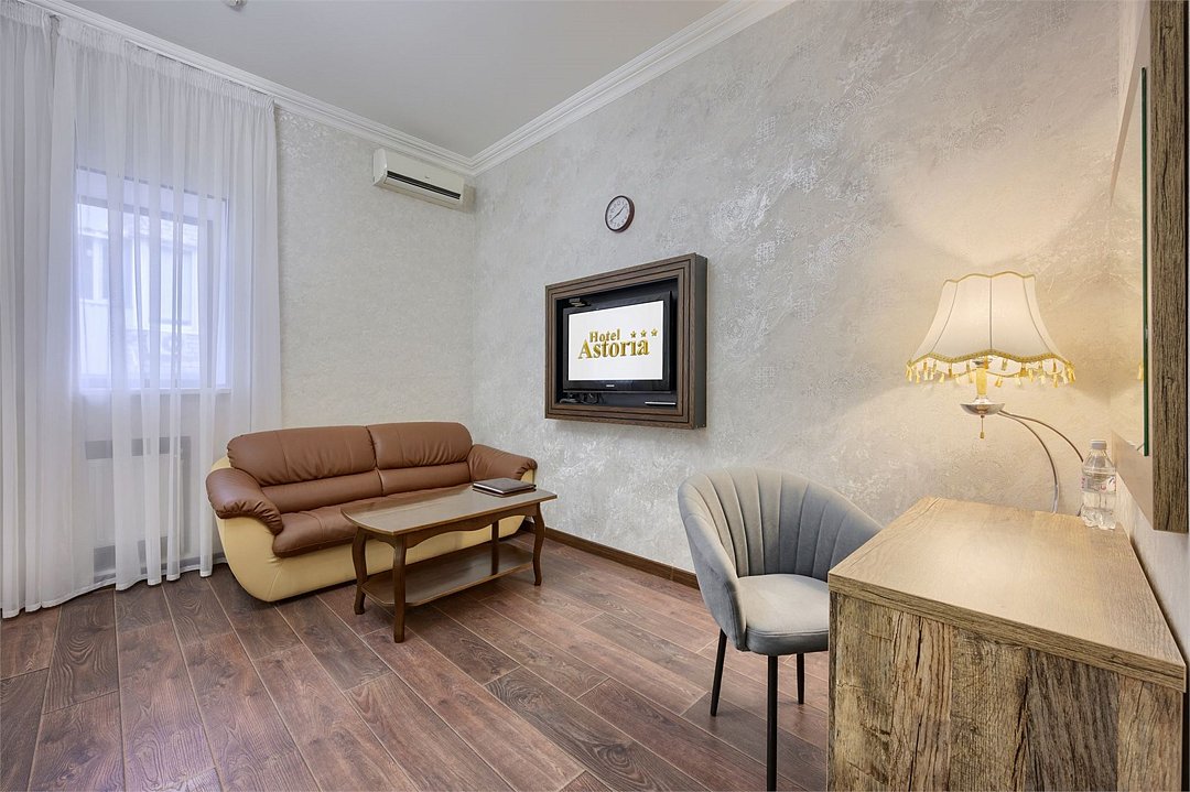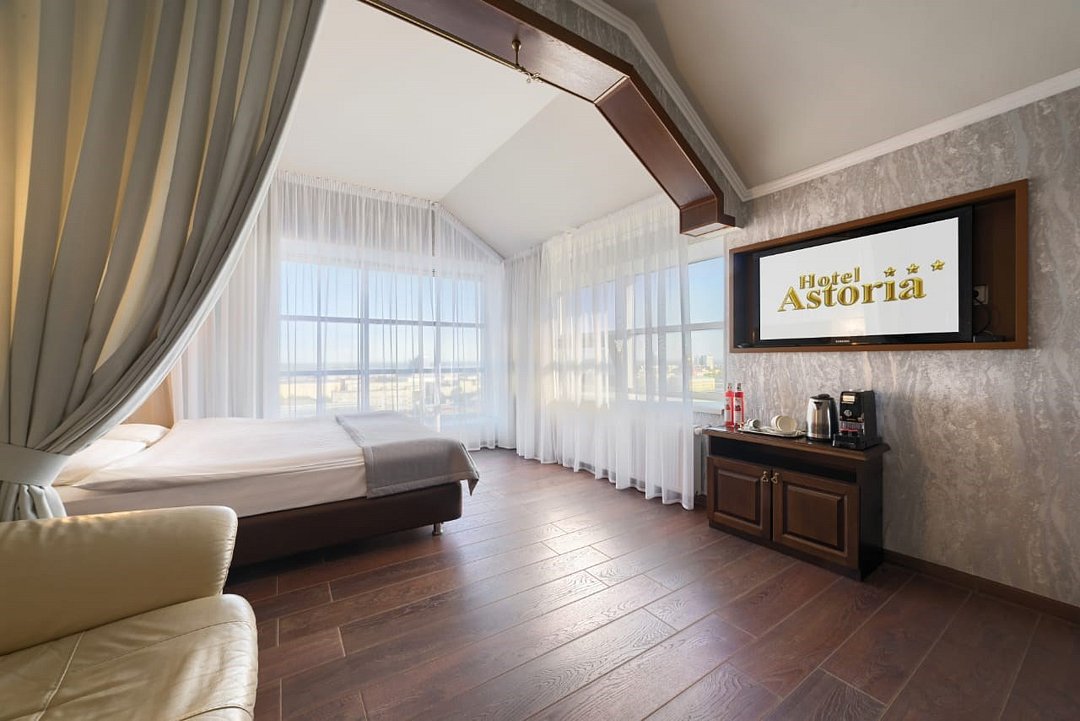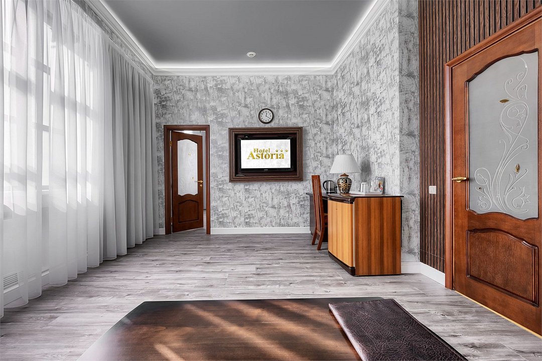 Эксклюзивный дизайн двухкомнатного номера люкс дарит ощущение VIP клиента. Просторная гостиная с большим кожаным диваном, журнальным столиком, и телевизором удобна не только для отдыха, но и для непринужденной встречи «без галстуков», а также необходимой работы в деловой поездке. Номер предназначен и для семейного размещения до четырех человек. Двуспальная кровать для родителей и раскладывающийся диван в гостиной для детей - удобное решение для полноценного отдыха семьи. Джакузи и климат контроль – особая привилегия в летнюю жару.Услуги и удобства