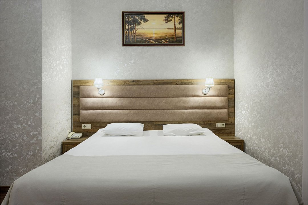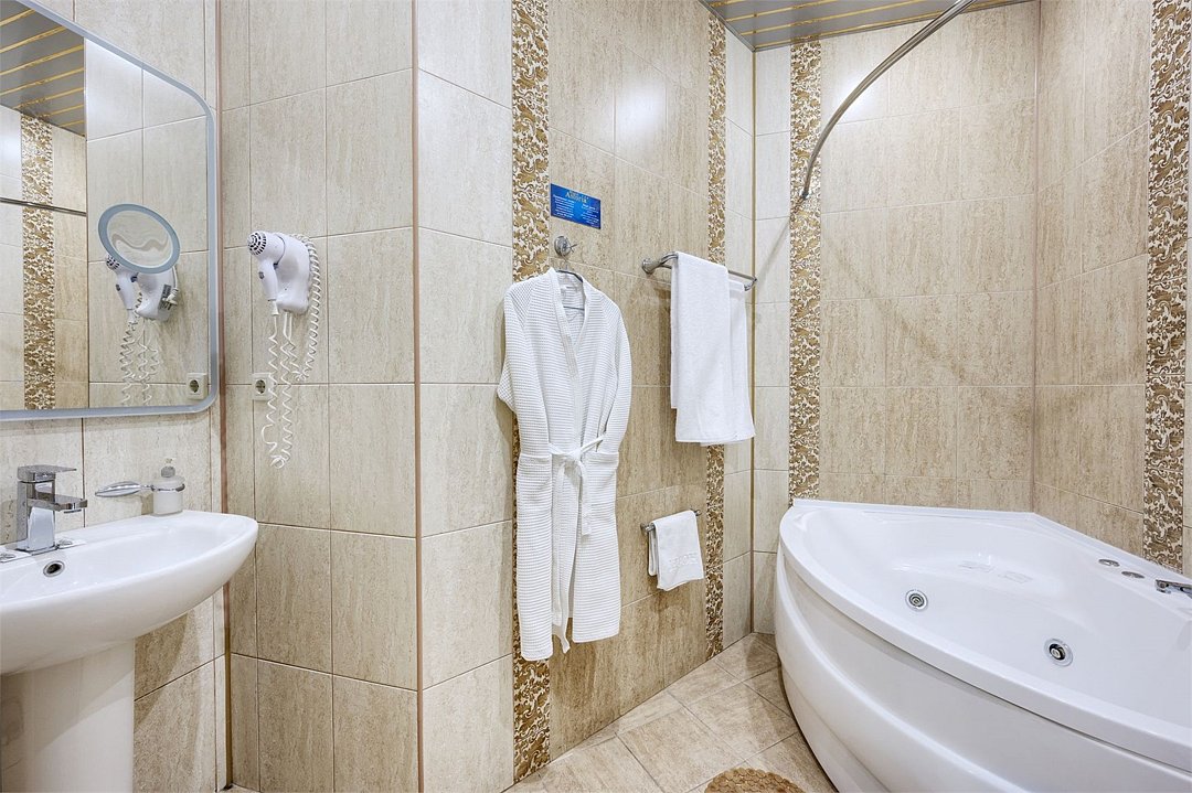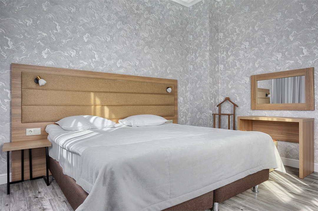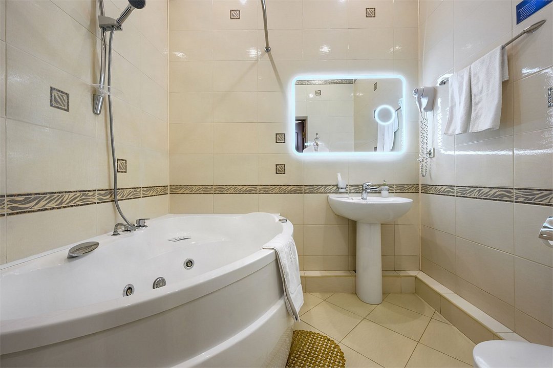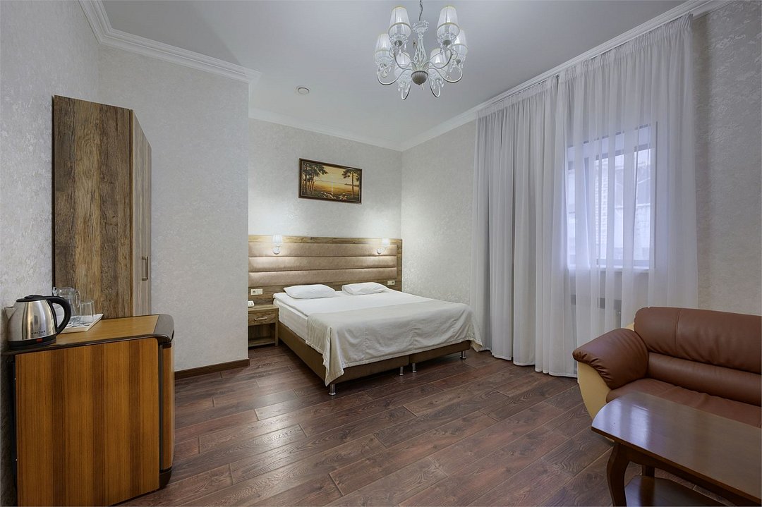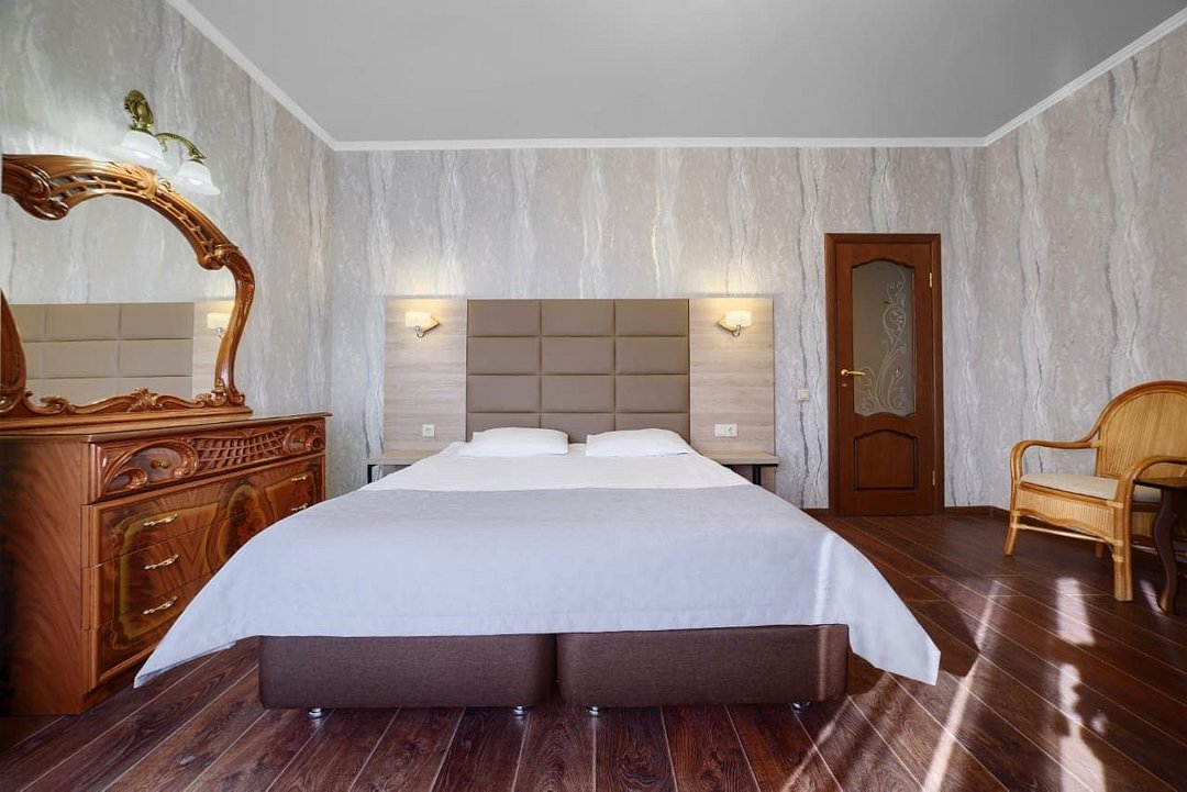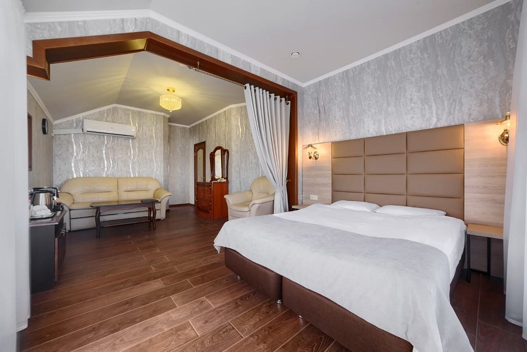 Благоустроенный номер, выполненный в классическом дизайне и мягких, располагающих к отдыху, тонах, подходит для проживания одного-двух человек. В уютной зоне отдыха - два кресла и журнальный столик, широкоформатный телевизор, холодильник. В спальной зоне - удобная двуспальная кровать, туалетный столик с большим зеркалом. Отдельная ванная комната оборудована джакузи, раковиной. Здесь есть все необходимые гигиенические средства. Wi-Fi и климат контроль сделают ваш отдых полноценным и восстанавливающим силы.Услуги и удобства