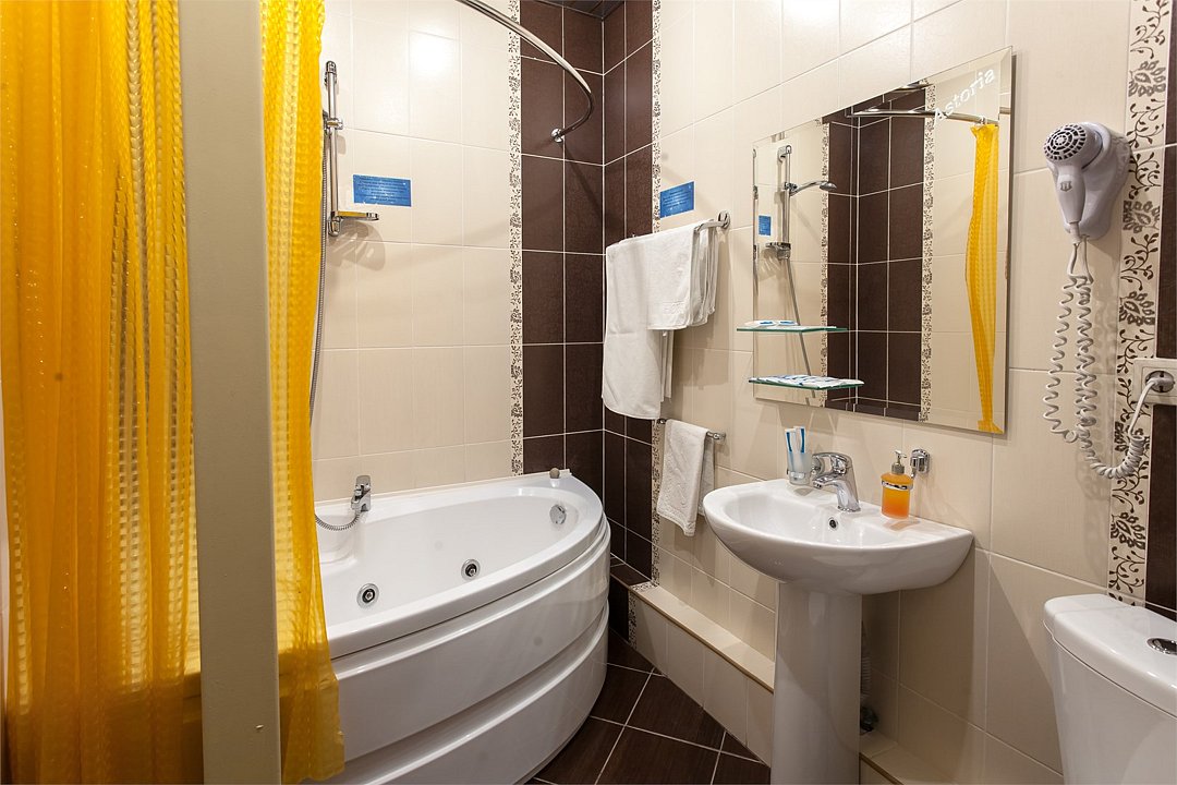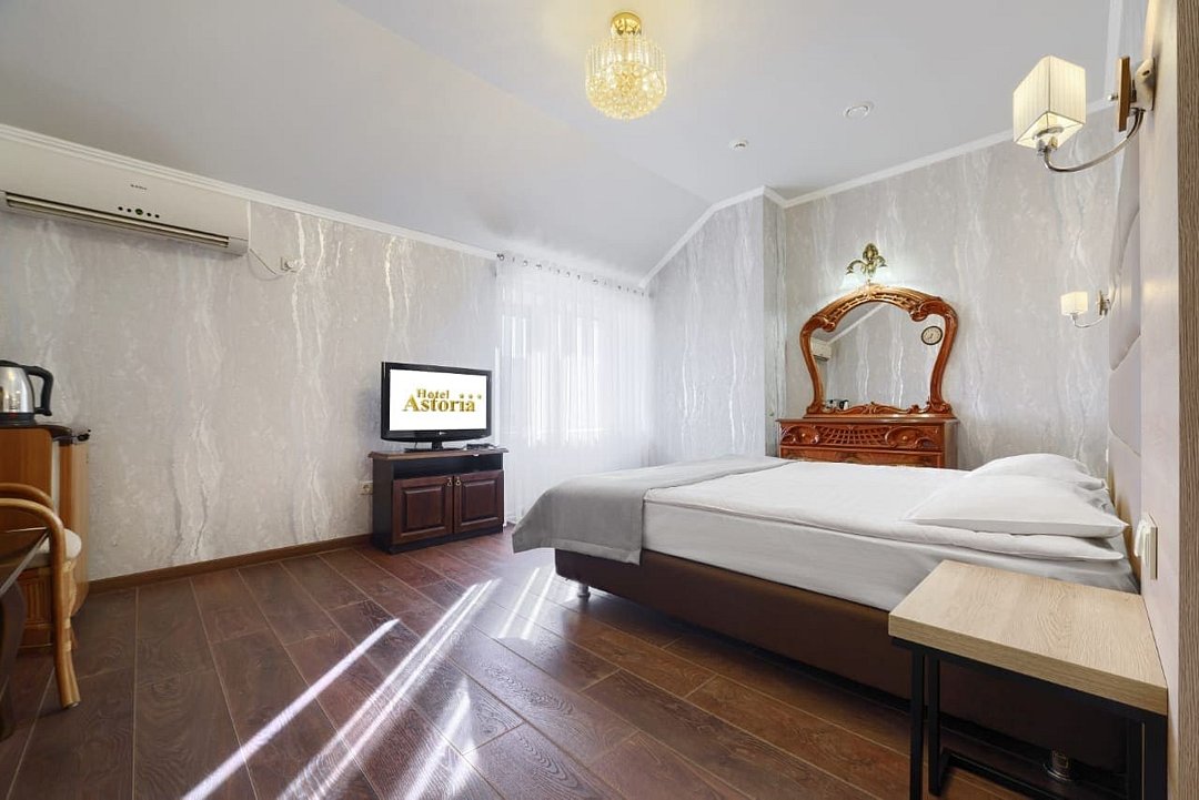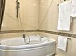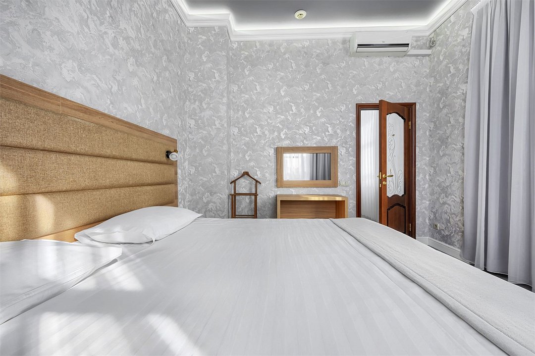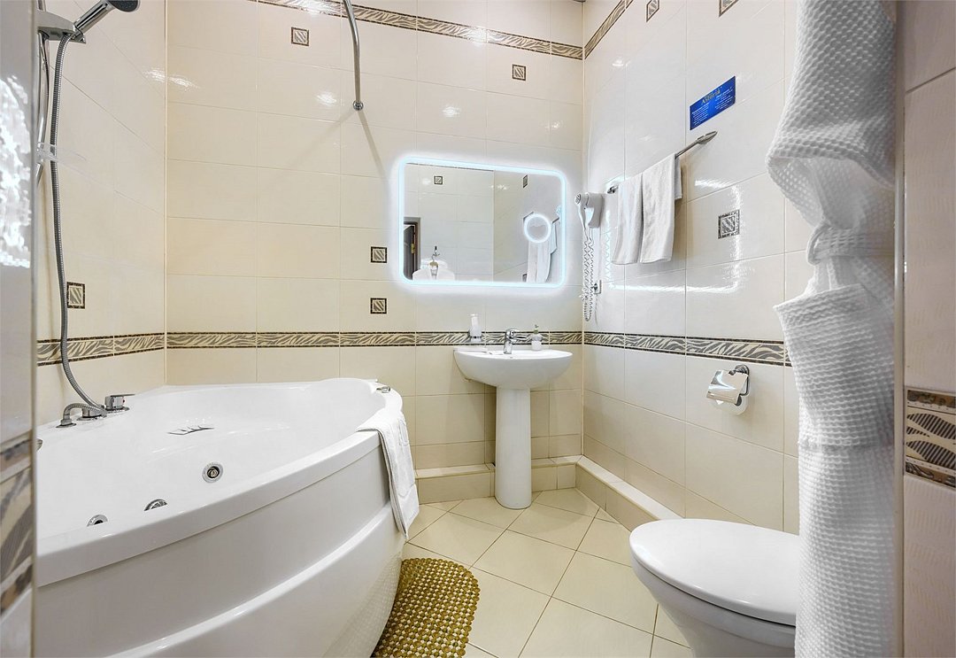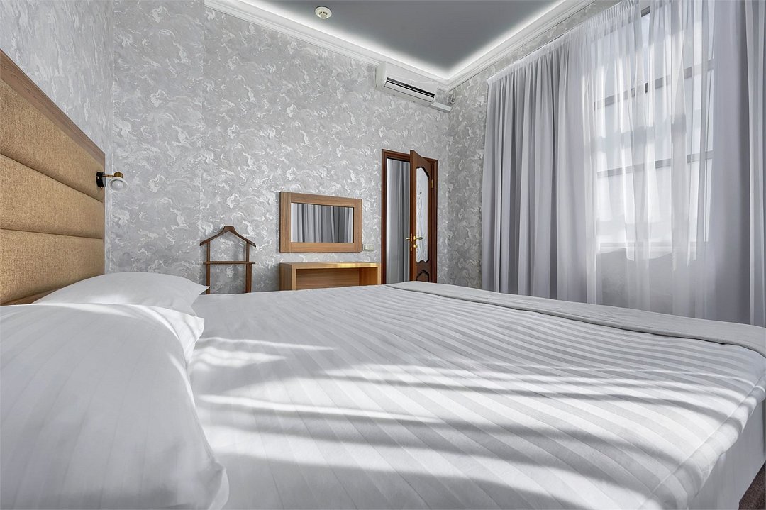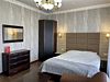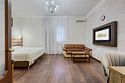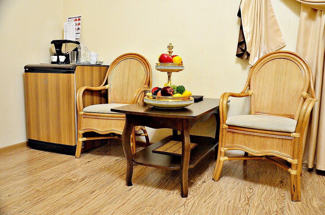 Благоустроенный номер, выполненный в классическом дизайне и мягких, располагающих к отдыху, тонах, подходит для проживания одного-двух человек. В уютной зоне отдыха - два кресла и журнальный столик, широкоформатный телевизор, холодильник. В спальной зоне - удобная двуспальная кровать, туалетный столик с большим зеркалом. Отдельная ванная комната оборудована джакузи, раковиной. Здесь есть все необходимые гигиенические средства. Wi-Fi и климат контроль сделают ваш отдых полноценным и восстанавливающим силы.Услуги и удобства