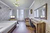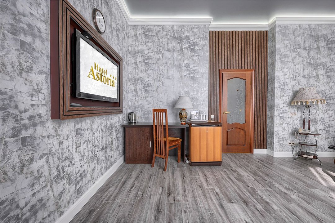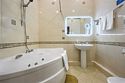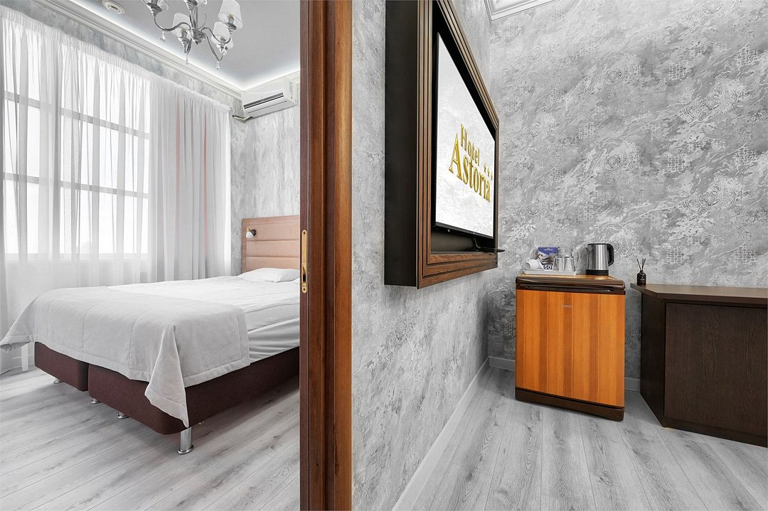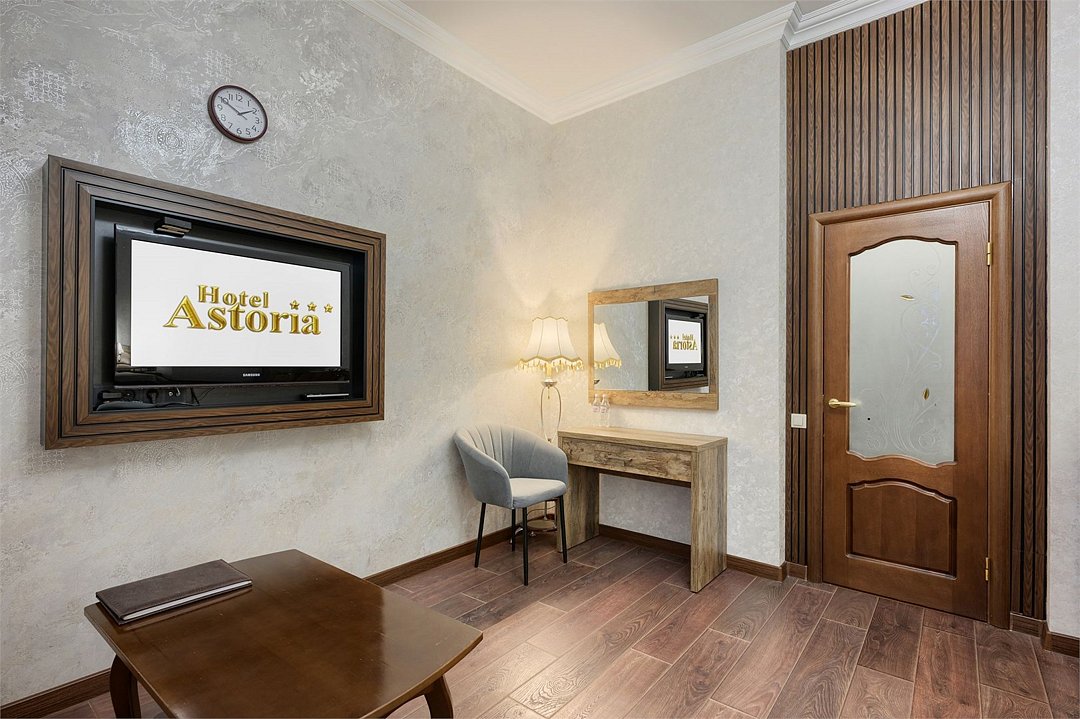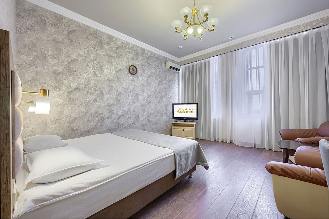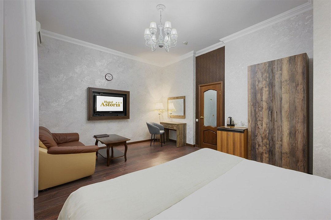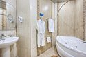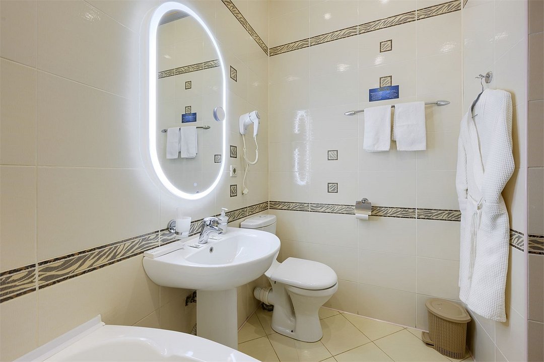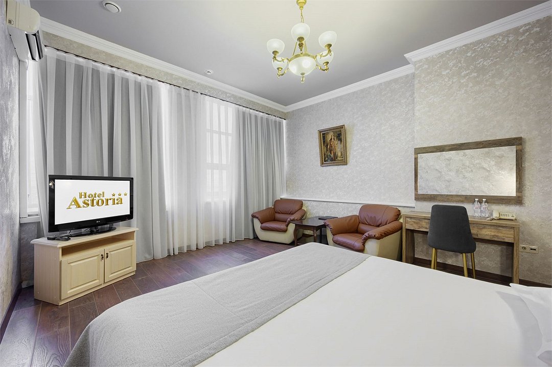 Благоустроенный номер, выполненный в классическом дизайне и мягких, располагающих к отдыху, тонах, подходит для проживания одного-двух человек. В уютной зоне отдыха - два кресла и журнальный столик, широкоформатный телевизор, холодильник. В спальной зоне - удобная двуспальная кровать, туалетный столик с большим зеркалом. Отдельная ванная комната оборудована джакузи, раковиной. Здесь есть все необходимые гигиенические средства. Wi-Fi и климат контроль сделают ваш отдых полноценным и восстанавливающим силы.Услуги и удобства
