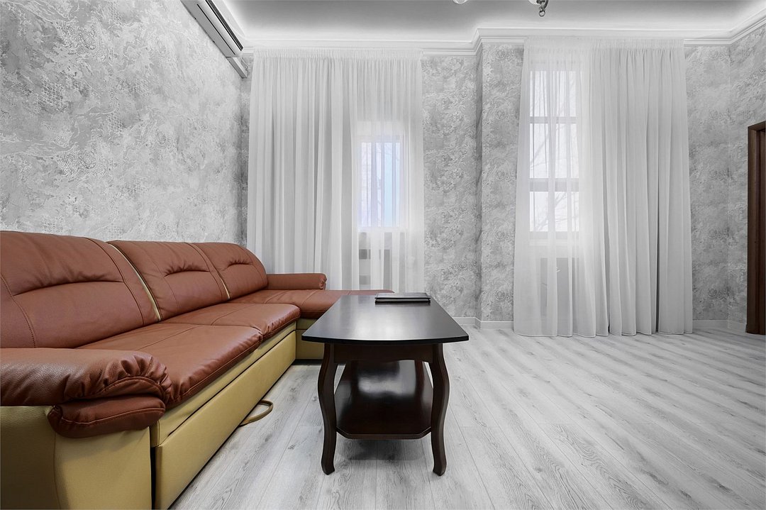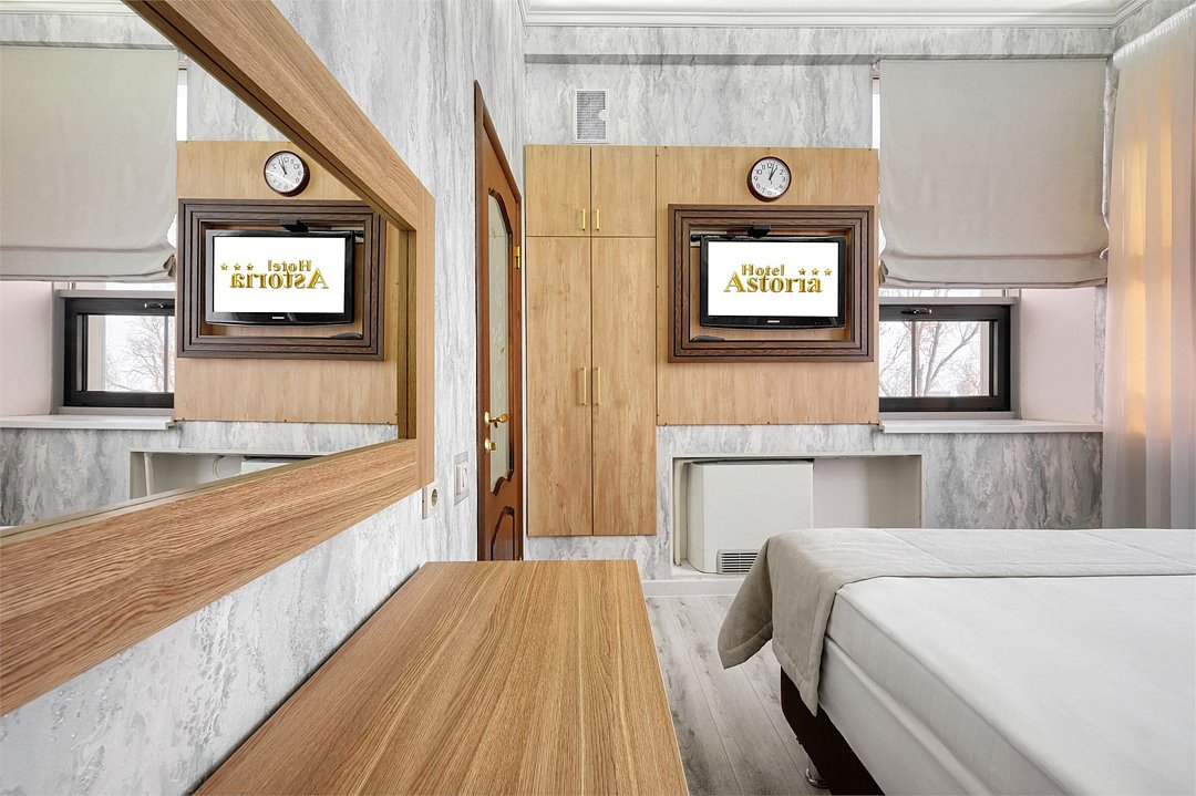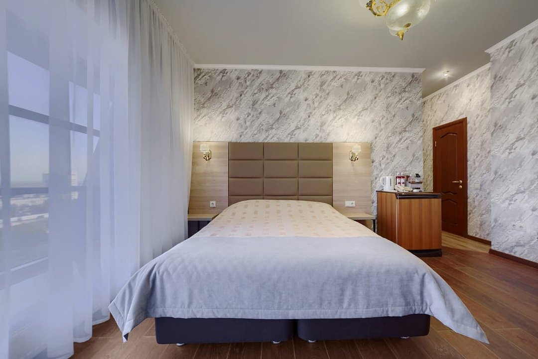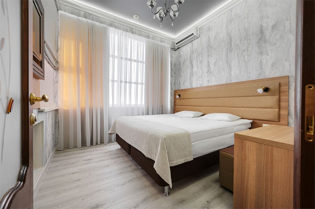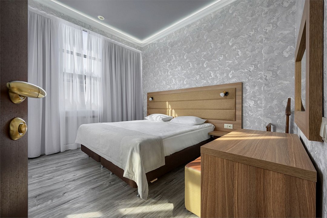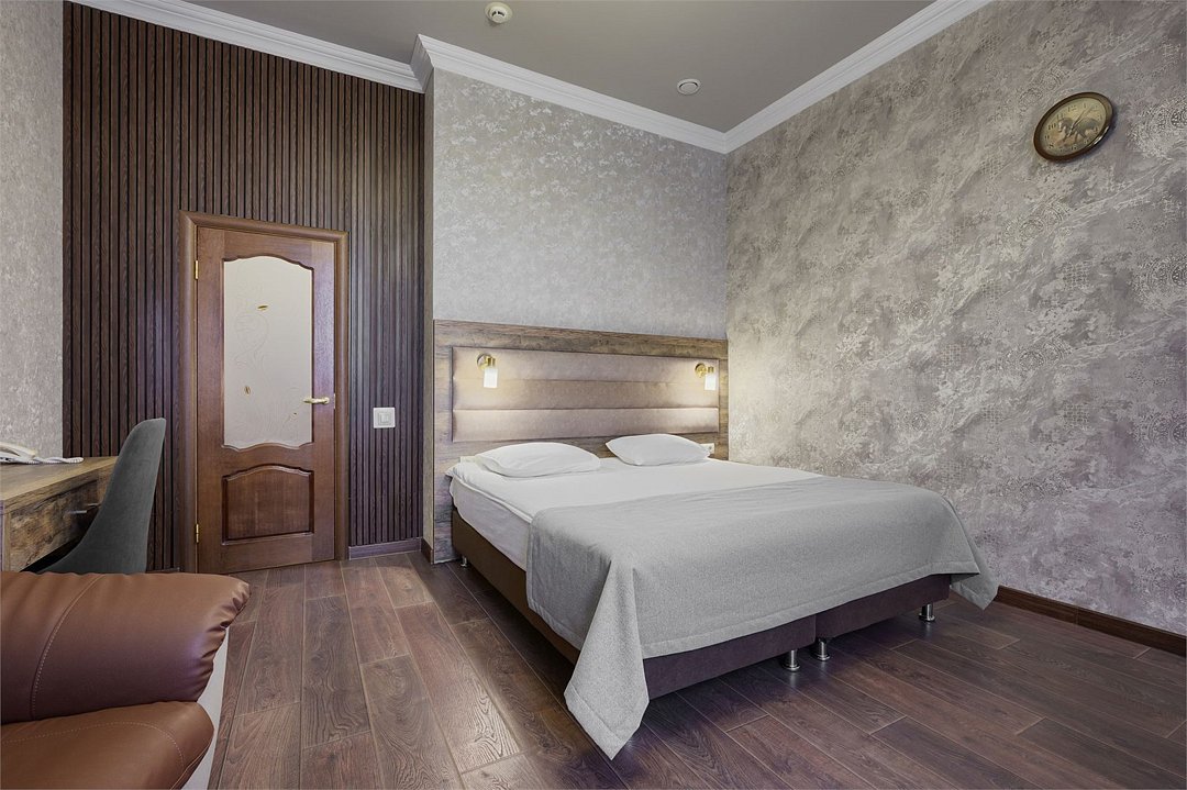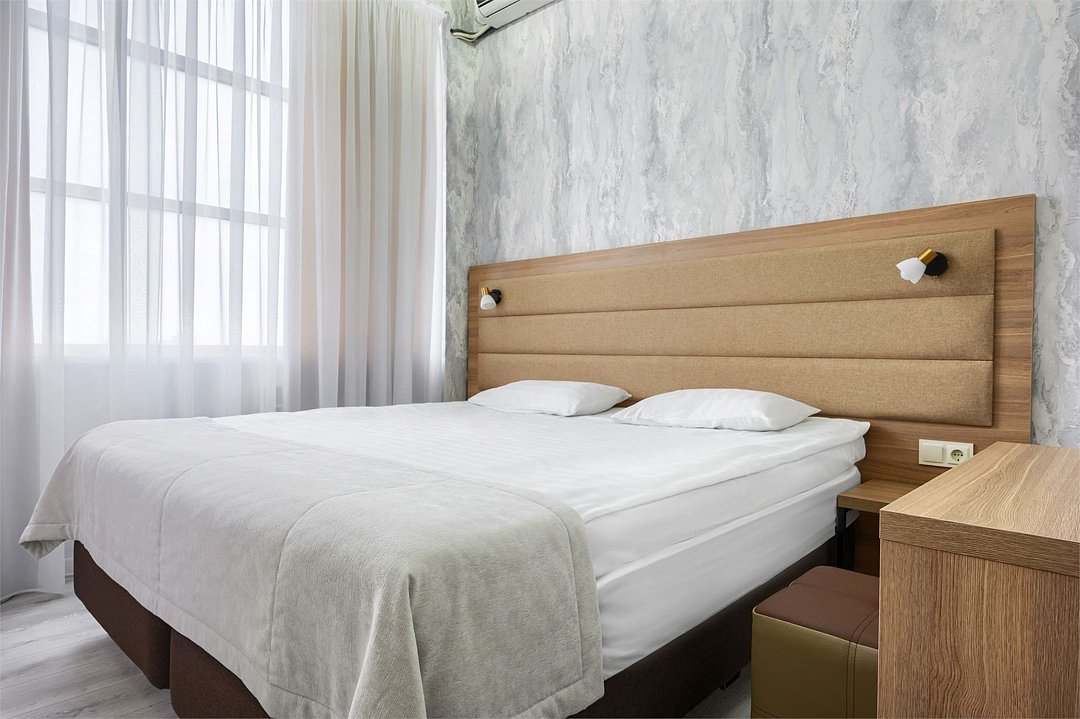 Однокомнатный номер повышенной комфортности, исполненный в мятных или кремовых тонах – отличный вариант для проживания двух человек. Стильный кожаный диван, журнальный столик, современный телевизор составляют уютную зону отдыха. Большая двуспальная кровать с ортопедическим матрасом ASCONA обеспечивает качественный сон и восстановление. Принять ванную и привести себя в порядок можно в отдельной ванной комнате. Климат контроль, бесплатный Wi-Fi, детали полноценного отдыха или продуктивной работы.Услуги и удобства