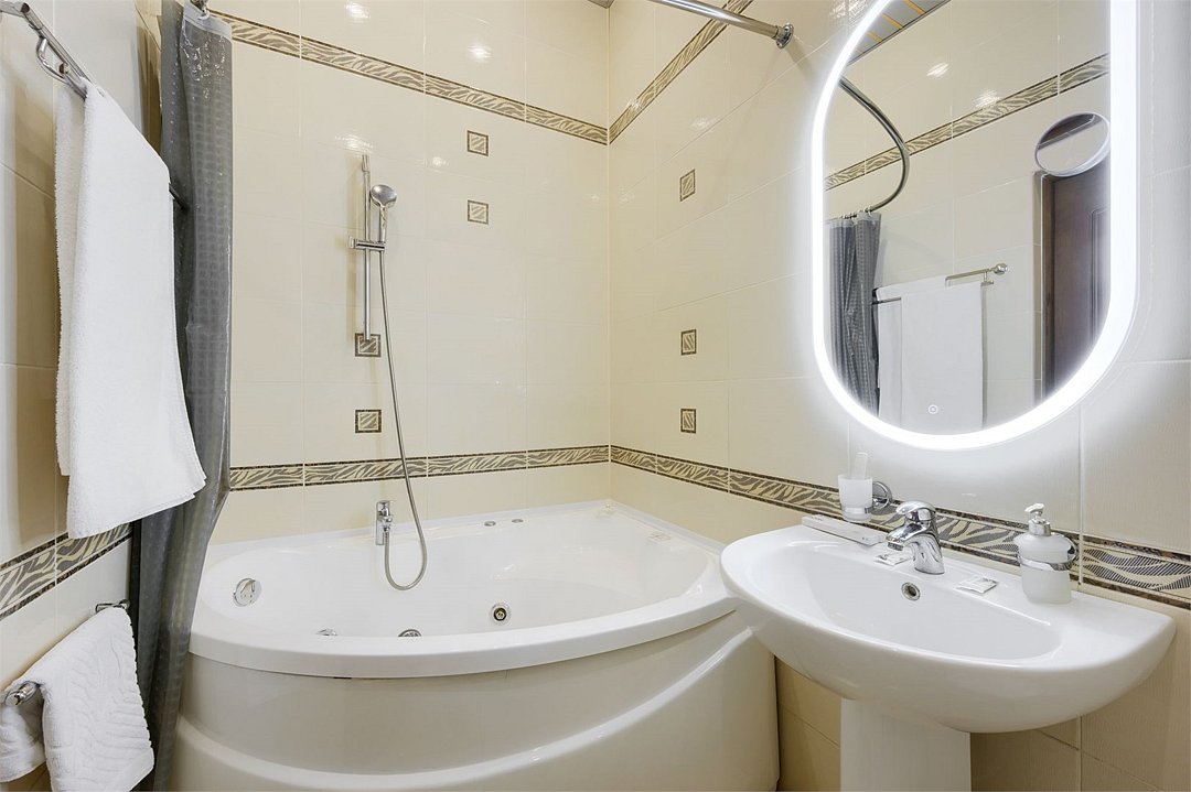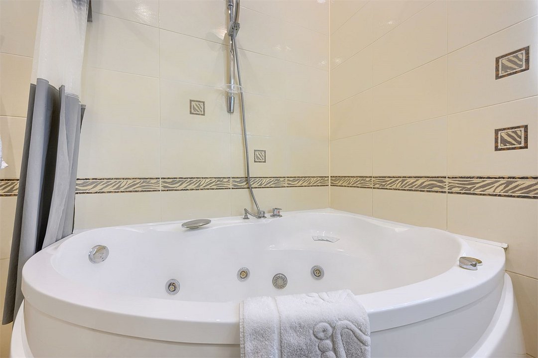 интерактивное телевидение, Wi-Fi, холодильник, кондиционер, светильник, настольные лампы, фен, ванная с джакузи, гидромассажная ванна, санузел, банные полотенца, тапочки, кровать «King size», двуспальная кровать, ортопедический матрас, тумбы, журнальный столик, звуконепроницаемые стены и окна, обслуживание номеров, чайник, мягкая мебель, отопление, кулер на этаже, вид во двор, ламинат, стаканы, внутренний телефон, телевизор с плоским экраном, москитная сетка, пуфик, джакузи, можно с питомцамиВ номере