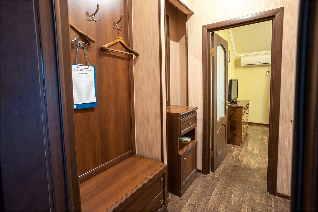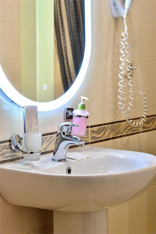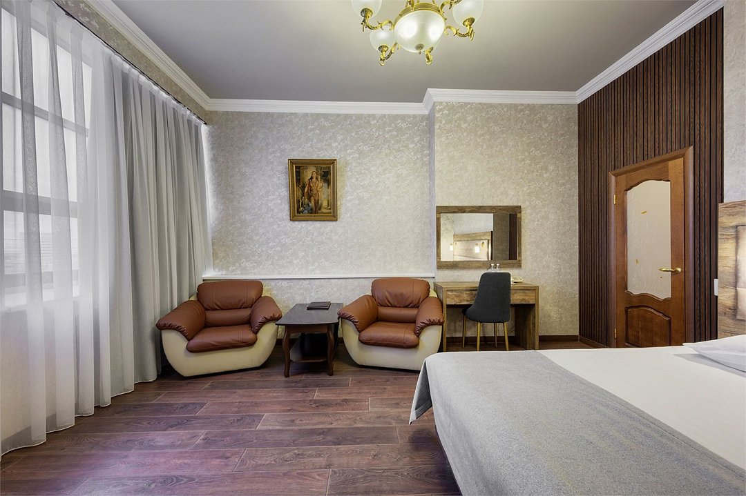 ВАШ ОТДЫХ - НАША ЗАБОТА Администраторы на ресепшн всегда готовы Вам помочь и ответить на все вопросы. Мы вызовем для вас такси, закажем билеты на поезд или самолет и продумаем развлекательную программу - кино, концерты, клубы. Ваш отдых - наша забота. Мы создадим все условия для отдыха, который будет Вам необходим после насыщенного событиями дня. «Будьте, как дома», – скажем мы Вам, вручая ключ от одного из комфортабельных номеров нашей гостиницы. В каждом номере удобная кровать с ортопедическим матрасом, журнальный столик, широкоформатный ЖК телевизор. шкаф, вешалка для верхней одежды. В люксах в гостевой комнате находится раскладной диван, в спальне дополнительный ЖК телевизор. Ванная комната оборудована, современной качественной сантехникой.