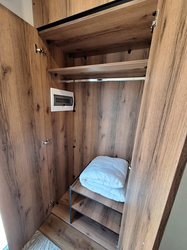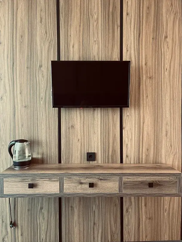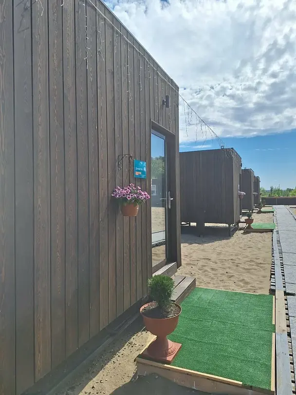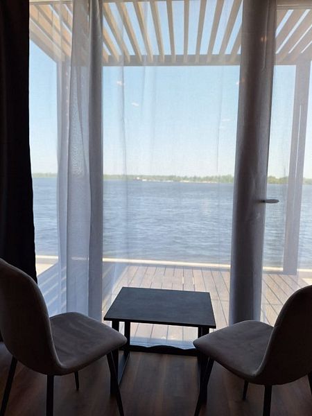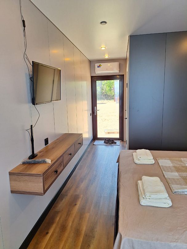 Домики отличается своей высокой устойчивостью к высоким и низким температурам и оснащены всем необходимым для комфортного проживания: теплоснабжением, водоснабжением, водоотведением, удобной мебелью, телевизором, гардеробом и санузлом. Из панорамных окон открывается вид на успокаивающий речной пейзаж.
