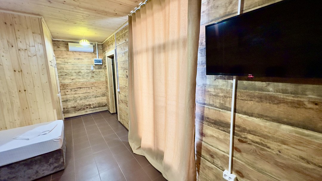 Бунгало (отдельно стоящий домик) двухместный. Собственная ванная комната ,набор полотенец, средства личной гигиены, тапочки ,фен и чайник (по запросу на ресепшн), кондиционер, набор постельного белья, натуральное постельное белье из 100% хлопка, стол и стулья, шкаф, прикроватные тумбочки, кондиционер, набор полотенец, телевизор.