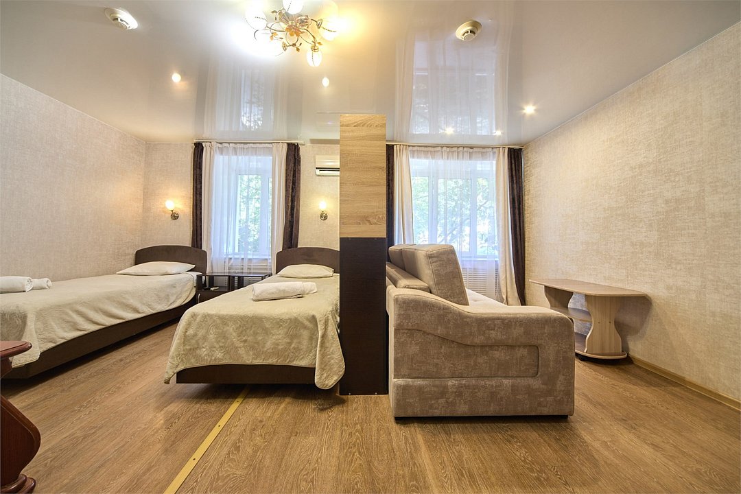 Гостиничный двухместный номер стандарта "полулюкс", отличается от номеров "стандарт" большей площадью, в номере два окна, вместо душевой кабины установлена ванна, дополнительно в номере установлена мягкая мебель. Данный гостиничный номер рассчитан на комфортное проживание 2 клиентов, с возможностью размещения до 5 гостей. Чтобы быстро забронировать гостиницу посетите страницу онлайн-бронирования или позвоните по одному из телефонов вверху сайта.Услуги и удобства