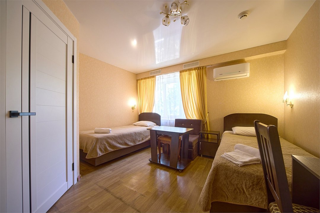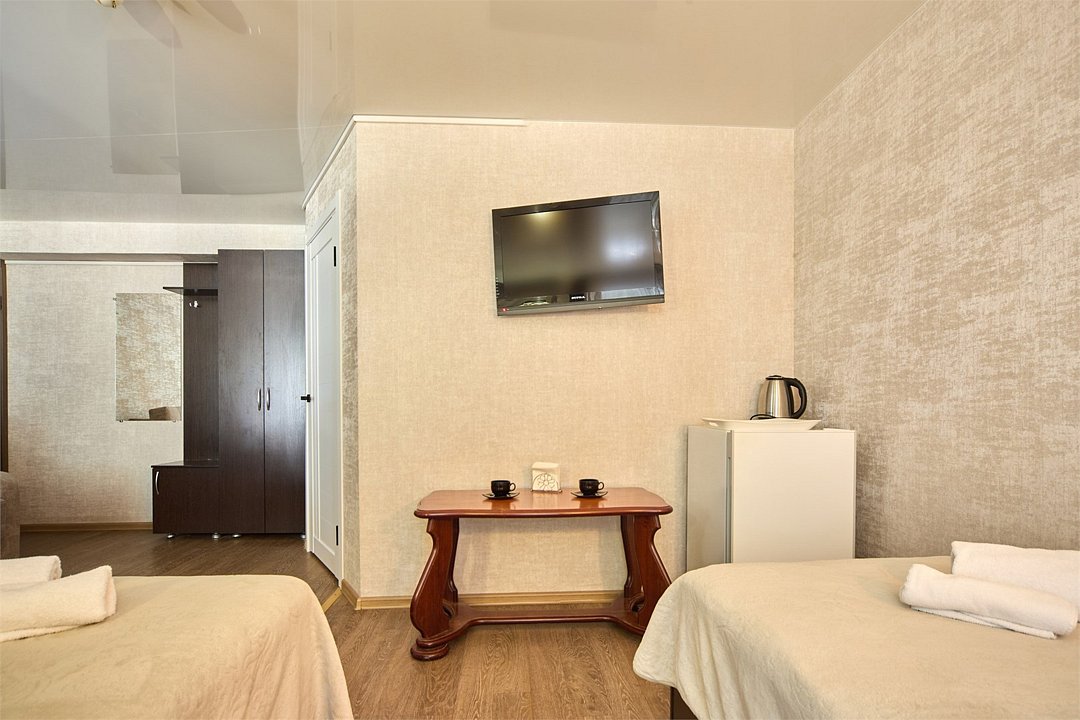 телевизор, кабельное телевидение, Wi-Fi, холодильник, фен, душевая кабина, санузел, банные полотенца, тапочки, две односпальные кровати, гладильная доска, тумбы, стулья, шкаф для одежды, вешалки, журнальный столик, письменный стол, зеркало, обслуживание номеров, чайник, унитаз, раковина, отопление, вид во двор, стаканы, туалетные средства, сплит-система, телевизор с плоским экраном, москитная сетка, номер для некурящих, холодильный шкаф, уборка номера, набор для приготовления чая и кофе, услуги прачечной (платно)В гостиничном номере
