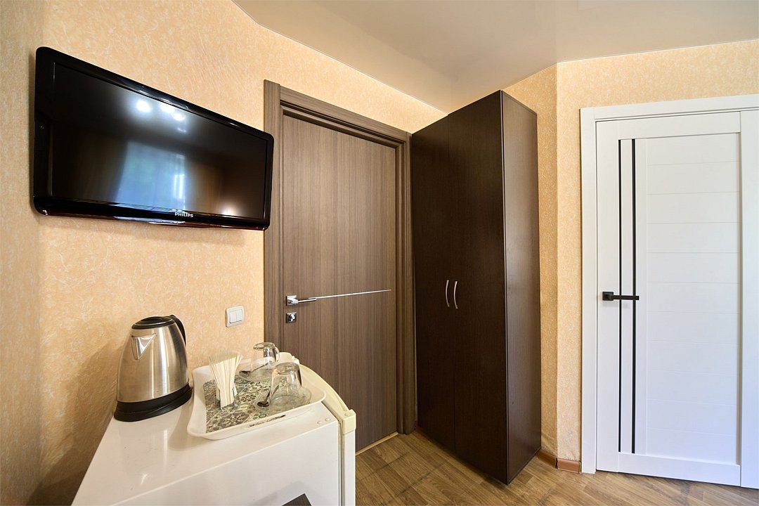 телевизор, кабельное телевидение, Wi-Fi, холодильник, фен, душевая кабина, санузел, банные полотенца, тапочки, двуспальная кровать, гладильная доска, тумбы, стулья, вешалки, зеркало, обслуживание номеров, чайник, унитаз, раковина, отопление, вид во двор, стаканы, стол, туалетные средства, сплит-система, телевизор с плоским экраном, москитная сетка, номер для некурящих, холодильный шкаф, уборка номера, услуги прачечной (платно)В гостиничном номере