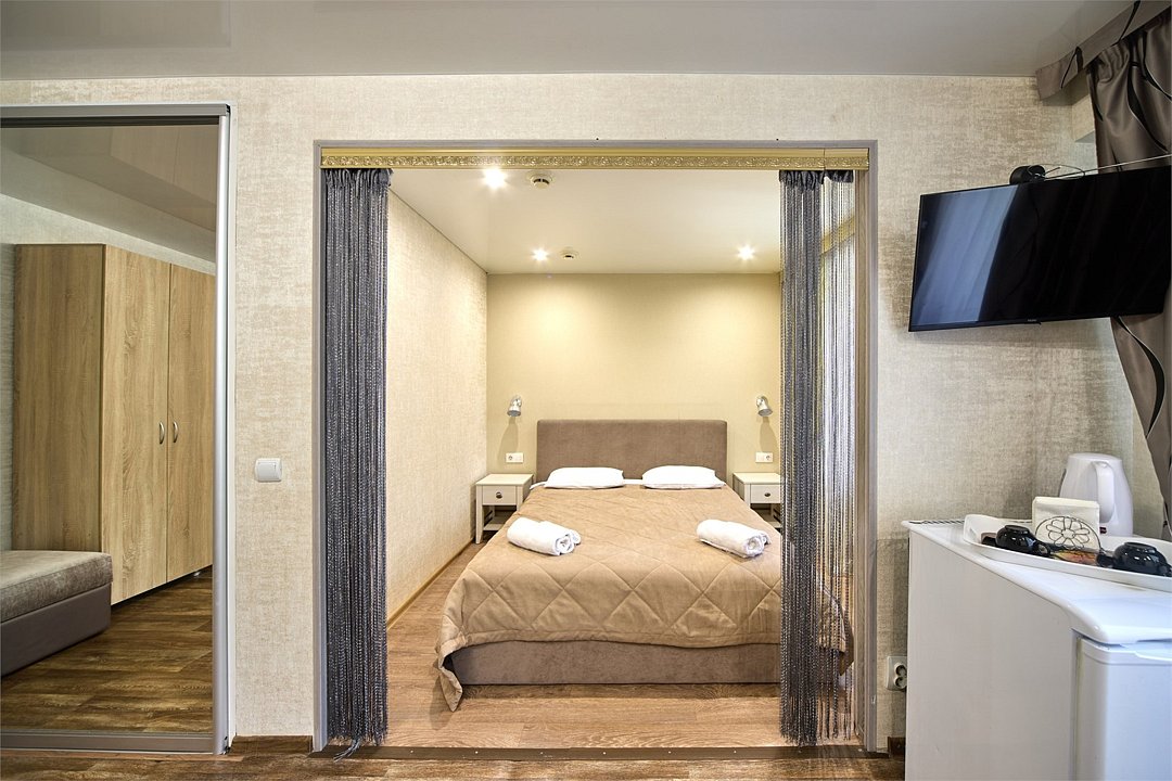 телевизор, два телевизора, кабельное телевидение, Wi-Fi, холодильник, фен, ванная комната, ванна, санузел, водонагреватель, банные полотенца, тапочки, двуспальная кровать, гладильная доска, стулья, шкаф для одежды, вешалки, зеркало, пуфики, две комнаты, чайник, унитаз, раковина, душ, кресло, вид во двор, стаканы, стол, туалетные средства, сплит-система, диван-кровать, раскладной диван, раскладное кресло, телевизор с плоским экраном, москитная сетка, номер для некурящих, холодильный шкаф, уборка номера, набор для приготовления чая и кофе, услуги прачечной (платно), прачечная (за дополнительную плату)В гостиничном номере