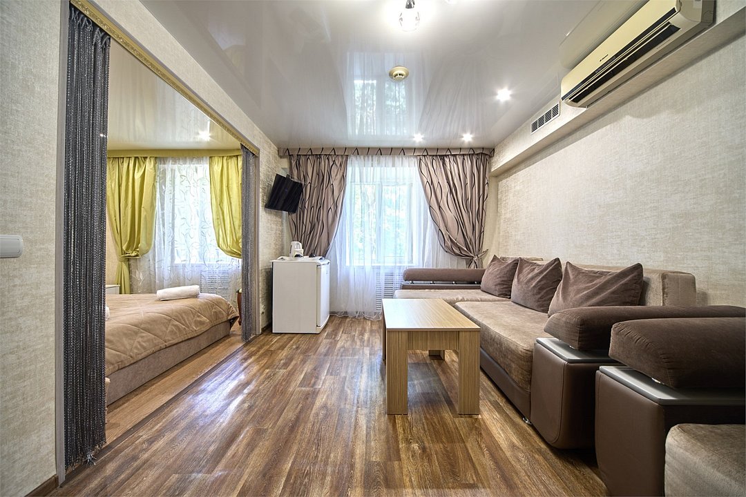 В номере Люкс за вполне демократичную цену вы получите в распоряжение 2 комнаты, в которых с комфортом разместиться семья из 5 человек, компания друзей или коллег. Снять номер «Люкс» в нашем частном отеле вы можете через форму онлайн-бронирования на нашем сайте. оставьте заявку и с вами свяжутся наши менеджеры для уточнения подробностей. Номер «Люкс» в гостинице «Волгоградская» — это номер повышенной комфортности. Две комнаты, жк-телевизор в каждой комнате, тропический душ и мягкая мебель сделают проживание в нём очень комфортным для клиентов нашей гостиницы. А возможность проживания в номере до 5 клиентов, делают его экономным в пересчёте стоимости для каждого человека.Услуги и удобства