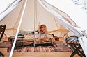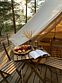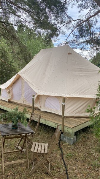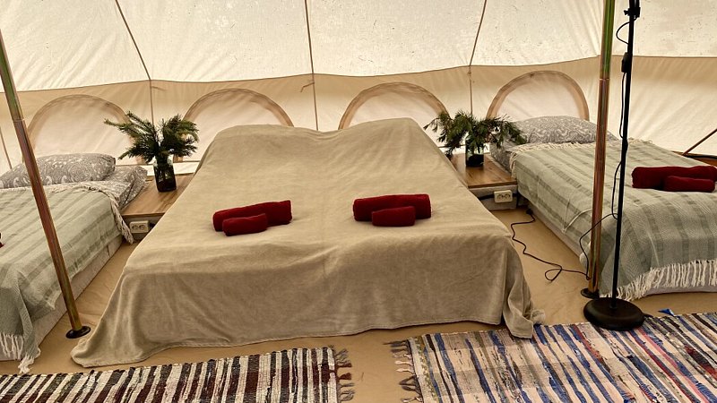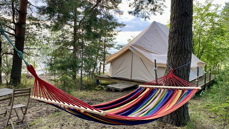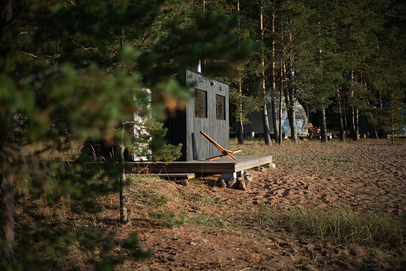 Белл-тент установлен на деревянной платформе в сосновом бору на берегу Ладожского озера. Большая двухспальная кровать и одна односпальная. Посуда для сервировки стола внутри. Общая уличная кухня и мангальная зона в 20 метрах. Общий санузел в 20 метрах. Электрический обогреватель. Размещение с питомцами не допускается.