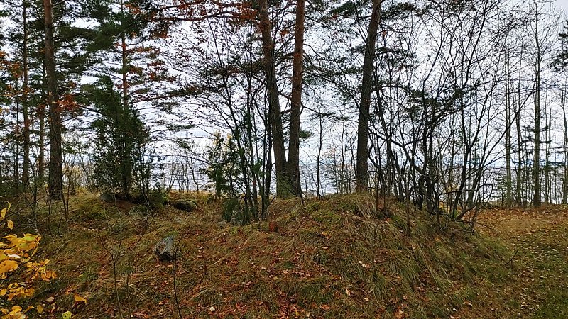 Читать полностьюПо пути на мыс между Ладогой и дорогой можно видеть остатки каменных укреплений береговой батареи, построенной во время Великой отечественной войны перед операцией «Бразиль» по обороне острова Сухо. В рельефе мыса четко читаются окопы, блиндажи и укрытия береговой артиллерии из огромных булыжников. Совсем рядом с глэмпингом Вéззика на поле стояла наблюдательная вышка. В последствии, в целях безопасности военные взорвали блиндажи.