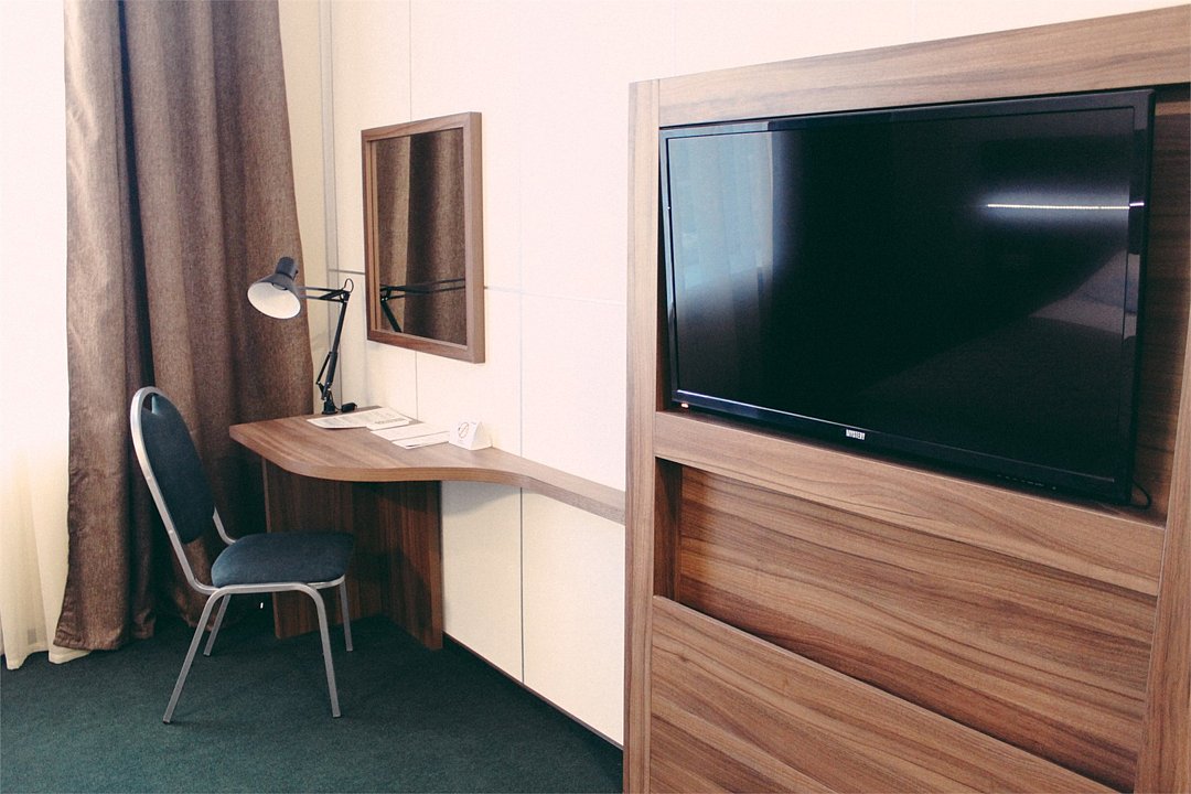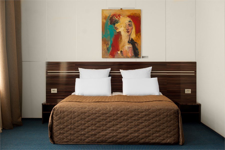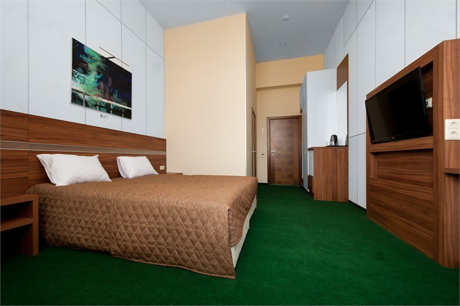 Просторный, удобный номер на двоих человек. В номере есть все, что необходимо для комфортного проживания: мебель (двуспальная кровать 180 см на 200 см, две тумбочки, стул, письменный стол, шкаф, холодильник, электрочайник); современная отделка; LCD-телевизор диагональю 42 дюйма с кабельным ТВ; кондиционер; отдельный санузел с ванной; фен, средства личной гигиены, 5 полотенец.Услуги и удобства