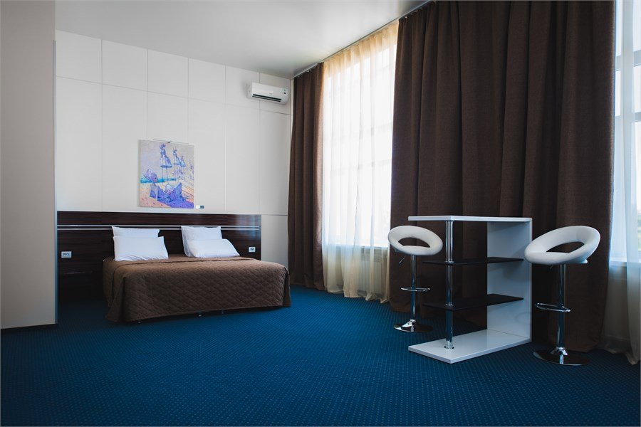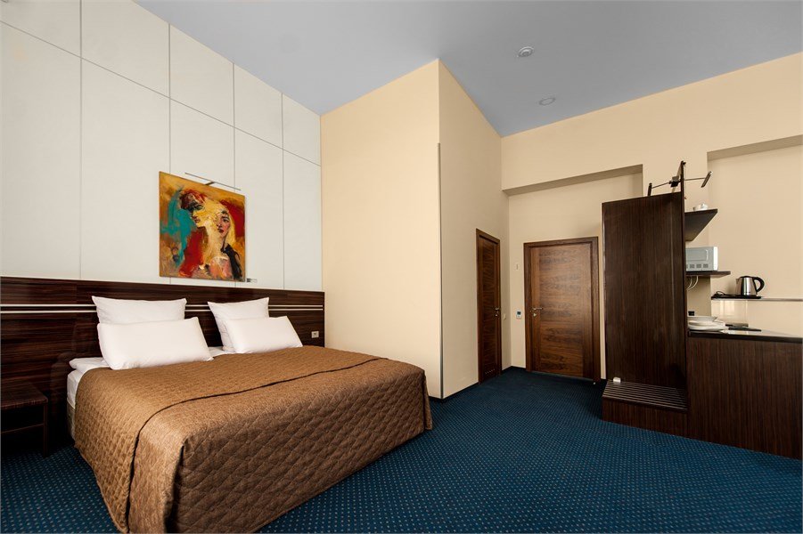 Просторный номер с кухонным гарнитуром. В номере есть все, что необходимо для комфортного проживания: мебель (двуспальная кровать 180 см на 200 см, две тумбочки, стул, письменный стол, диван, шкаф, журнальный столик, мини кухня (кухонный гарнитур, микроволновая печь, холодильник, электрочайник) современная отделка; LCD-телевизор диагональю 42 дюйма с кабельным ТВ; кондиционер; отдельный санузел с ванной; фен, средства личной гигиены, 5 полотенец, 2 махровых халата, тапочки,) услуга «Здоровый сон» (ортопедический матрац и ортопедические подушки).Услуги и удобства