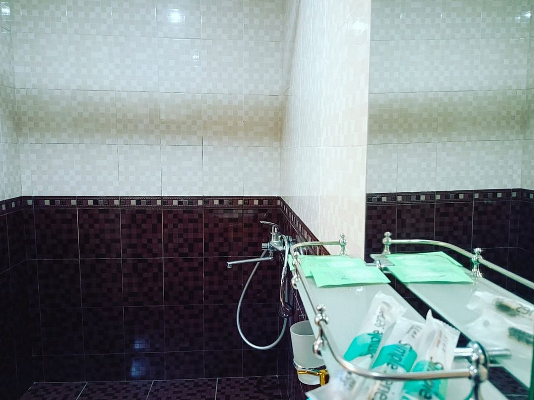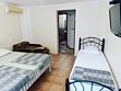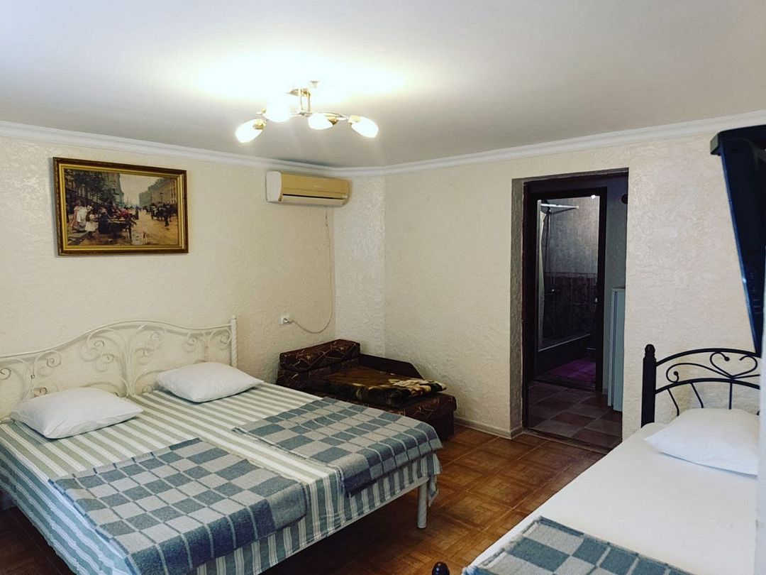 В номере: одна двуспальная и две односпальные кровати. Имеется телевизор, кондиционер, шкаф, вешалка, журнальный столик, холодильник, стулья. Индивидуальная ванная комната: душ, раковина, туалет.