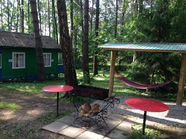В доме: две кровати, тумбочка, вешалка, минимальный набор посуды, 4 стула, холодильник, плита газовая, на веранде стол. Возле каждого домика мангал.