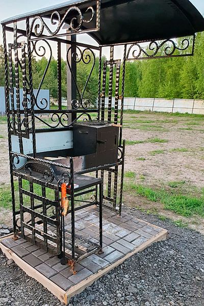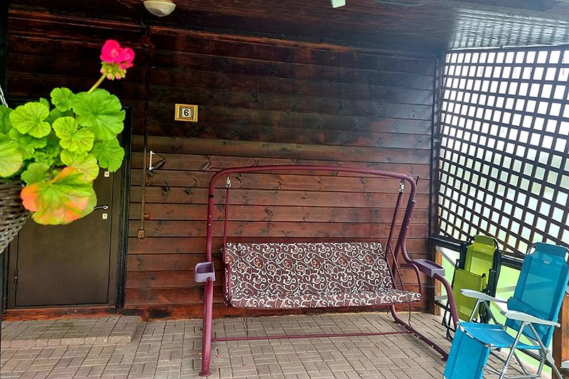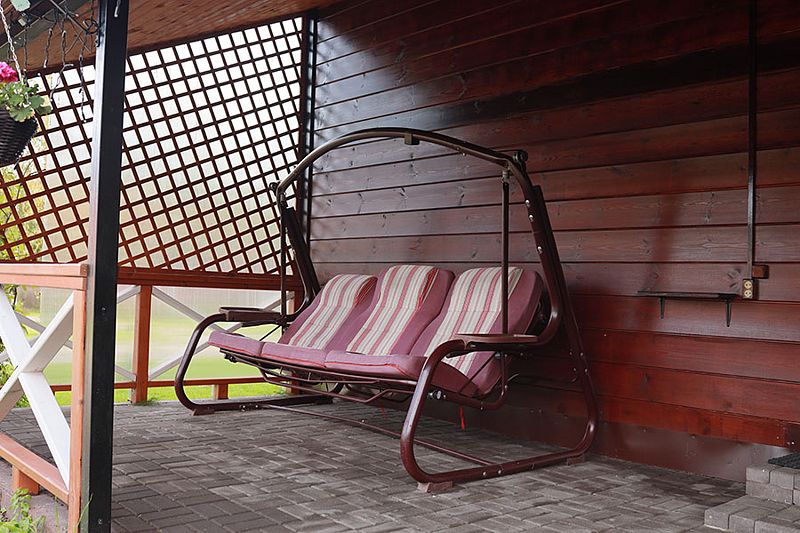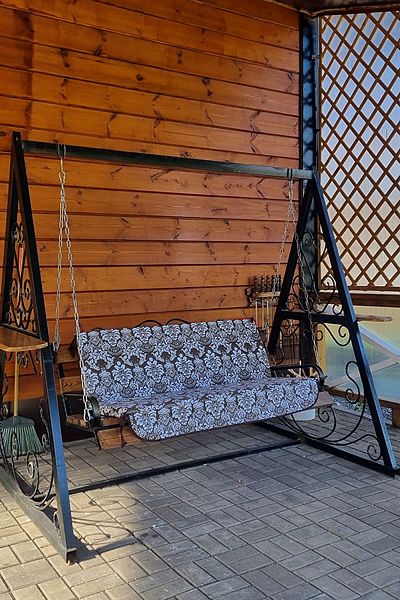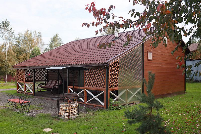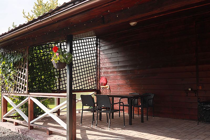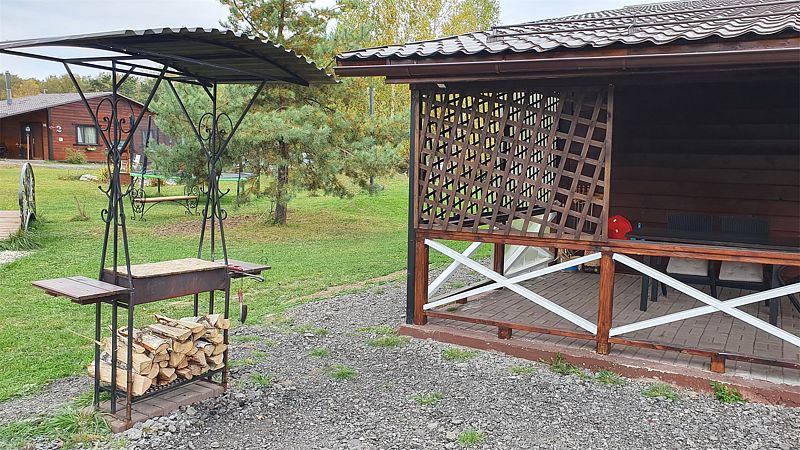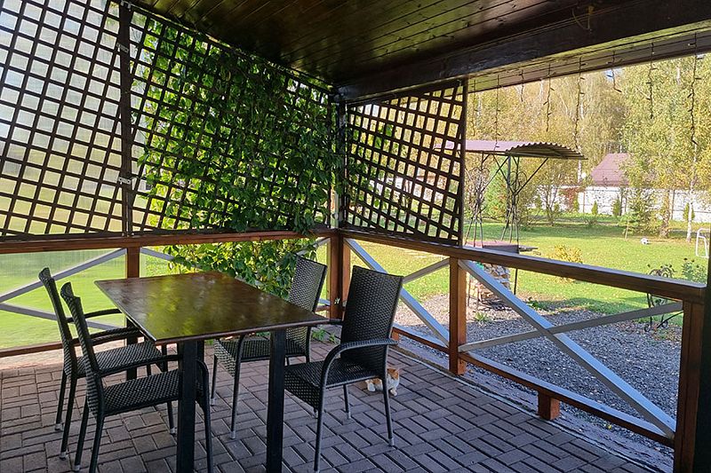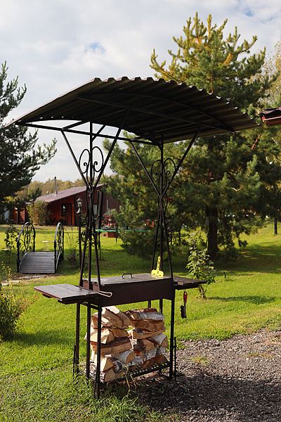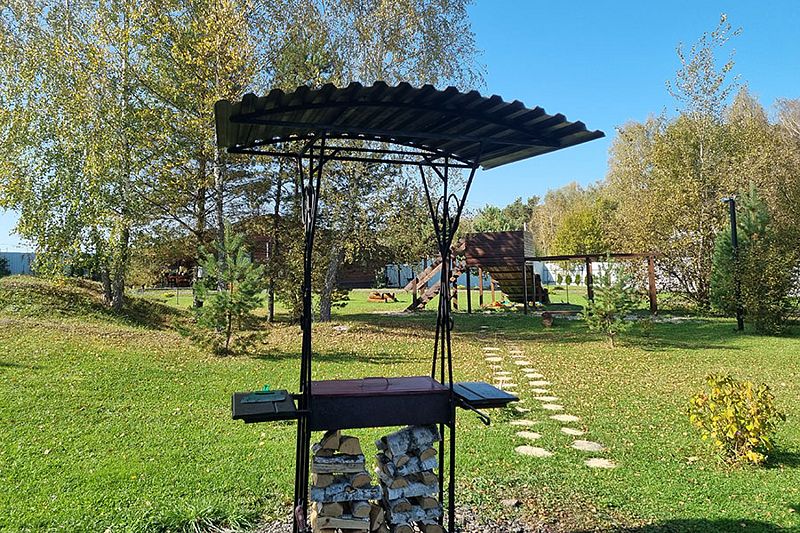 У коттеджа своя крытая терраса и мангальная зона и принадлежности для приготовления шашлыков. Шампура и решетка.