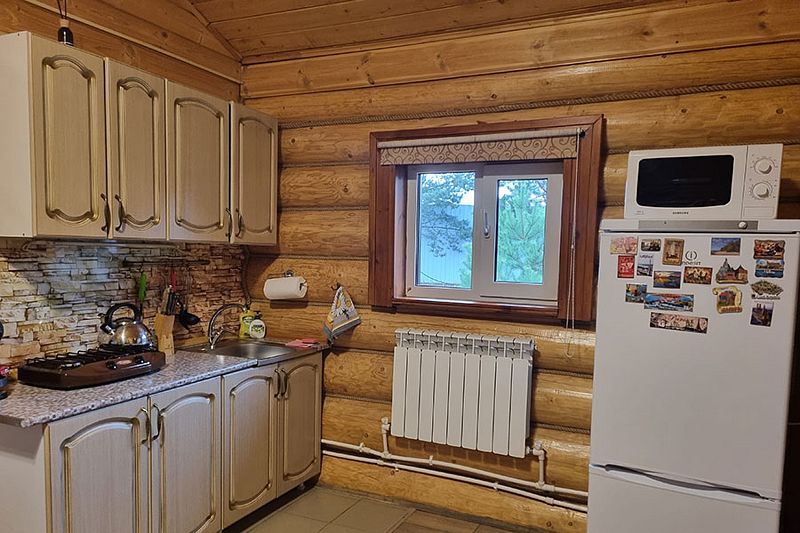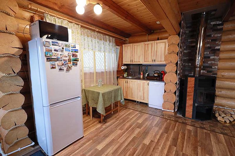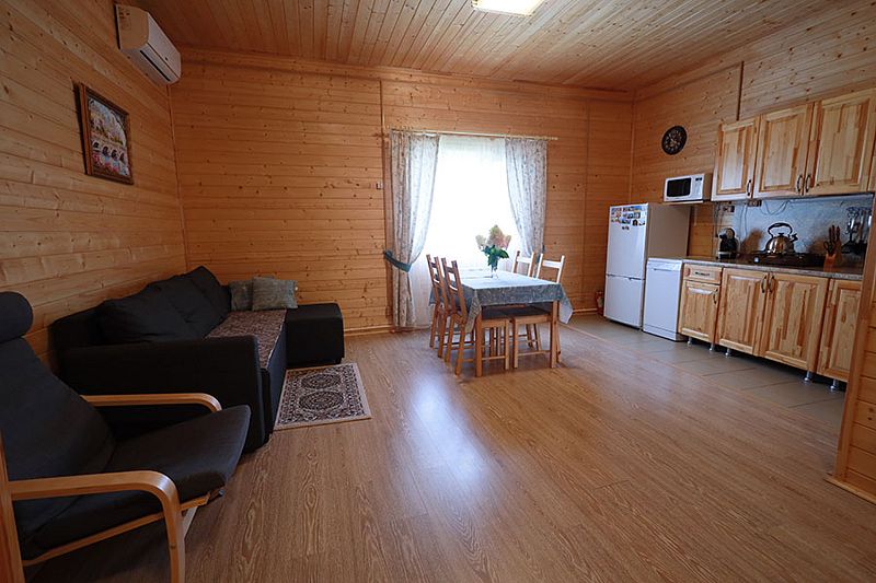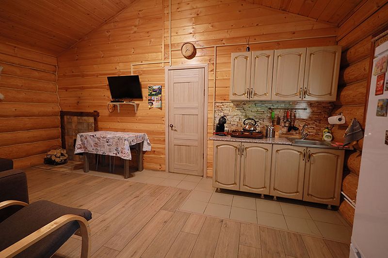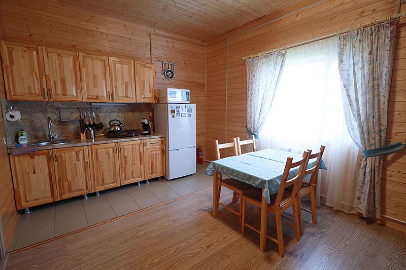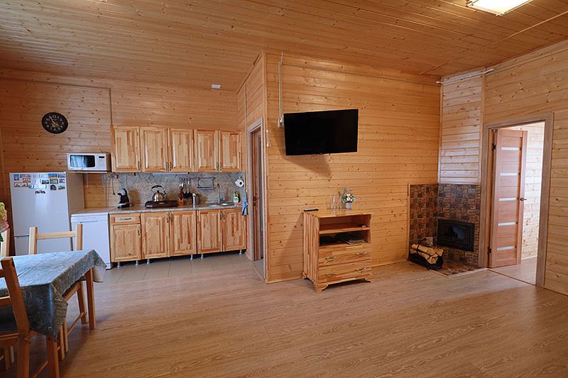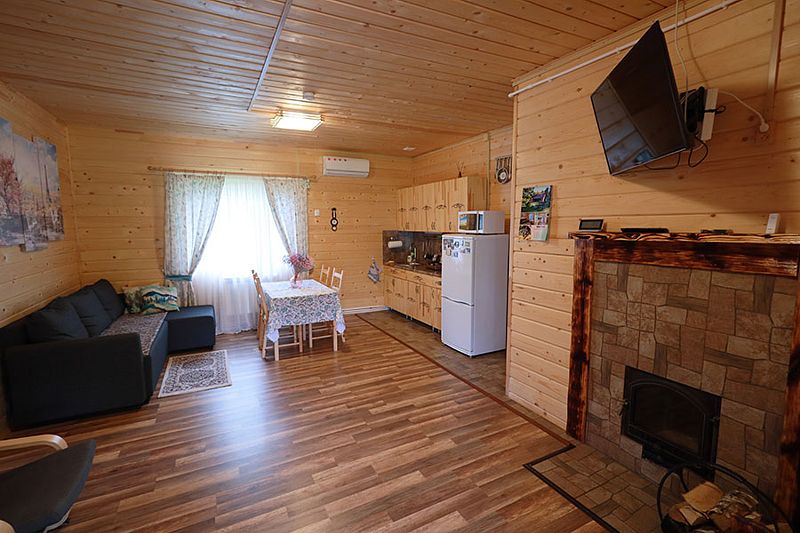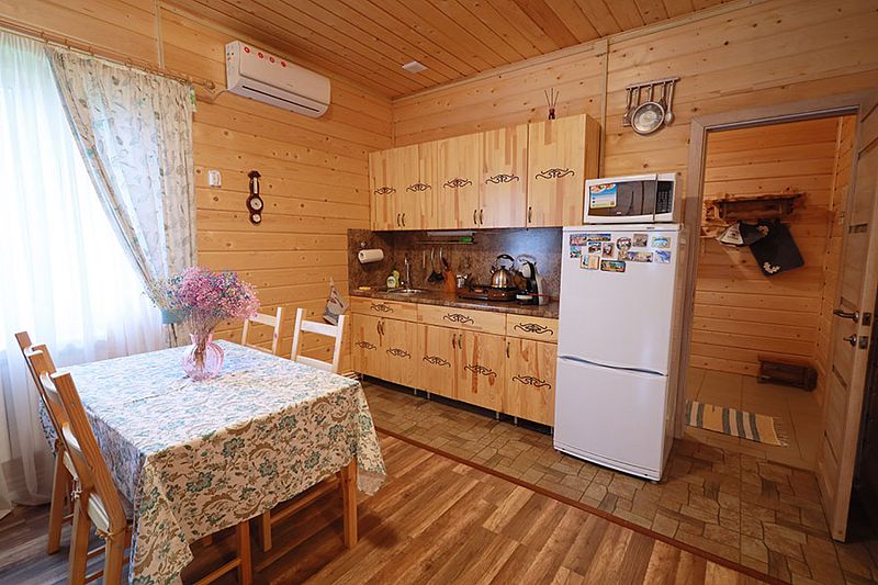 В коттедже портал топки/сауны напоминает камин. Круглогодичное проживание. Кухня оснащена кухонным гарнитуром, мойкой, набором посуды, варочной газовой панелью, холодильником , стиральная машина в тех узле и прочими необходимыми мелочами. Плазменным ТВ с цифровым телевидением. Кондиционер. Отопление. У дома есть своя парковка.