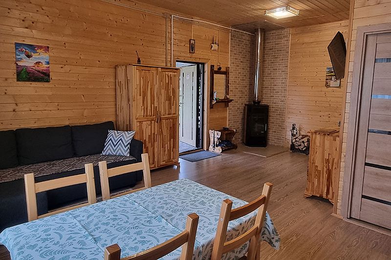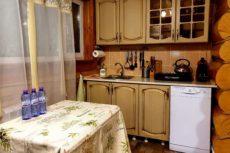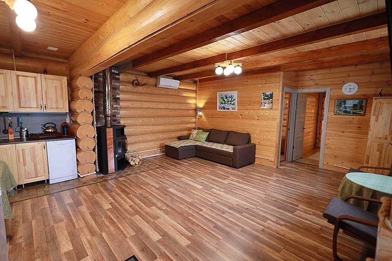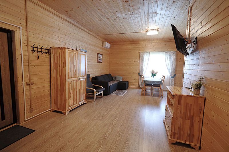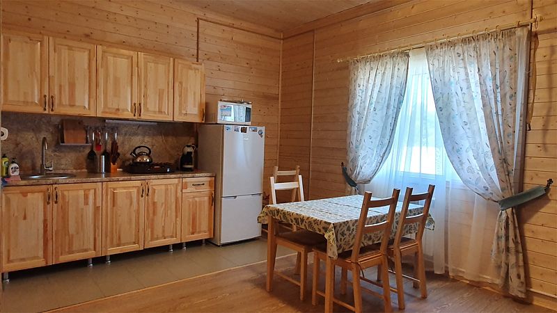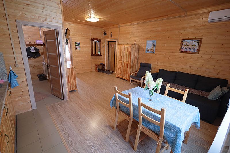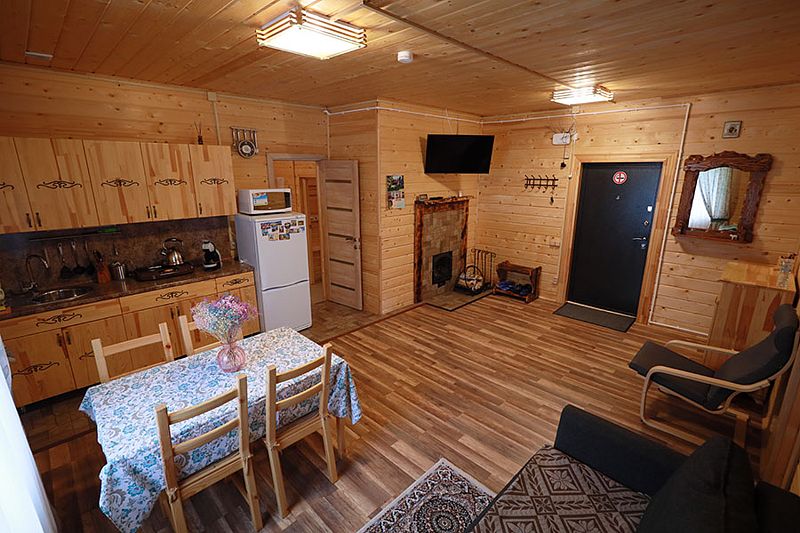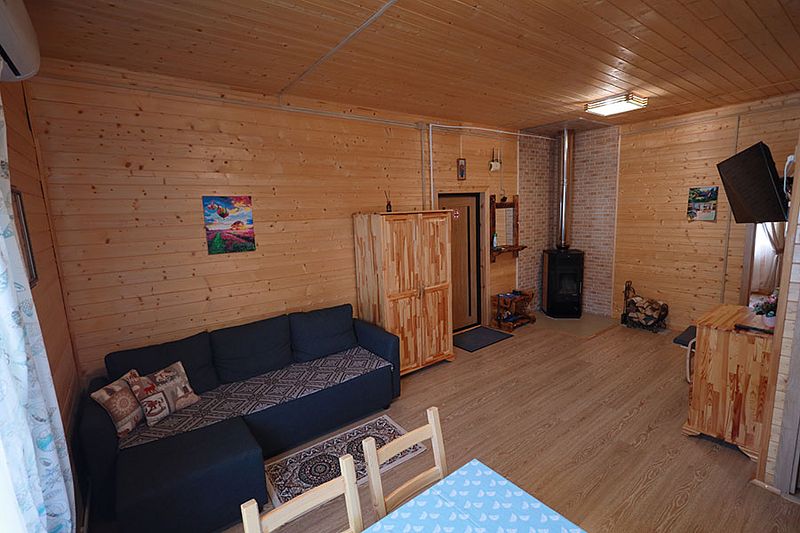 В коттедже портал топки/сауны напоминает камин. Круглогодичное проживание. Кухня оснащена кухонным гарнитуром, мойкой, набором посуды, варочной газовой панелью, холодильником , стиральная машина в тех узле и прочими необходимыми мелочами. Плазменным ТВ с цифровым телевидением. Кондиционер. Отопление. У дома есть своя парковка.