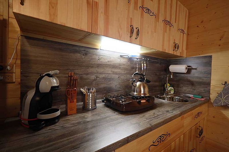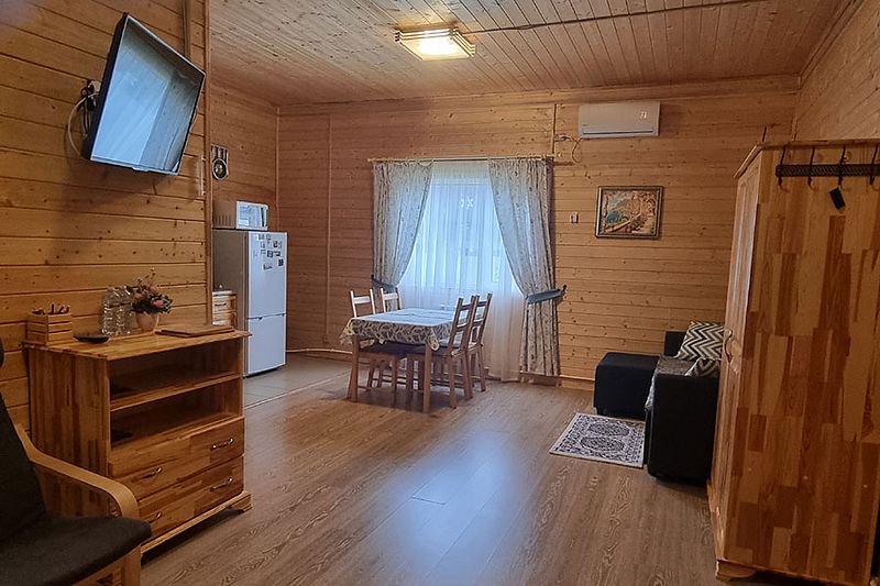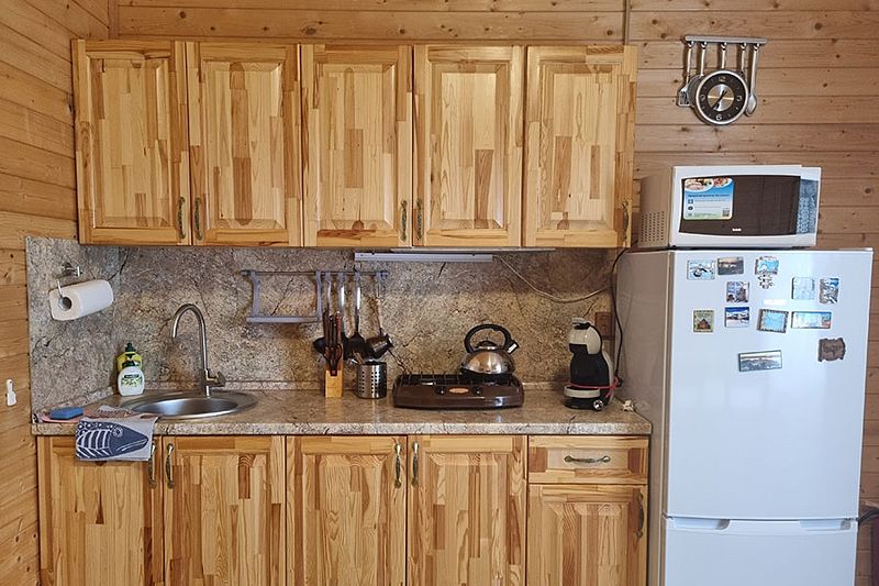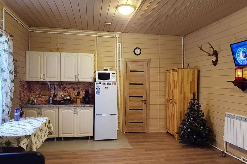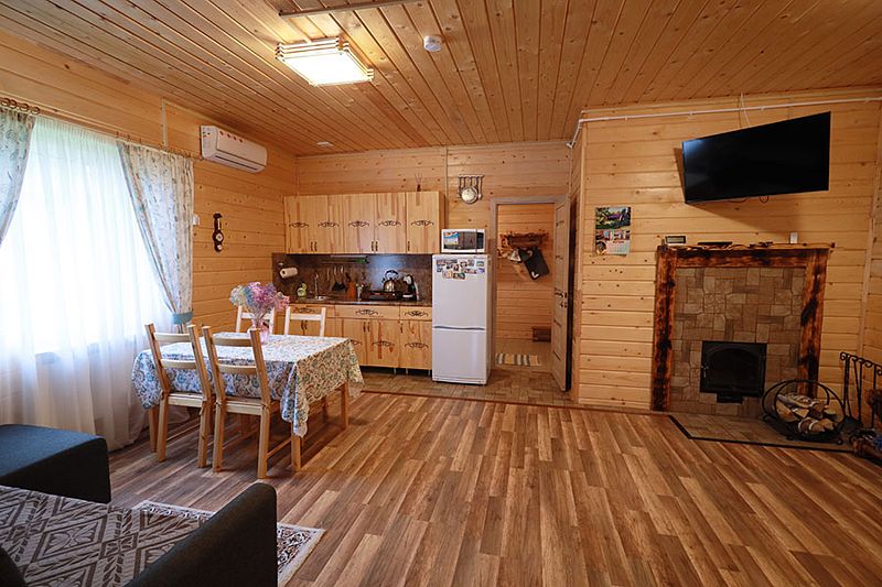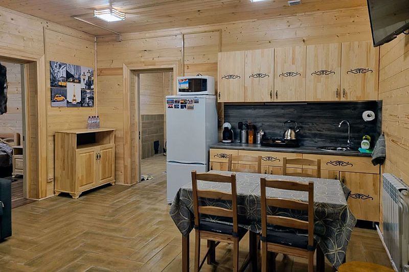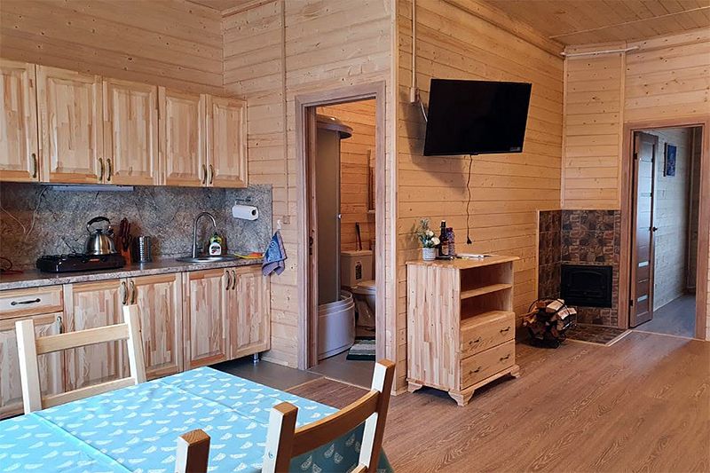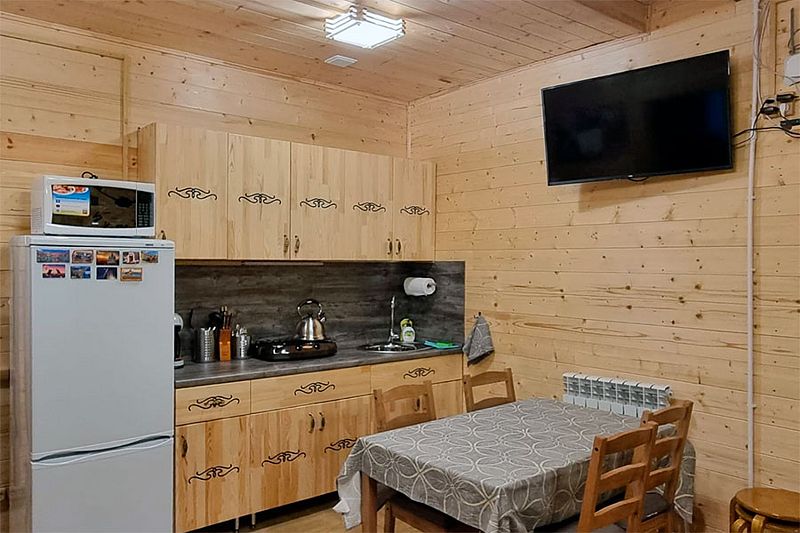 Домики оснащены мангальной зоной и террасой для отдыха. На кухне гости найдут газовую плиту, холодильник, необходимый набор посуды и кофемашину. На свежем воздухе и в номере оборудованы обеденные зоны.