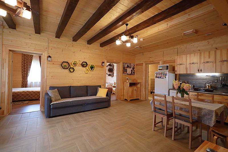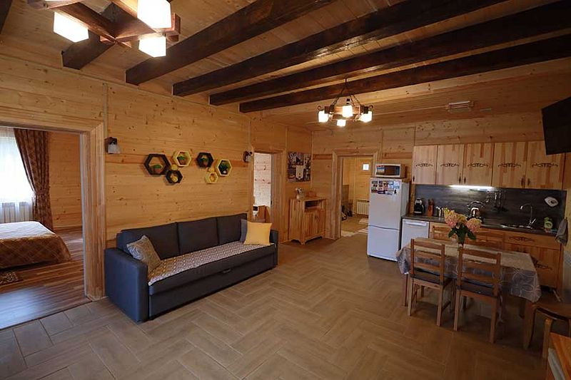 Одна спальня и зал студия с кухней. Просторные. Большая терраса с мебелью и качелями. Укомплектованы всем необходимым для проживания. Отопление, белье, полотенца, тв, интернет, посудомойка, плита, посуда и т.д. Мангал у домика и принадлежности на фото