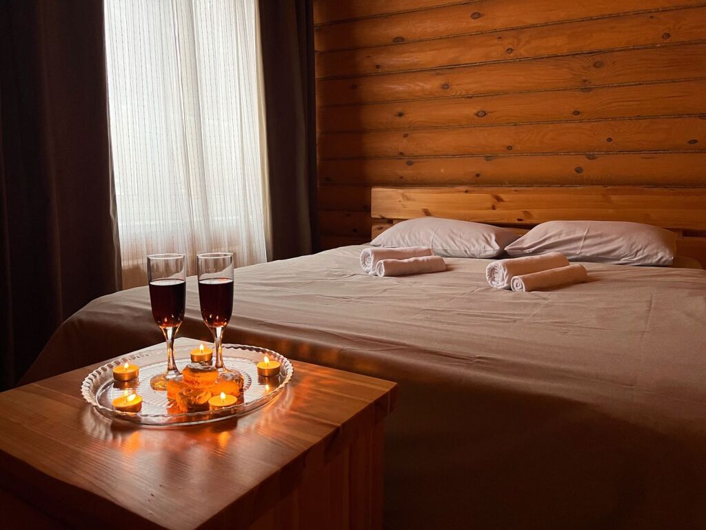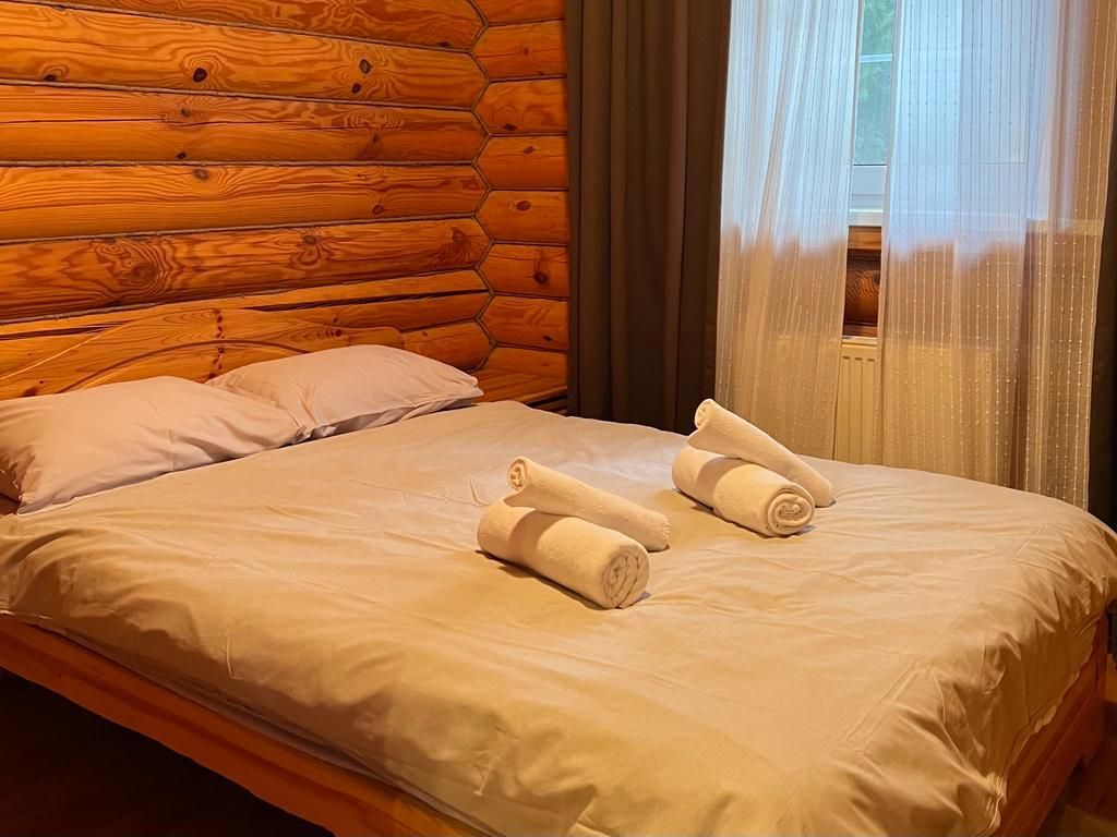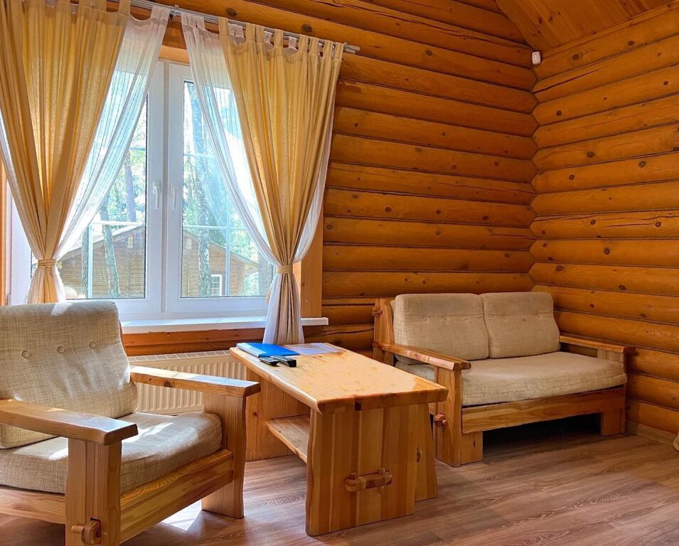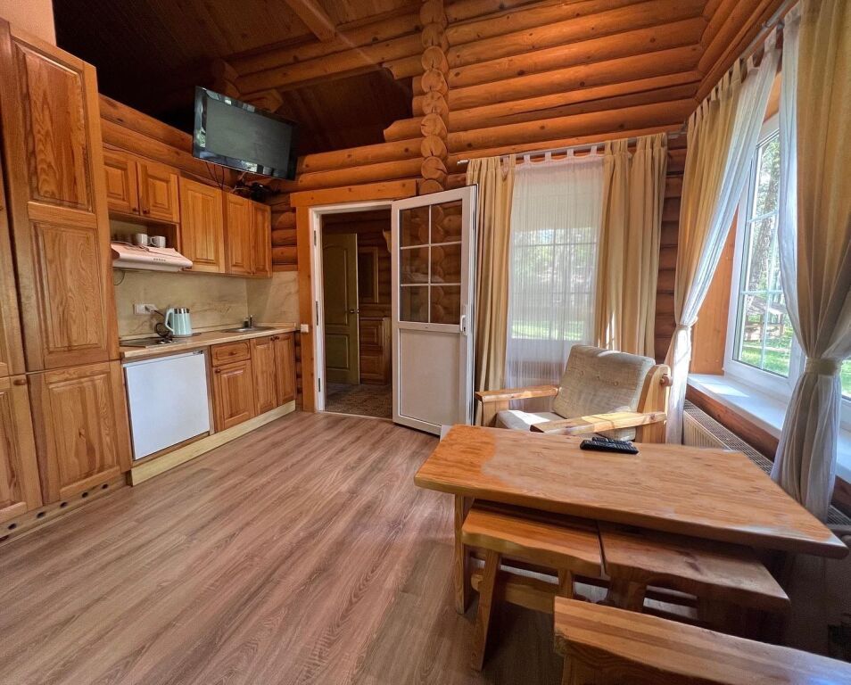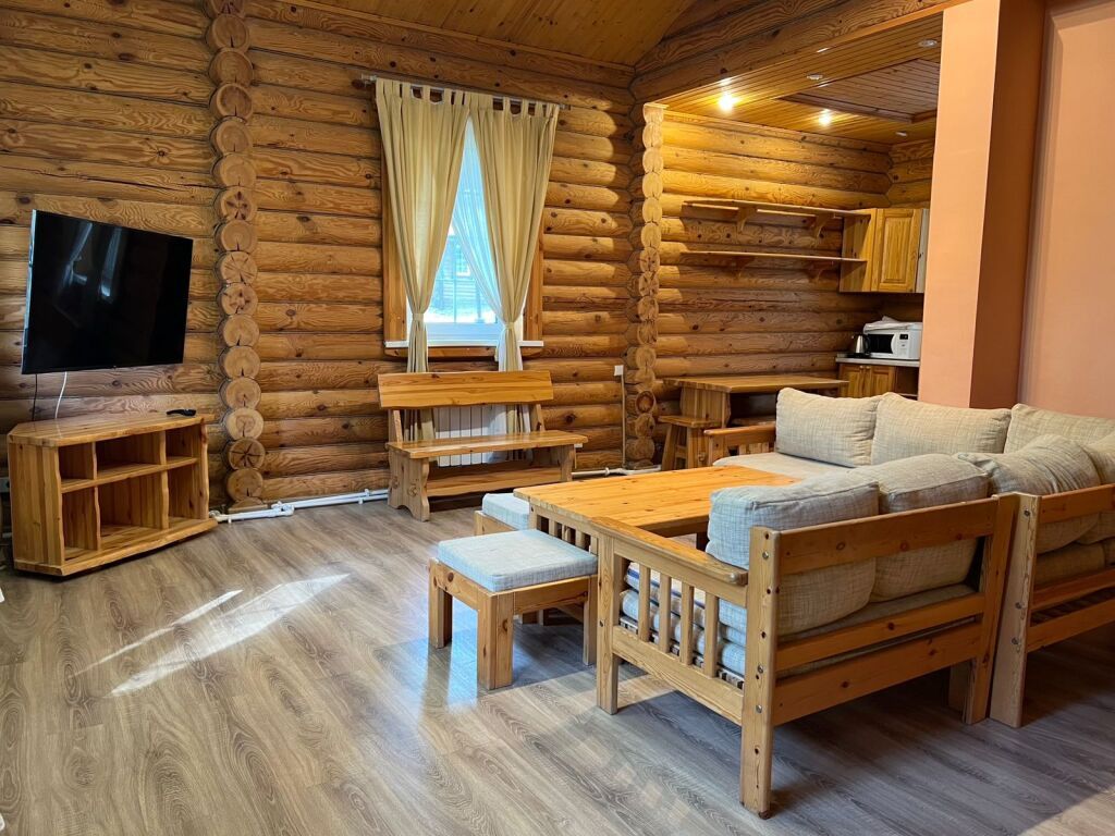 Для проживания во время отдыха - предложены одноэтажные домики-срубы, с кухней, гостиной и отдельными спальнями. Кухня оснащена плитой, холодильником, всеми нужными приборами и посудой. В гостиной расположен угловой диван, есть телевизор, шкаф. В каждом домике оборудована ванная комната. Возле домиков построены беседки, в которых можно устроить семейный пикник, и приготовить шашлык по своему рецепту на уже имеющемся рядом мангале.
