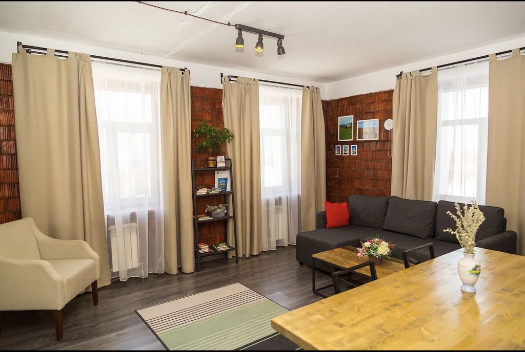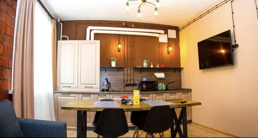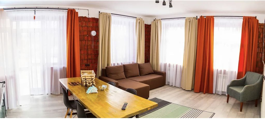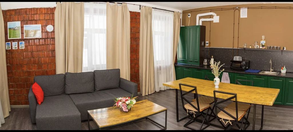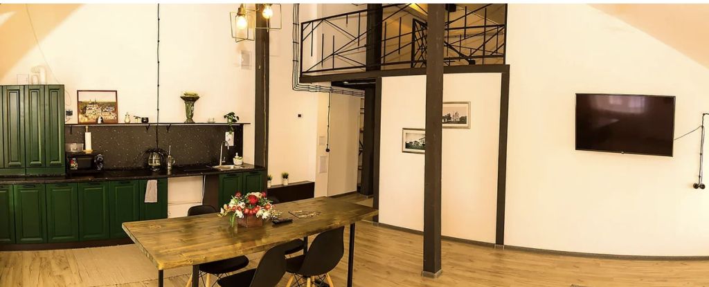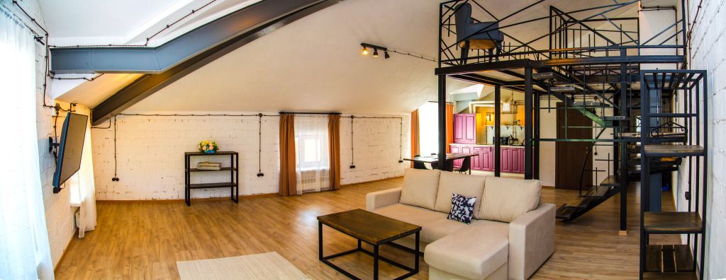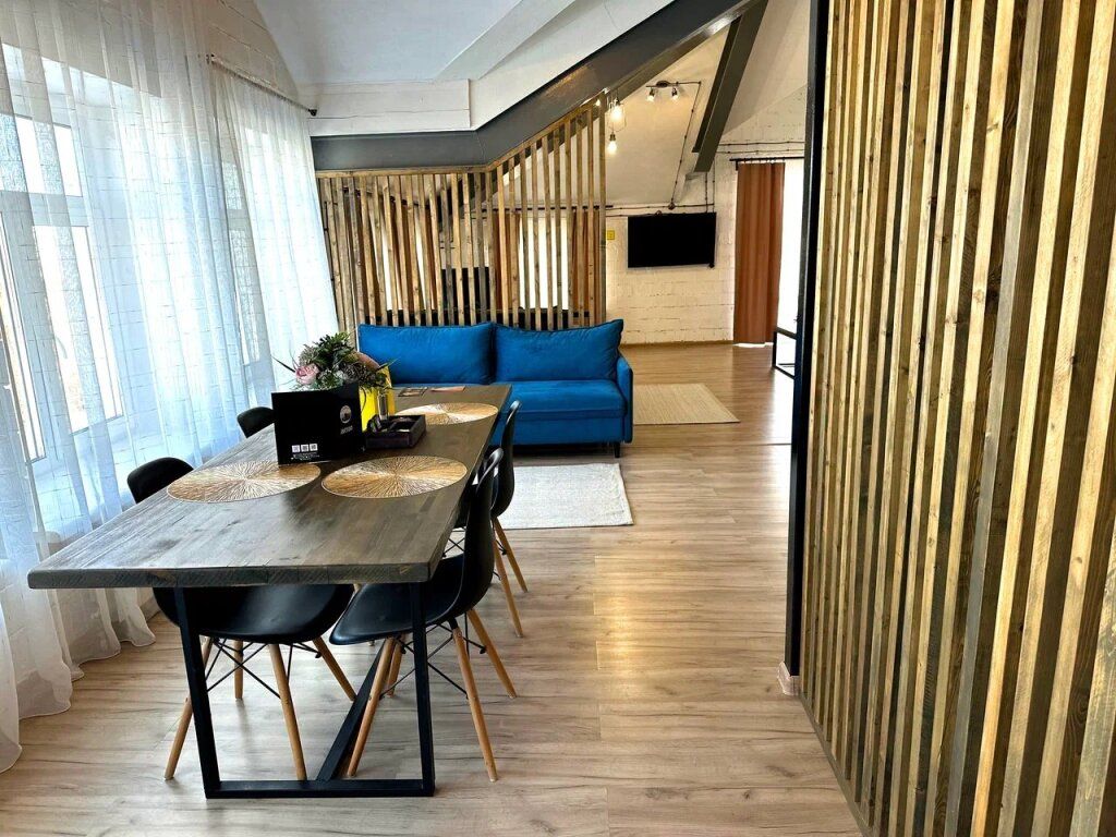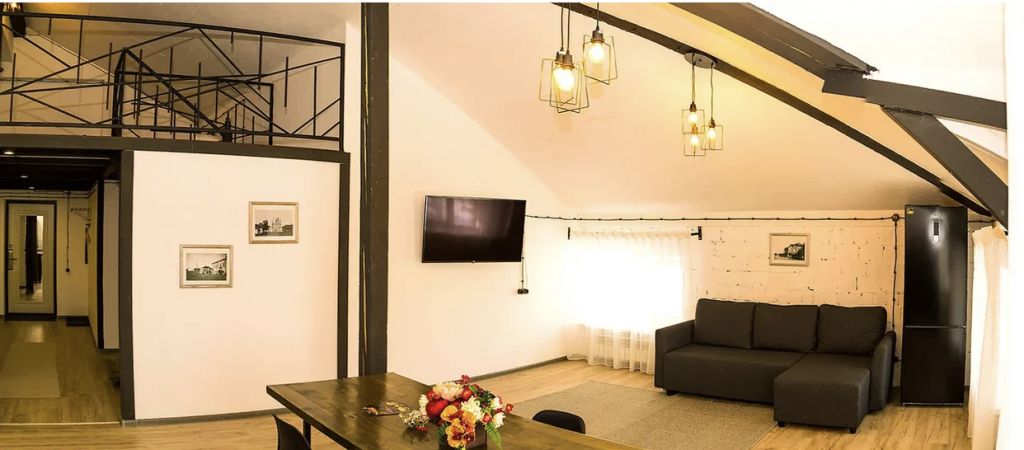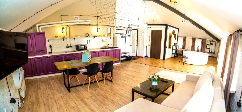 Двухуровневые апартаменты люкс в стиле лофт. На втором этаже открытая спальня с балконом, с которого открывается вид на кухню-гостиную. В спальне - двуспальная кровать 160х200. Отдельная детская спальня с кроваткой-лодкой, односпальным диваном и письменным столом. В апартаментах имеется микроволновая печь, холодильник (полноразмерный), ТВ, индукционная плита, комплект посуды, двухместный диван-кровать, большой обеденный стол. Санузел совмещенный, с ванной. Имеется стиральная машина. Окна этих апартаментов выходят на тихую улицу.Услуги и удобства