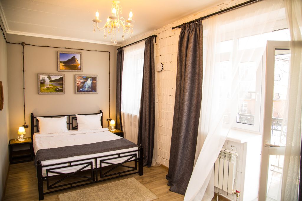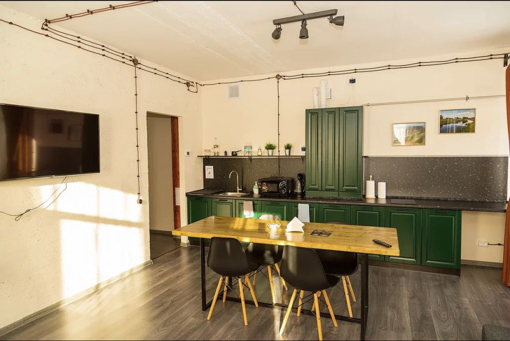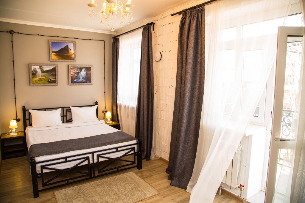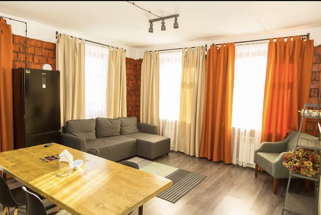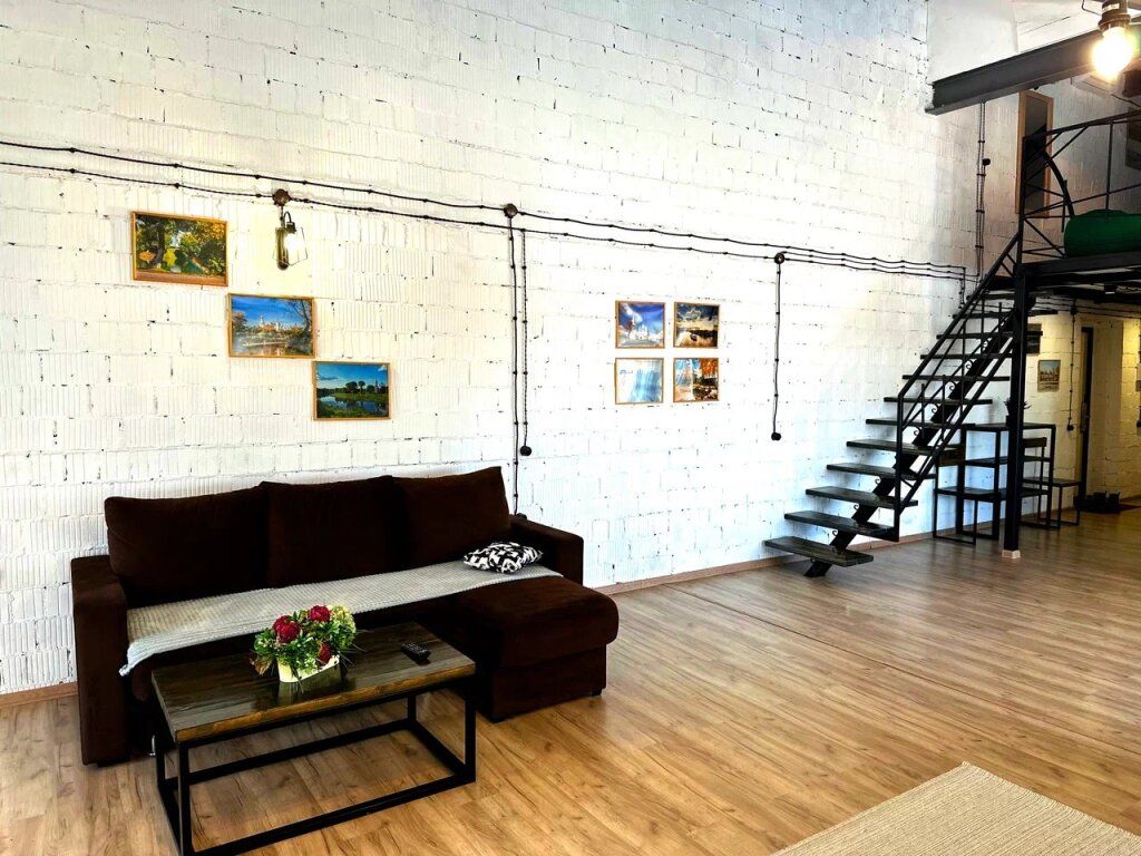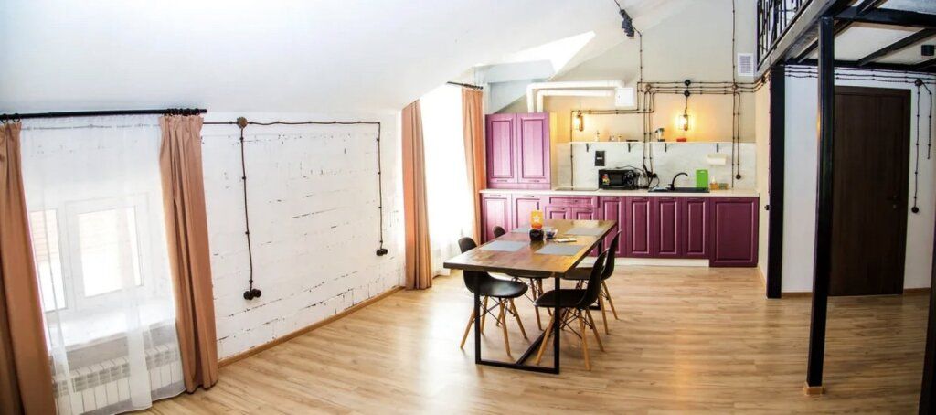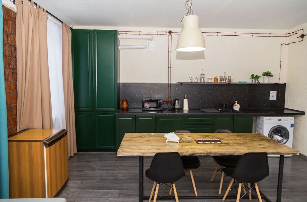 Двухуровневые апартаменты люкс в стиле лофт. На втором этаже открытая спальня с балконом, с которого открывается вид на кухню-гостиную. В спальне - двуспальная кровать 160х200. Отдельная детская спальня с кроваткой-лодкой, односпальным диваном и письменным столом. В апартаментах имеется микроволновая печь, холодильник (полноразмерный), ТВ, индукционная плита, комплект посуды, двухместный диван-кровать, большой обеденный стол. Санузел совмещенный, с ванной. Имеется стиральная машина. Окна этих апартаментов выходят на тихую улицу.Услуги и удобства