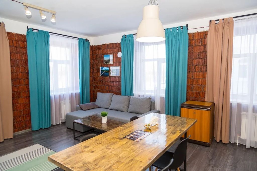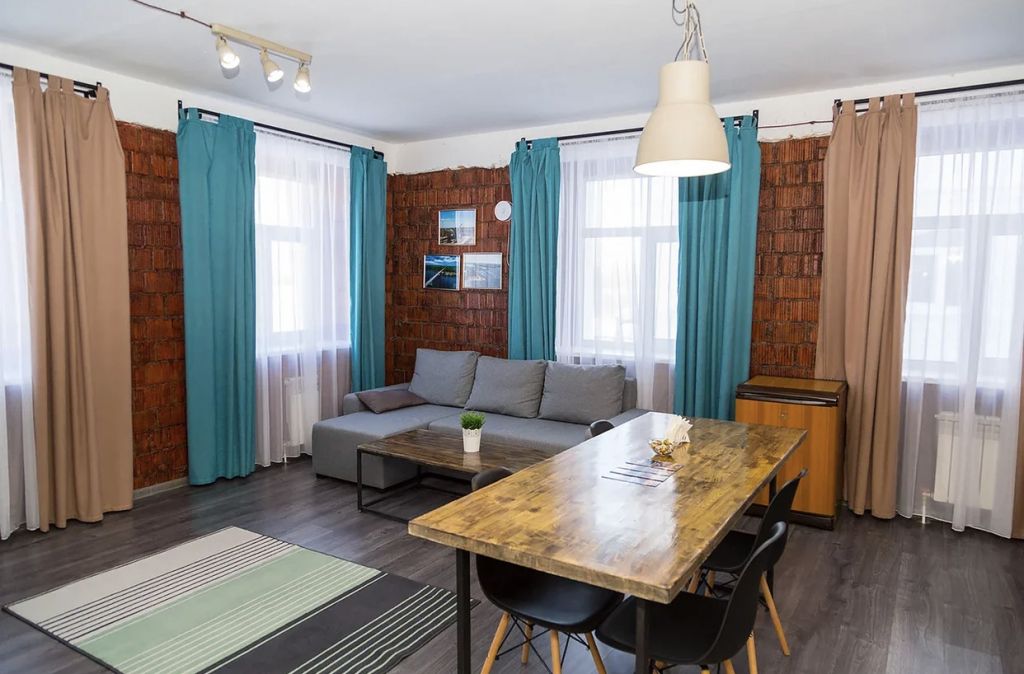 Просторные апартаменты, оформленные в стиле loft. Вид из окон на реку. Без балкона. В апартаментах 2 спальни, кухня-гостиная и собственный санузел (душ). Спальня 1: двуспальная кровать. Спальня 2: 2 односпальные кровати. Кухня-гостиная: двуспальный диван-кровать; холодильник, тв, микроволновая печь, индукционная плита, чайник, посуда, большой обеденный стол. В апартаментах так же есть стиральная машина, сушилка для белья, утюг и гладильная доска. Постельное бельё заправляется по количеству гостей, указанных в брони; полотенца (по 2 штуки на гостя); одноразовые гигиенические принадлежности по количеству гостей. В апартаментах можно пользоваться бесплатным WiFi. Мини-бар платный. В холодильнике лежит прейскурант.Услуги и удобства