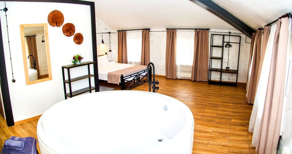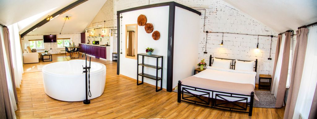 Путешествие с паройПревосходноОтель находится в тихом районе города. Для меня это важно, чтобы не было шумно, так как чутко сплю. Здесь выспалась превосходно. Отдыхали в корпусе 1, номер 7. Номер большой, комфортный. В центре ванна, что придаёт помещению пикантности, можно ванну отделить зонально от кухни ширмой. Вид частично на красивый жилой дом, частично на реку Вологда. Есть все кухонные и ванные принадлежности. Бутылка бесплатной воды была в наличии, главное не перепутать с платным баром в милой коробочке (вода, самогон, чай, пиво) вся техника работала исправно, порадовало бесконтактное заселение и парковка. Не хотелось уезжать, обязательно приедем ещё. Минус только один - завтрак. Такое ощущение, что при шикарном оформлении номеров решили сэкономить на дизайнере в кафе, расположенном в цокольной части помещения, а яичницу, казалось бы, невозможно испортить, однако она была как и все остальные составляющие завтрака не вкусные. В номере была кухня и мы очень пожалели, что не приготовили завтрак самостоятельно. В остальном - полный восторг!!!!
