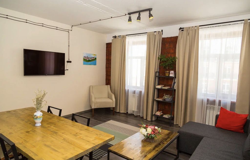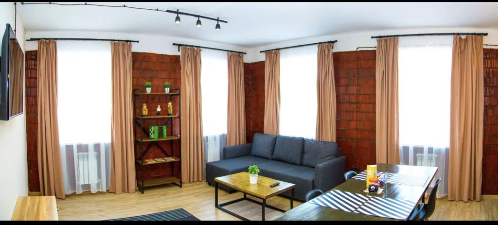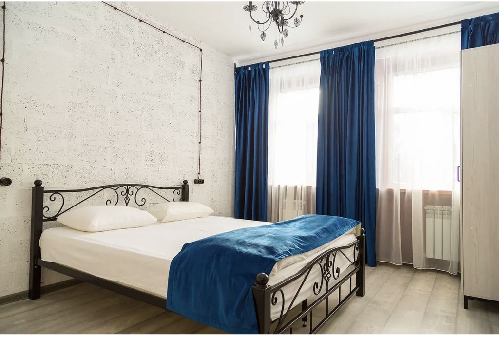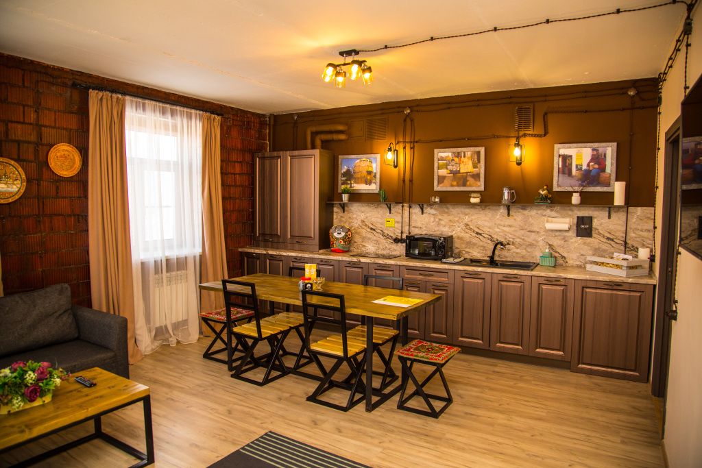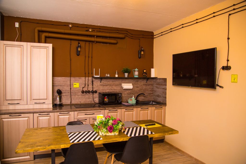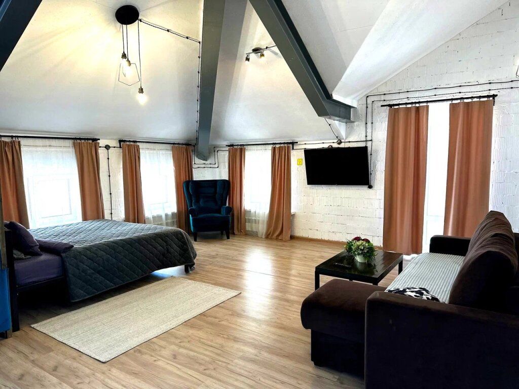 Просторные двухуровневые апартаменты. На втором этаже - двуспальная кровать (160х200), прикроватные тумбы, кондиционер; на первом этаже - двуспальный диван (полноразмерный) и двуспальная кровать (160х200), телевизор. Апартаменты так же имеют собственную кухонную зону и ванную комнату. В зоне кухни-гостиной имеется кухонный гарнитур, большой обеденный стол; кухня оборудована индукционной плитой, холодильником, микроволновой печью и чайником. В апартаментах есть утюг и гладильная доска. В ванной комнате имеется фен, халаты и необходимые одноразовые гигиенические принадлежности. Постельное белье в апартаментах заправляется по количеству гостей в брони. Полотенца так же предоставляются по 2 на гостя; есть одноразовые тапочки. В номере бесплатный wifi.Услуги и удобства