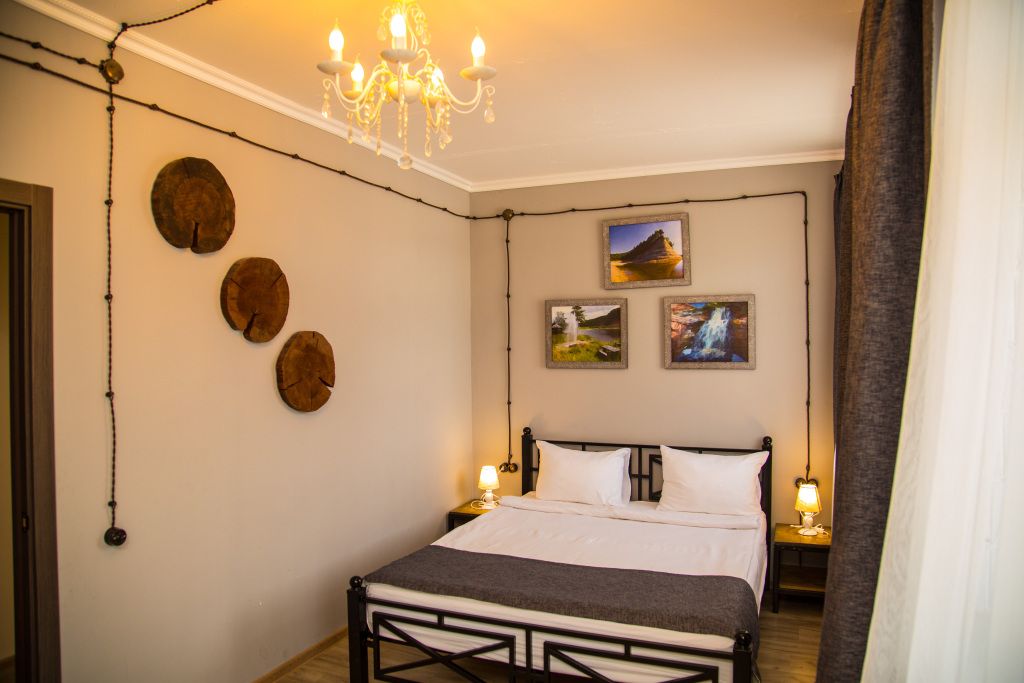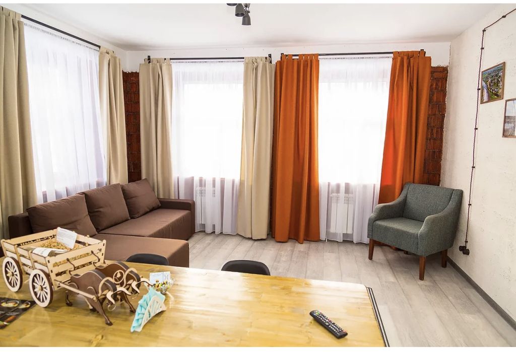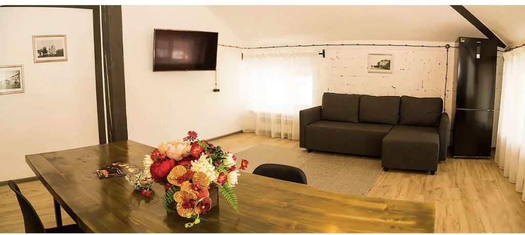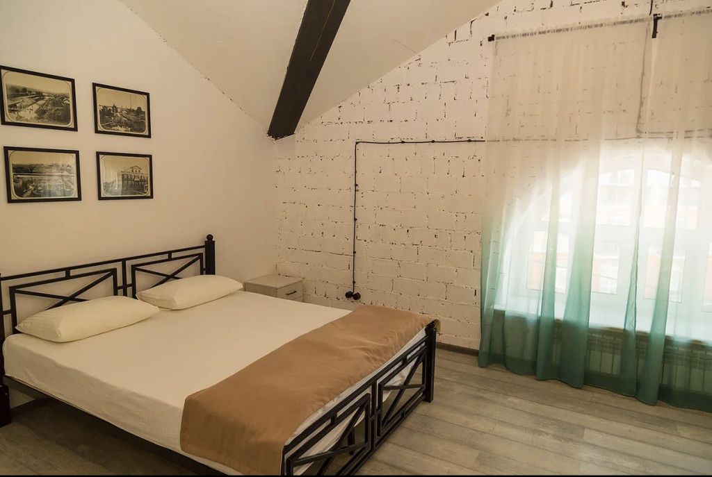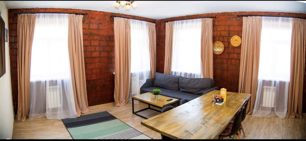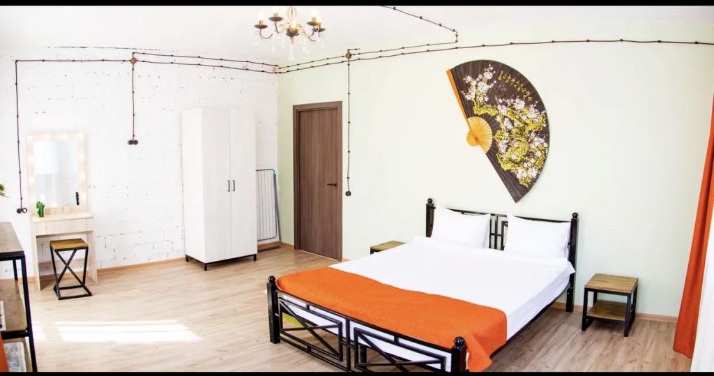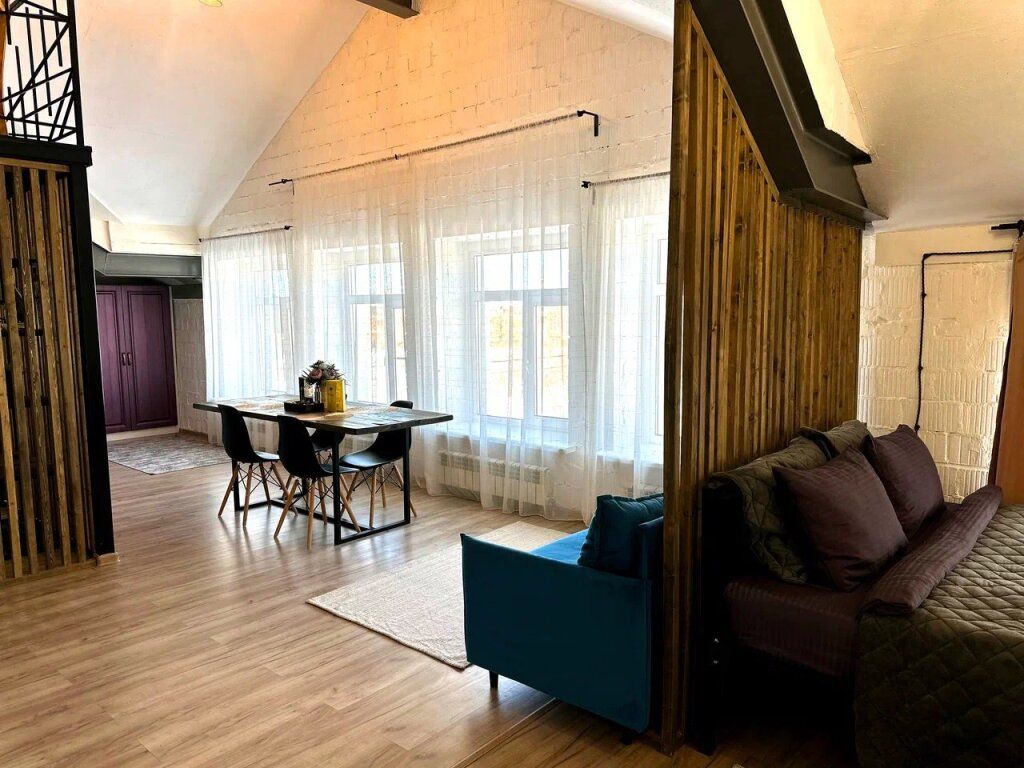 Просторные двухуровневые апартаменты. На втором этаже - двуспальная кровать (160х200), прикроватные тумбы, кондиционер; на первом этаже - двуспальный диван (полноразмерный) и двуспальная кровать (160х200), телевизор. Апартаменты так же имеют собственную кухонную зону и ванную комнату. В зоне кухни-гостиной имеется кухонный гарнитур, большой обеденный стол; кухня оборудована индукционной плитой, холодильником, микроволновой печью и чайником. В апартаментах есть утюг и гладильная доска. В ванной комнате имеется фен, халаты и необходимые одноразовые гигиенические принадлежности. Постельное белье в апартаментах заправляется по количеству гостей в брони. Полотенца так же предоставляются по 2 на гостя; есть одноразовые тапочки. В номере бесплатный wifi.Услуги и удобства