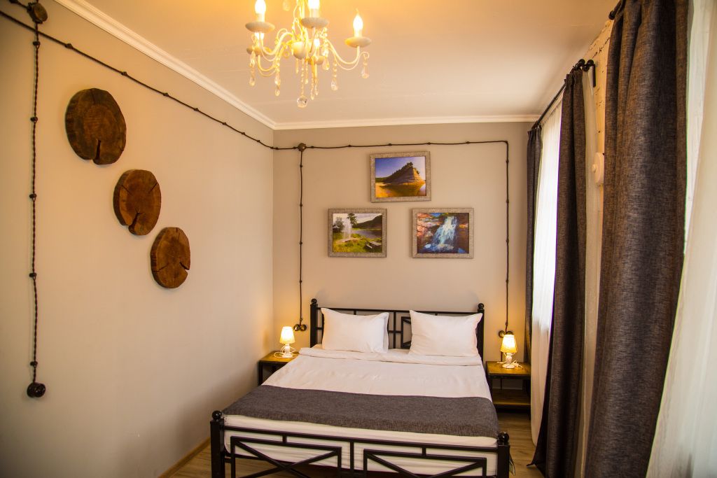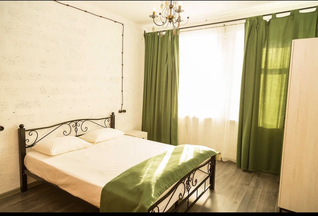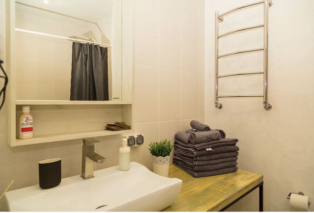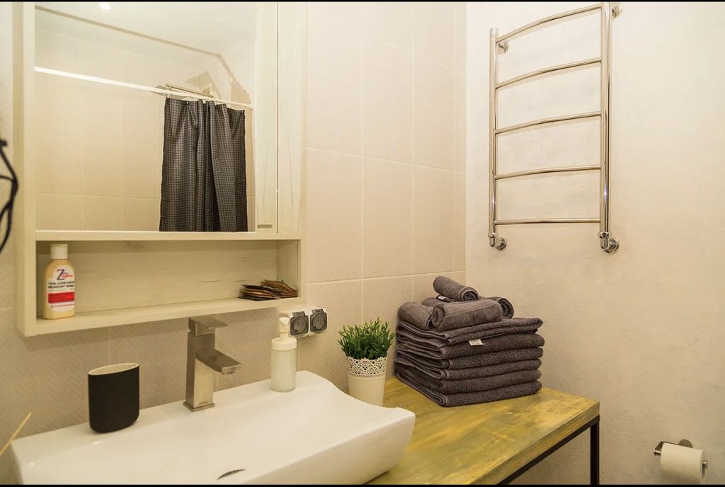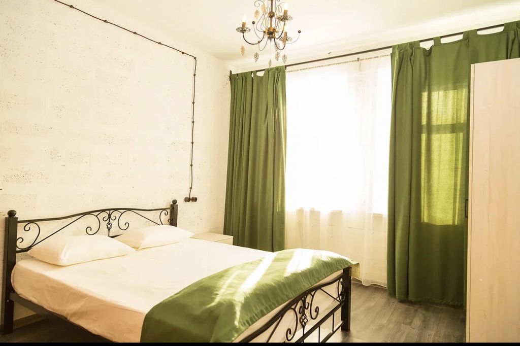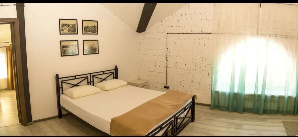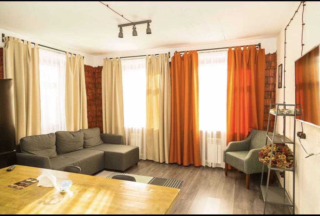Просторные двухуровневые апартаменты. На втором этаже - двуспальная кровать (160х200), прикроватные тумбы, кондиционер; на первом этаже - двуспальный диван (полноразмерный) и двуспальная кровать (160х200), телевизор. Апартаменты так же имеют собственную кухонную зону и ванную комнату. В зоне кухни-гостиной имеется кухонный гарнитур, большой обеденный стол; кухня оборудована индукционной плитой, холодильником, микроволновой печью и чайником. В апартаментах есть утюг и гладильная доска. В ванной комнате имеется фен, халаты и необходимые одноразовые гигиенические принадлежности. Постельное белье в апартаментах заправляется по количеству гостей в брони. Полотенца так же предоставляются по 2 на гостя; есть одноразовые тапочки. В номере бесплатный wifi.Услуги и удобства