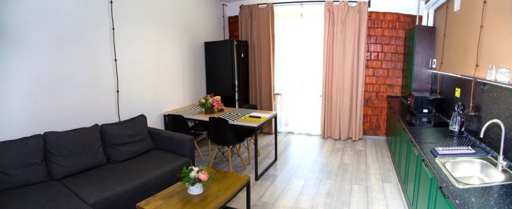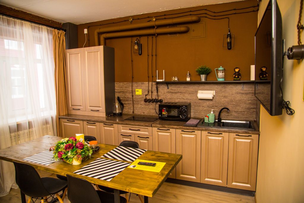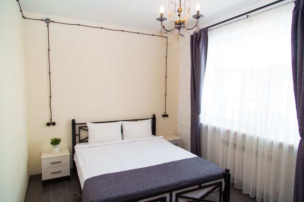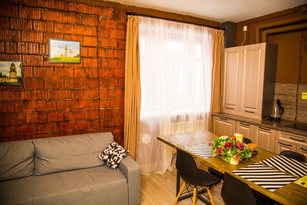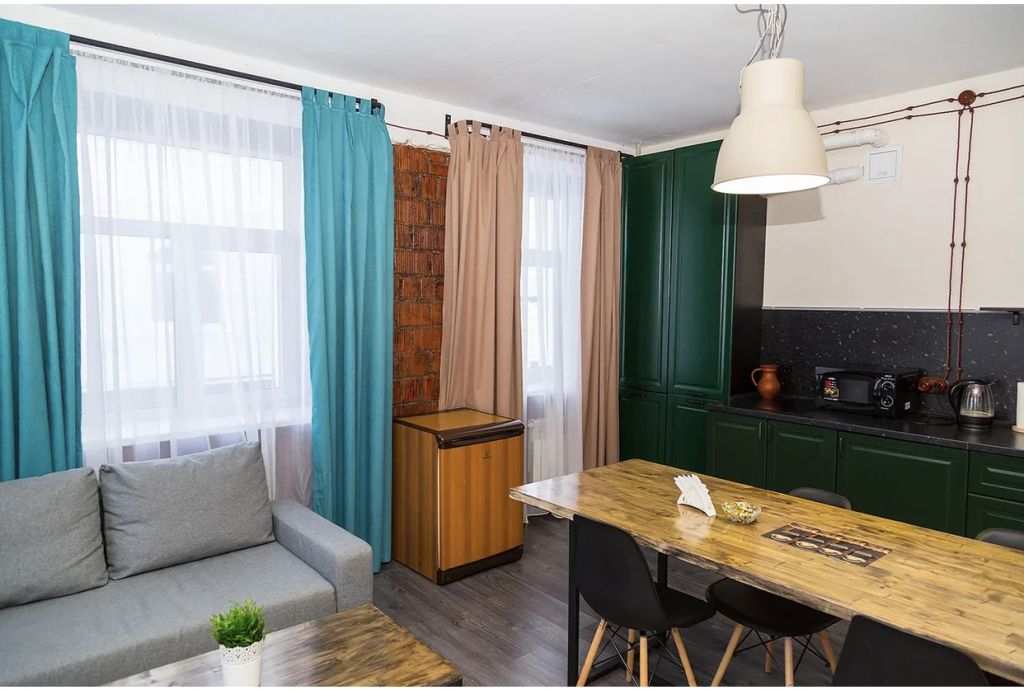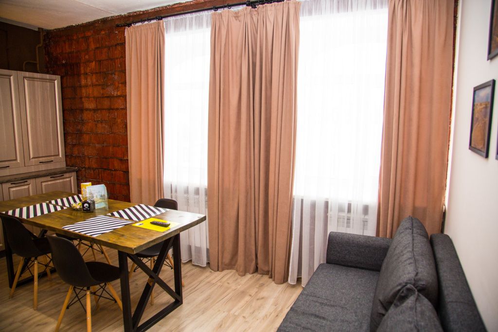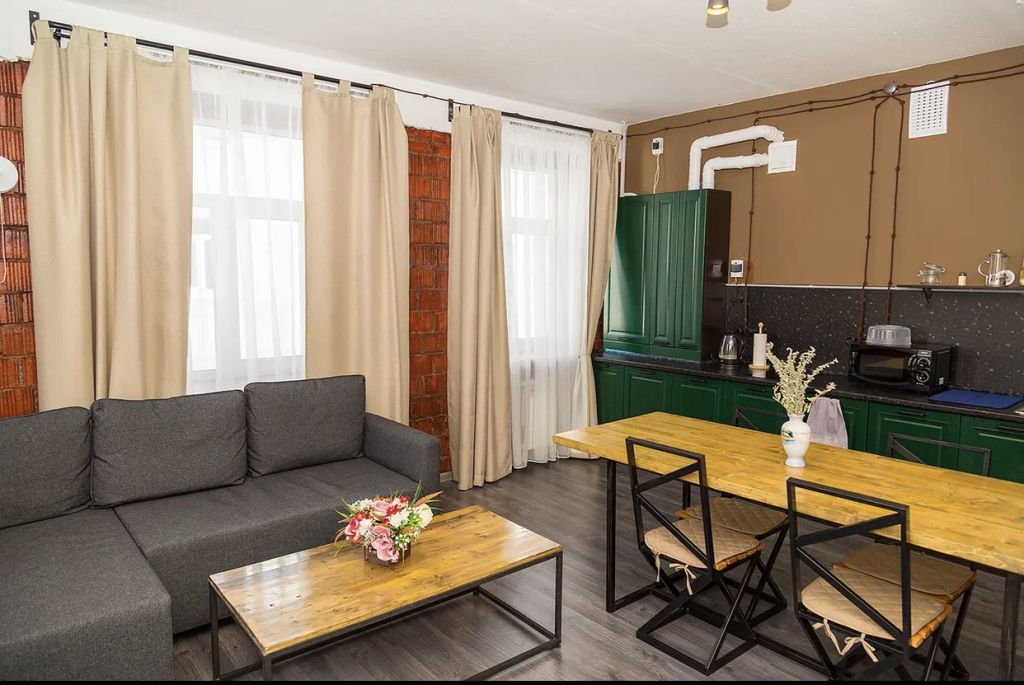 Апартаменты в стиле Loft на первом этаже с балконом. В апартаментах 2 спальни и кухня-гостиная. Спальня 1: 2 односпальные кровати (90х200), прикроватная тумба, открытый гардероб; спальня 2: двуспальная кровать (160х200), кресло, туалетный столик; кухня-гостиная - раскладной двуспальный диван, ТВ. В апартаментах есть все необходимое для проживания: холодильник (маленький); микроволновая печь; индукционная плита; стиральная машина; утюг; гладильная доска; сушилка для белья, чайник и бесплатный wifi. На кухне комплект посуды. Спальные места заправляются постельным бельём по количеству гостей в брони. На каждого гостя предоставляется комплект полотенец (большое и маленькое); одноразовые тапочки и одноразовые средства личной гигиены. Мини-бар платный.Услуги и удобства