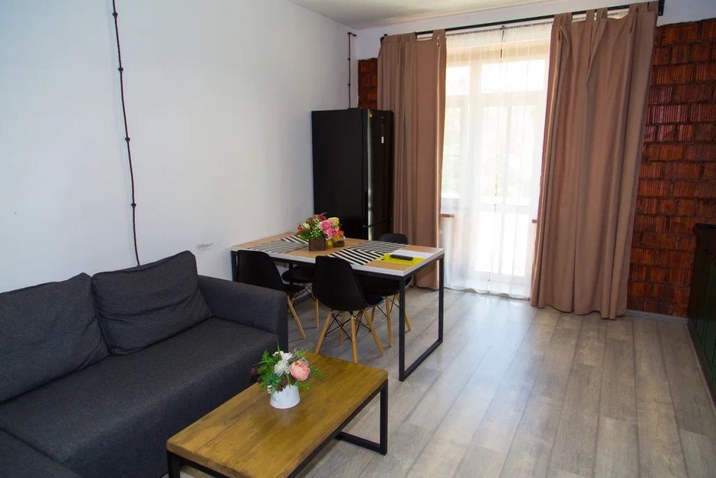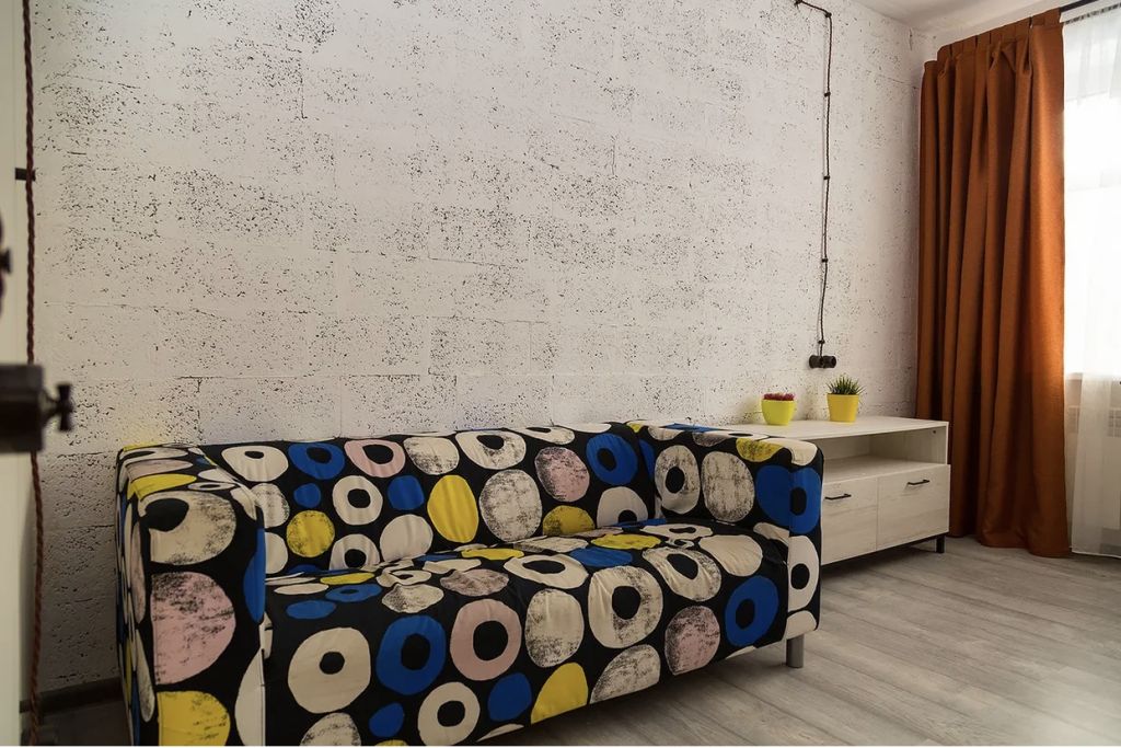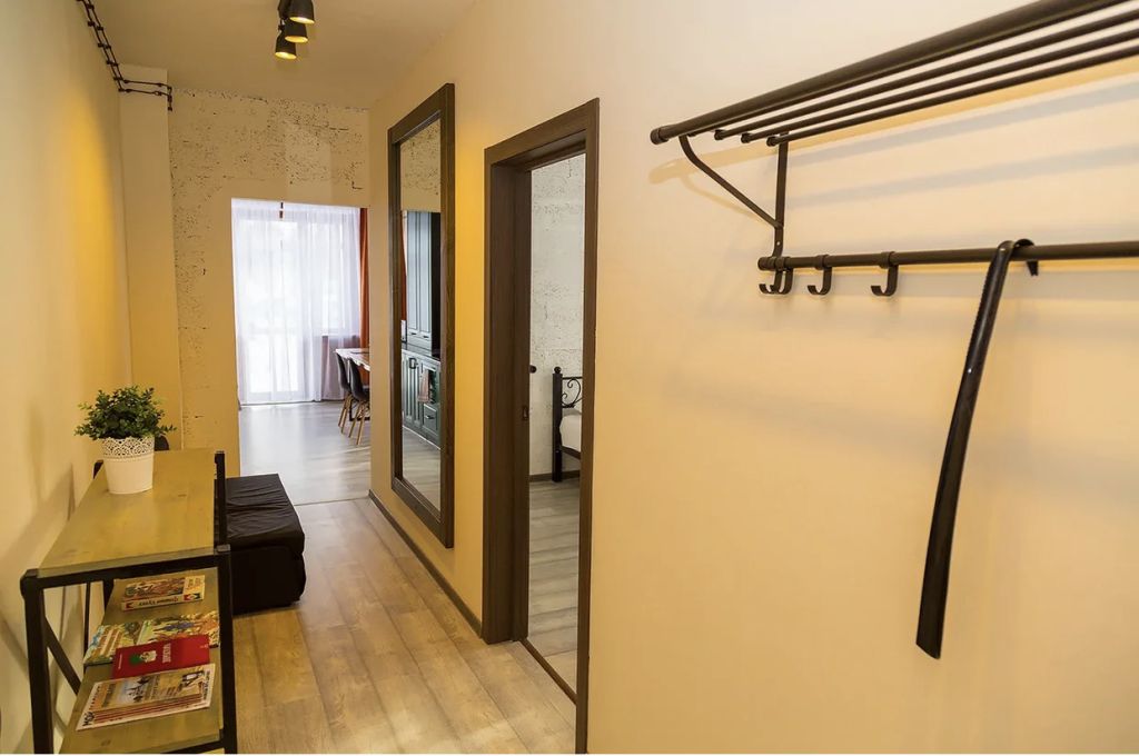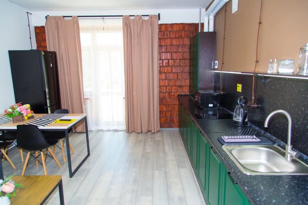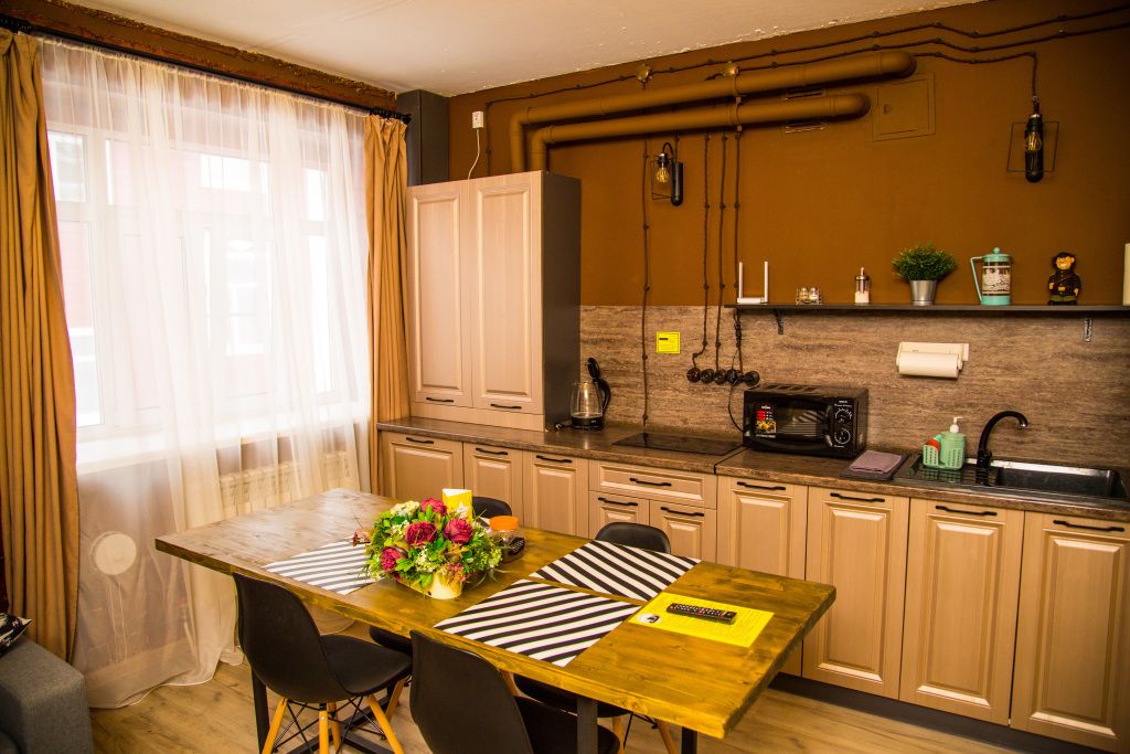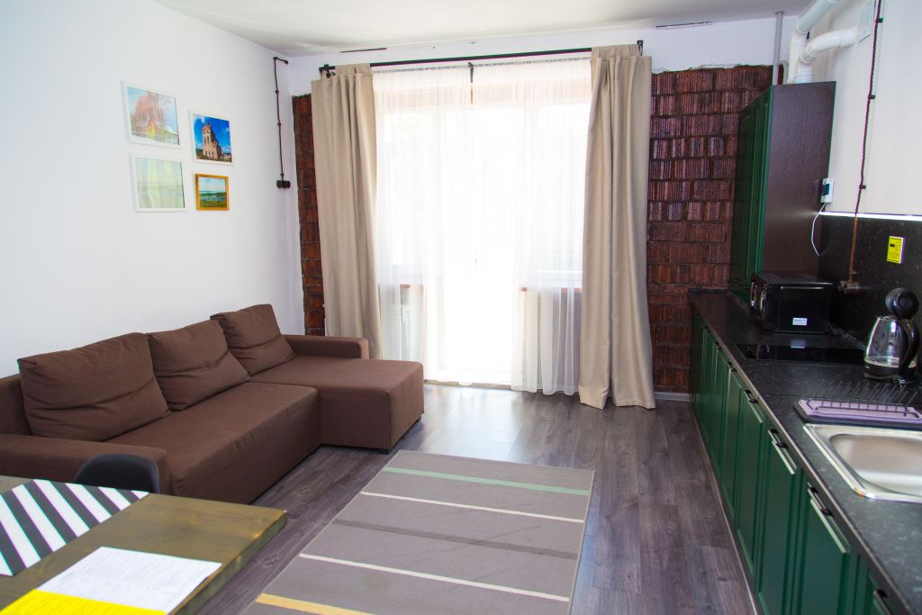 Апартаменты в стиле Loft на первом этаже с балконом. В апартаментах 2 спальни и кухня-гостиная. Спальня 1: 2 односпальные кровати (90х200), прикроватная тумба, открытый гардероб; спальня 2: двуспальная кровать (160х200), кресло, туалетный столик; кухня-гостиная - раскладной двуспальный диван, ТВ. В апартаментах есть все необходимое для проживания: холодильник (маленький); микроволновая печь; индукционная плита; стиральная машина; утюг; гладильная доска; сушилка для белья, чайник и бесплатный wifi. На кухне комплект посуды. Спальные места заправляются постельным бельём по количеству гостей в брони. На каждого гостя предоставляется комплект полотенец (большое и маленькое); одноразовые тапочки и одноразовые средства личной гигиены. Мини-бар платный.Услуги и удобства