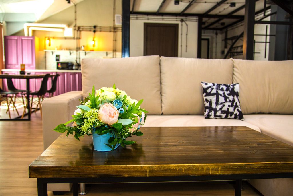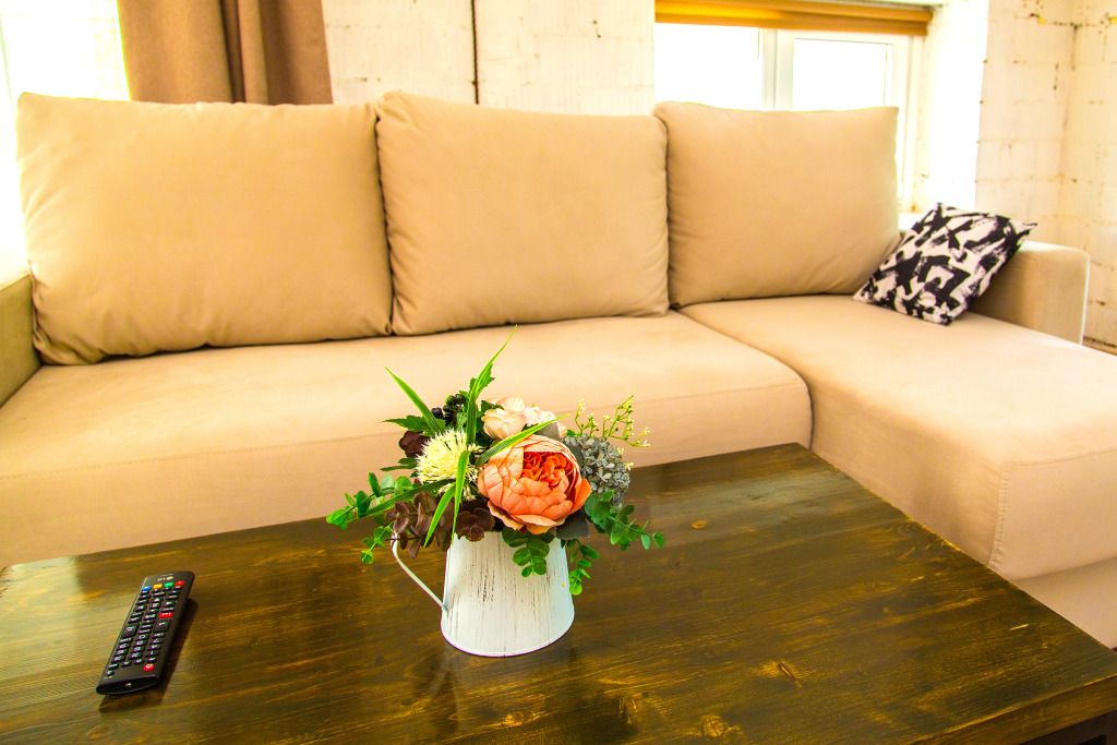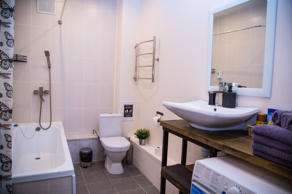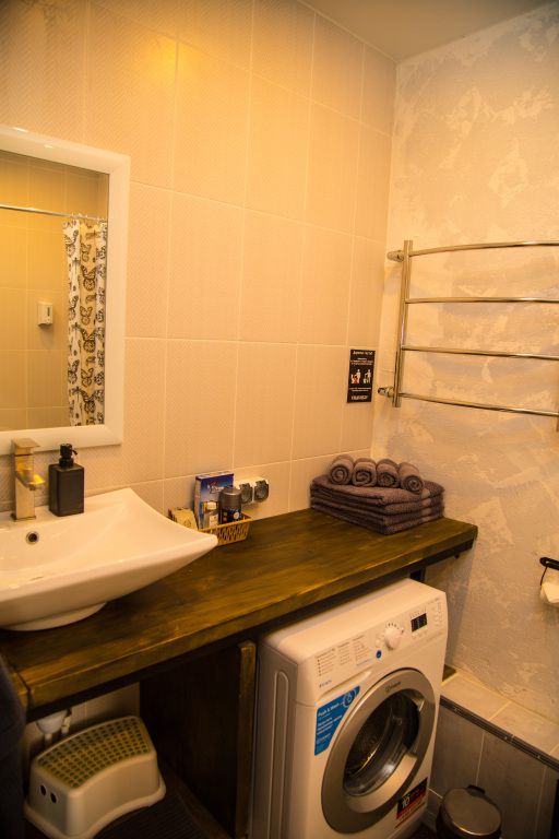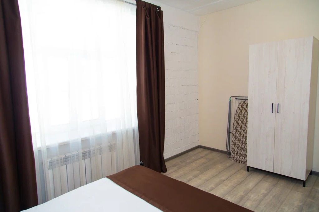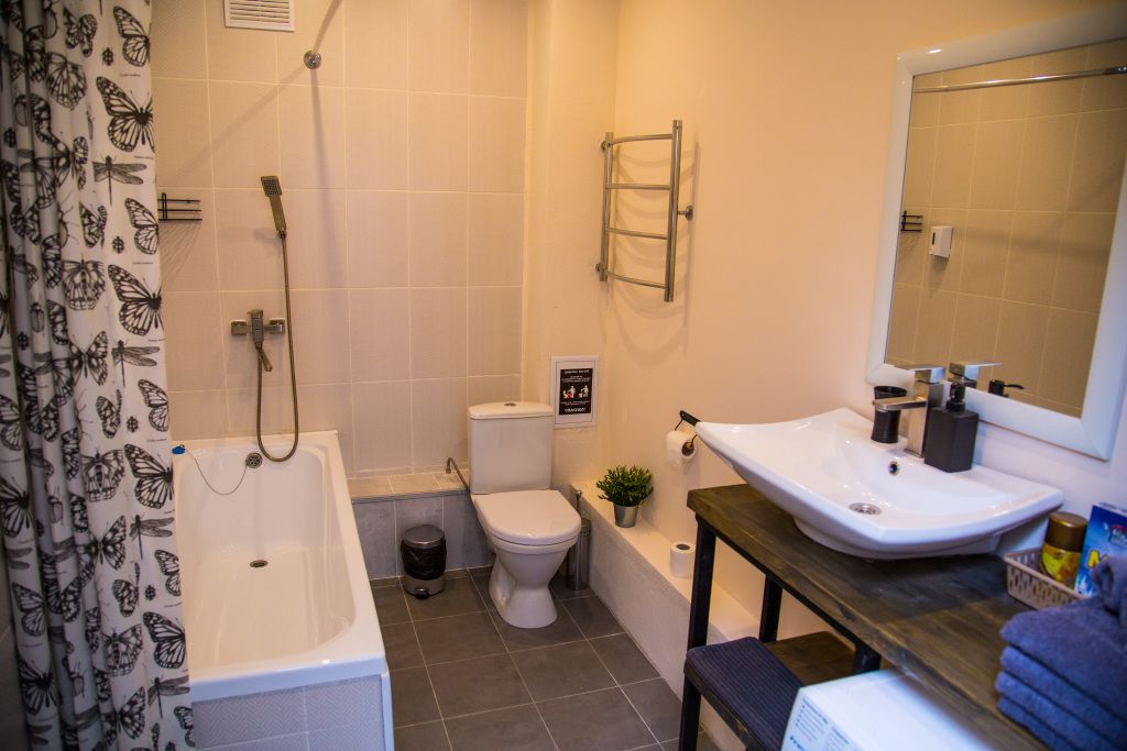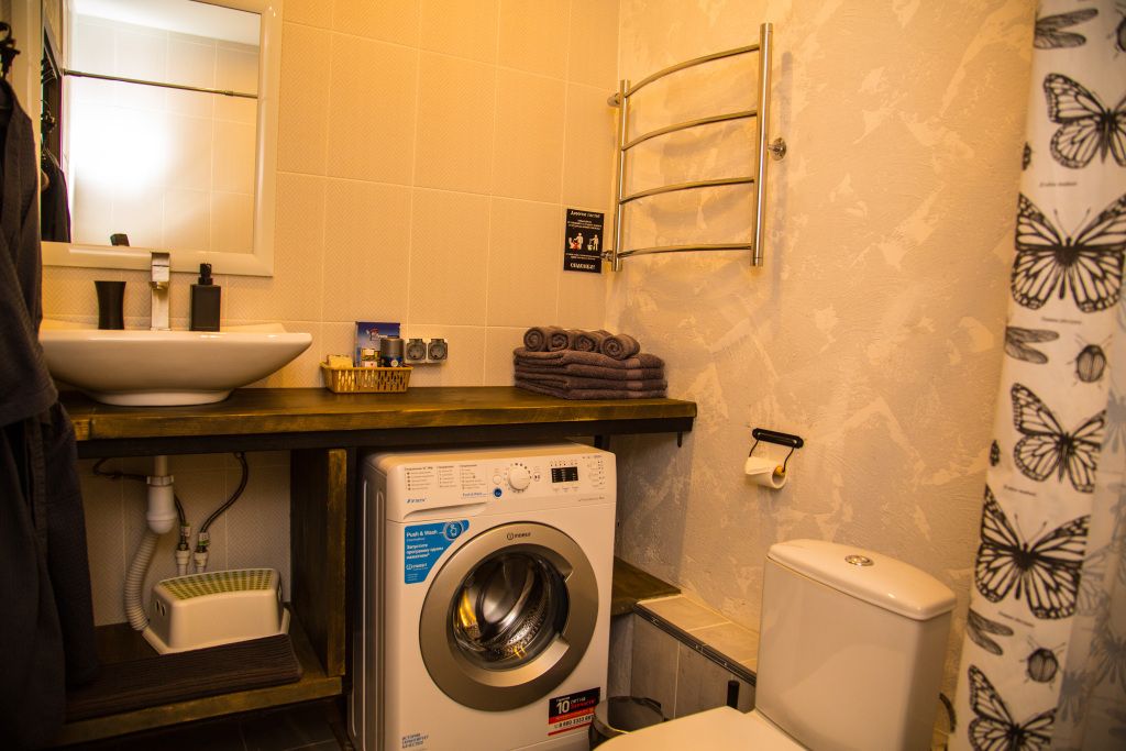 Апартаменты в стиле Loft на первом этаже с балконом. В апартаментах 2 спальни и кухня-гостиная. Спальня 1: 2 односпальные кровати (90х200), прикроватная тумба, открытый гардероб; спальня 2: двуспальная кровать (160х200), кресло, туалетный столик; кухня-гостиная - раскладной двуспальный диван, ТВ. В апартаментах есть все необходимое для проживания: холодильник (маленький); микроволновая печь; индукционная плита; стиральная машина; утюг; гладильная доска; сушилка для белья, чайник и бесплатный wifi. На кухне комплект посуды. Спальные места заправляются постельным бельём по количеству гостей в брони. На каждого гостя предоставляется комплект полотенец (большое и маленькое); одноразовые тапочки и одноразовые средства личной гигиены. Мини-бар платный.Услуги и удобства