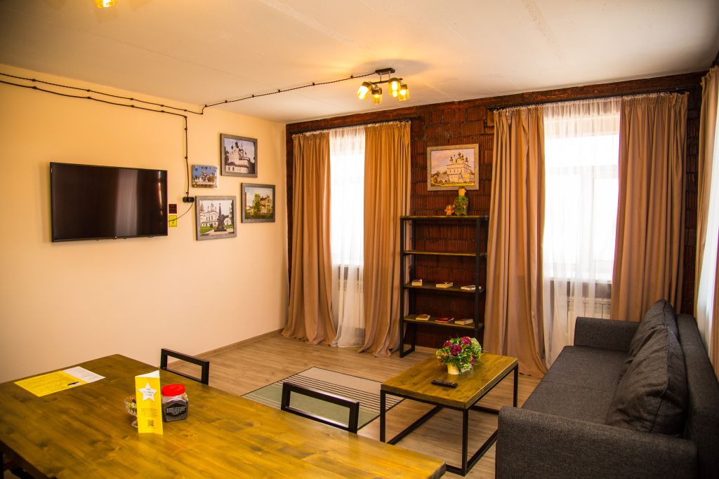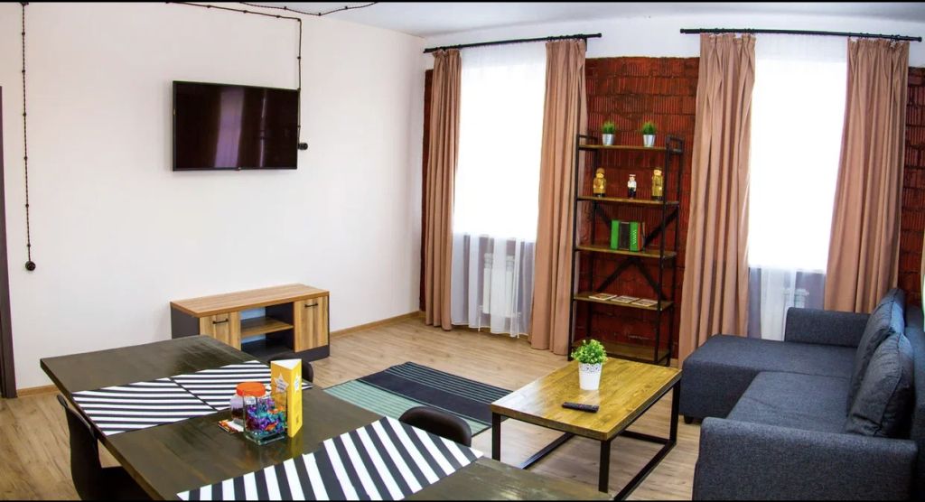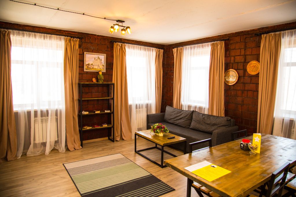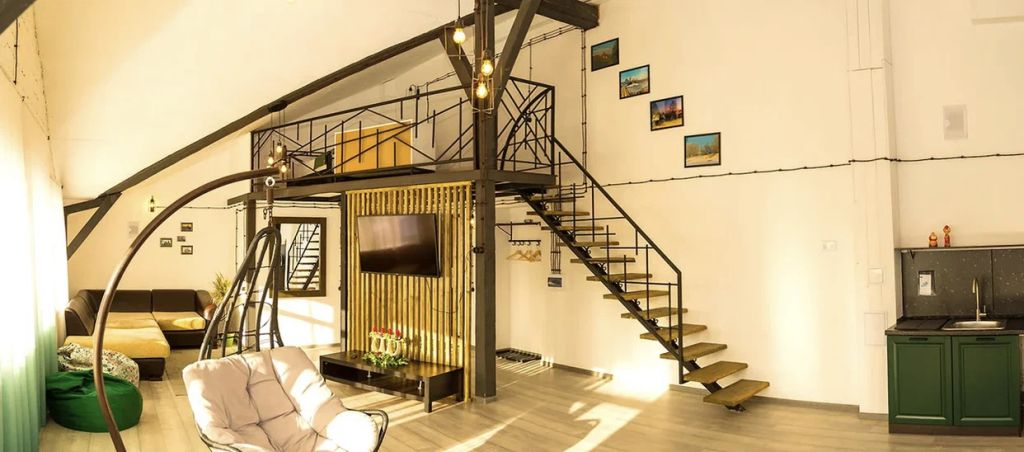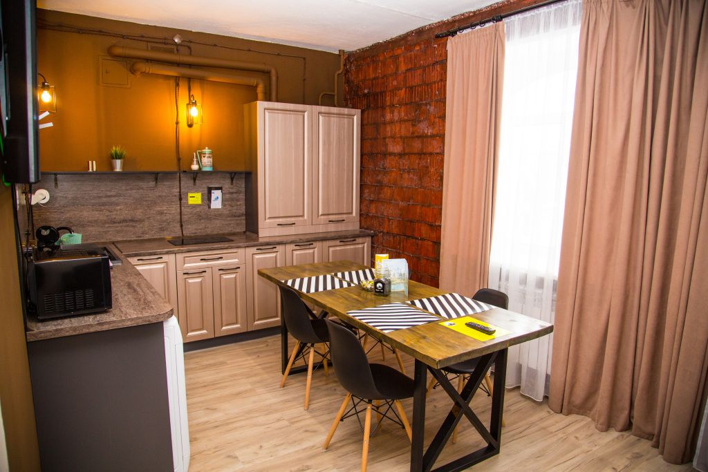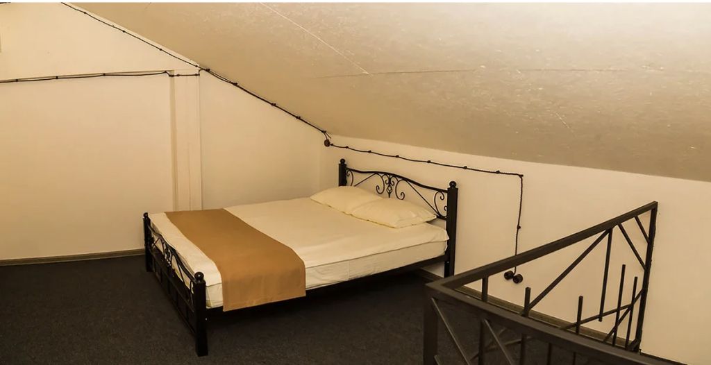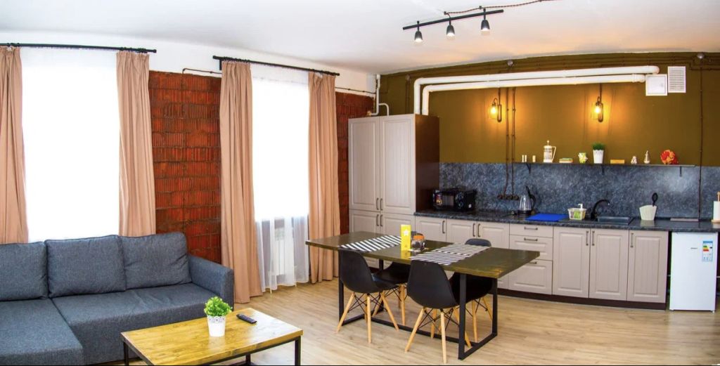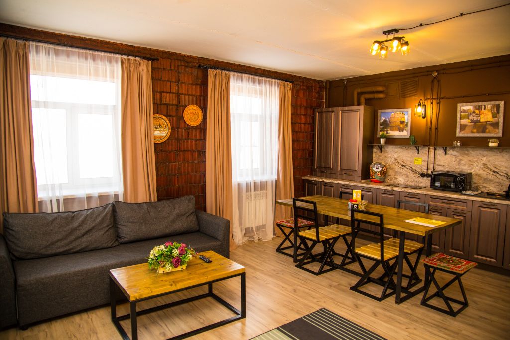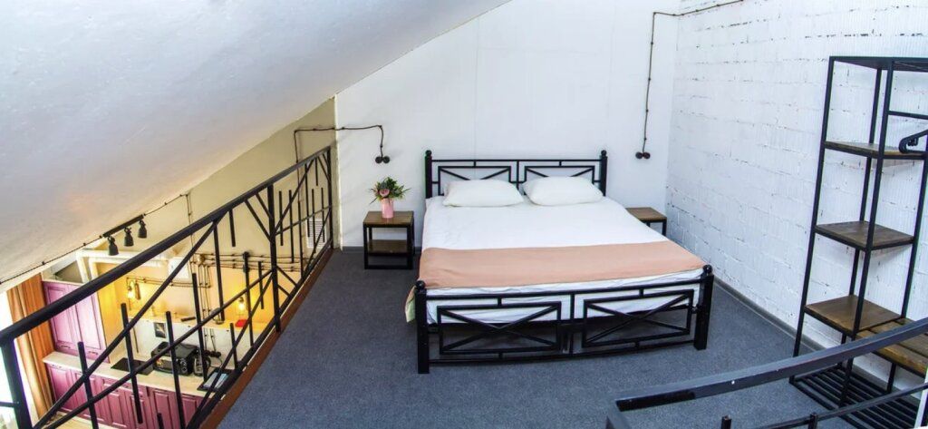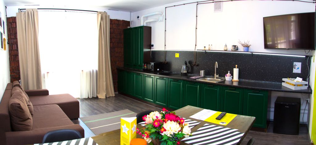 Просторные двухуровневые апартаменты. На втором этаже - двуспальная кровать (160х200), стеллаж, прикроватные тумбы; на первом этаже - двуспальный диван и двуспальная кровать (160х200). Апартаменты так же имеют собственную кухонную зону и ванную комнату. В зоне кухни-гостиной имеется телевизор; большой обеденный стол; кухня оборудована индукционной плитой, холодильником, микроволновой печью и чайником. В апартаментах есть утюг и гладильная доска. В ванной комнате имеется фен, халаты и необходимые одноразовые гигиенические принадлежности. Постельное белье в апартаментах заправляется по количеству гостей. Полотенца так же предоставляются по 2 на гостя; есть одноразовые тапочки. В номере бесплатный wifi.Услуги и удобства