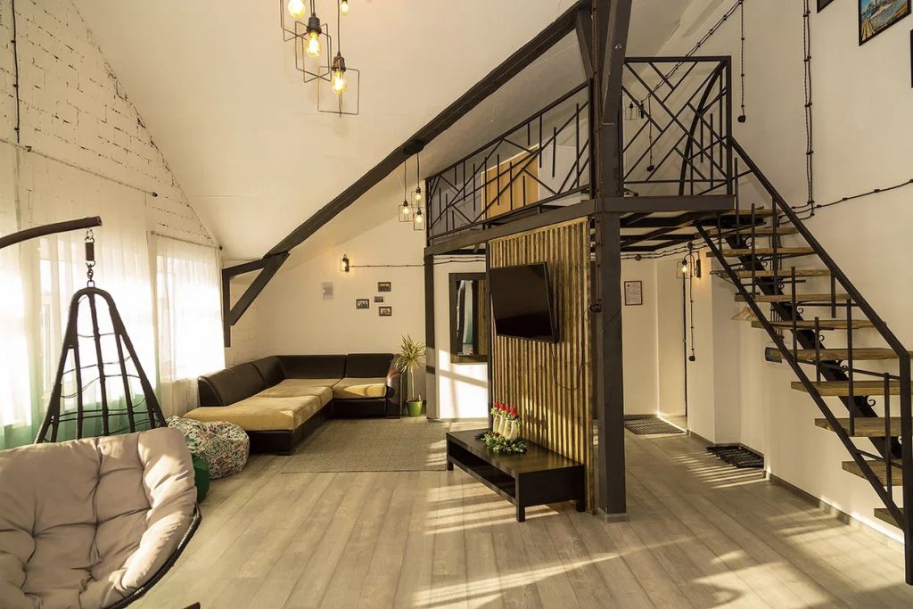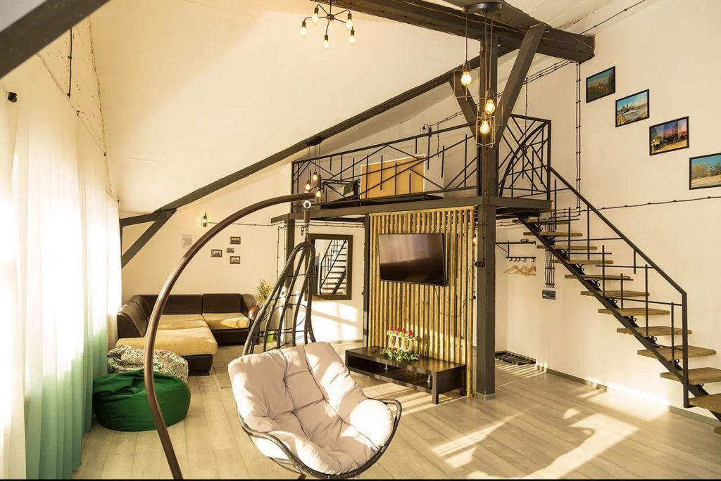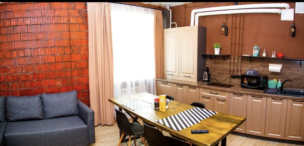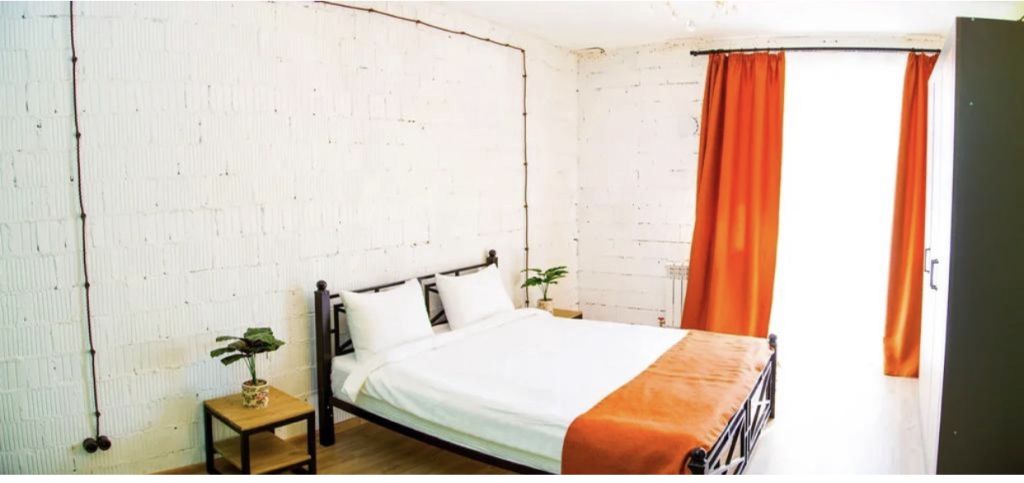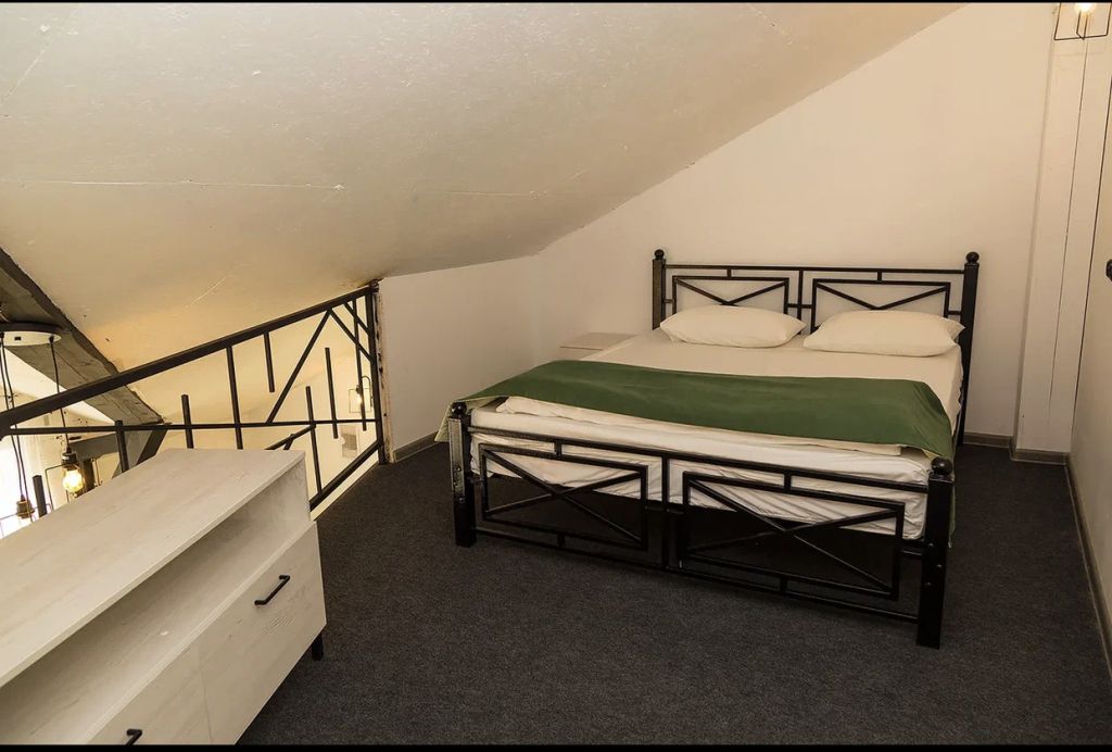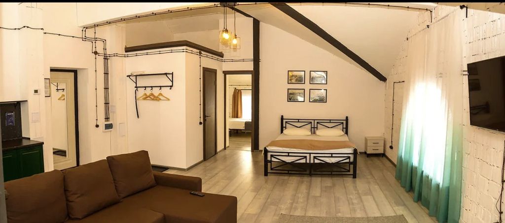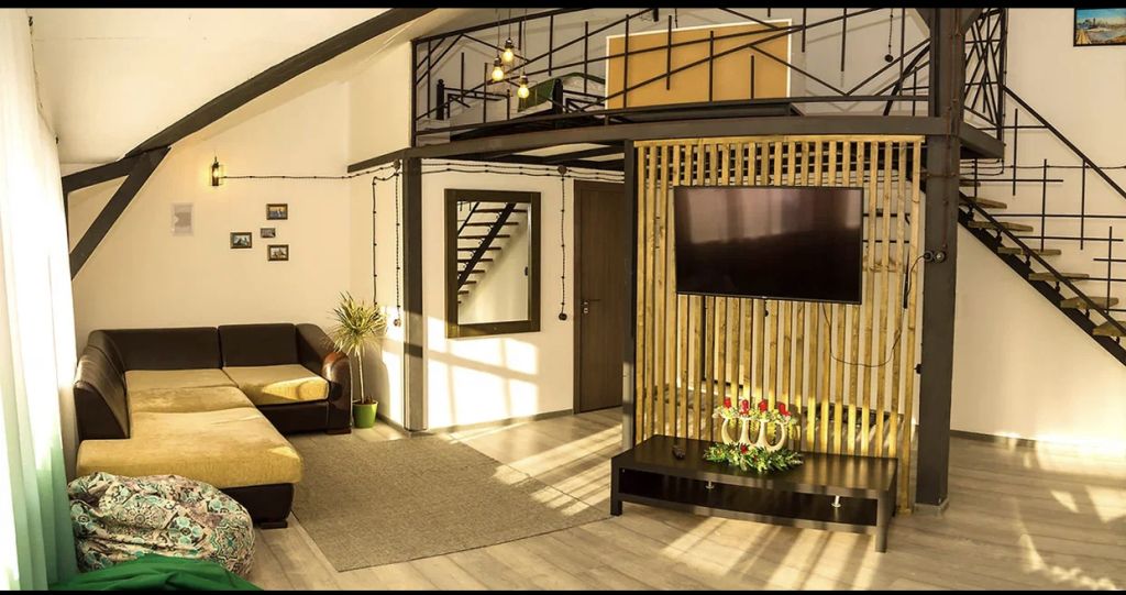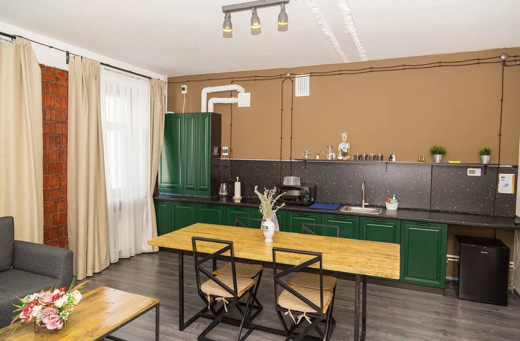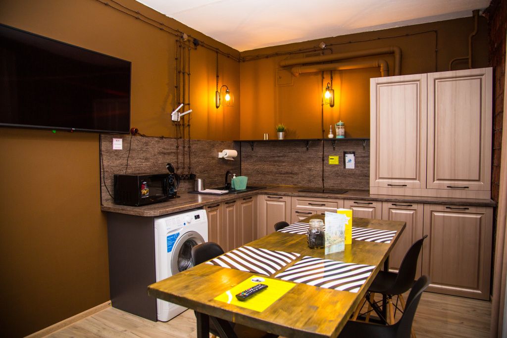 Просторные двухуровневые апартаменты. На втором этаже - двуспальная кровать (160х200), стеллаж, прикроватные тумбы; на первом этаже - двуспальный диван и двуспальная кровать (160х200). Апартаменты так же имеют собственную кухонную зону и ванную комнату. В зоне кухни-гостиной имеется телевизор; большой обеденный стол; кухня оборудована индукционной плитой, холодильником, микроволновой печью и чайником. В апартаментах есть утюг и гладильная доска. В ванной комнате имеется фен, халаты и необходимые одноразовые гигиенические принадлежности. Постельное белье в апартаментах заправляется по количеству гостей. Полотенца так же предоставляются по 2 на гостя; есть одноразовые тапочки. В номере бесплатный wifi.Услуги и удобства