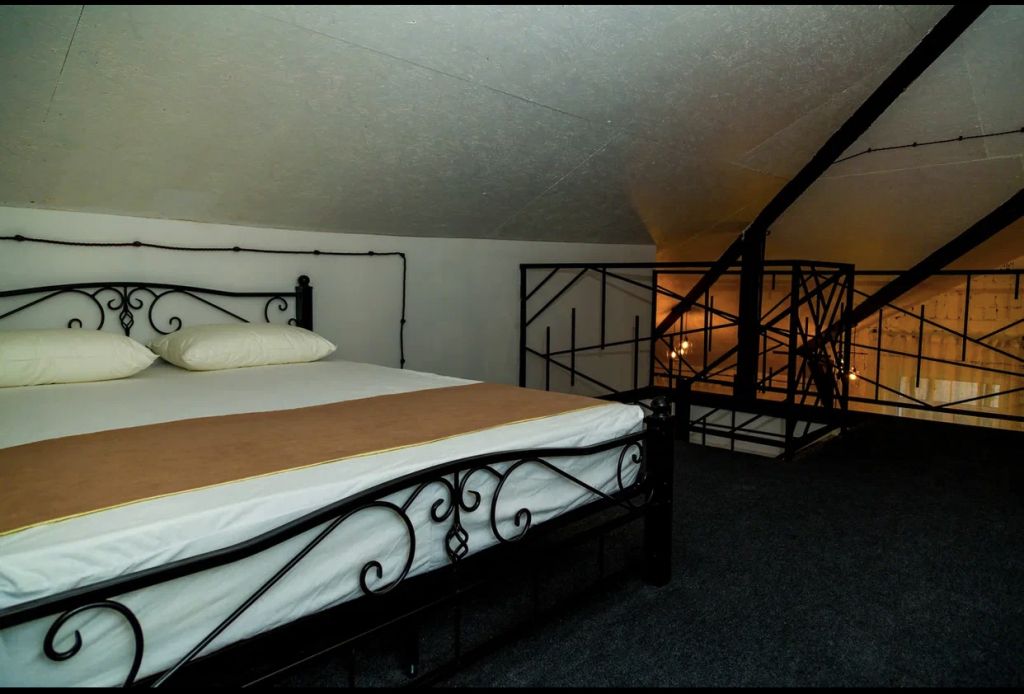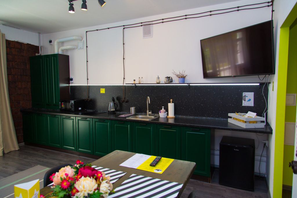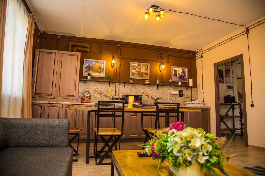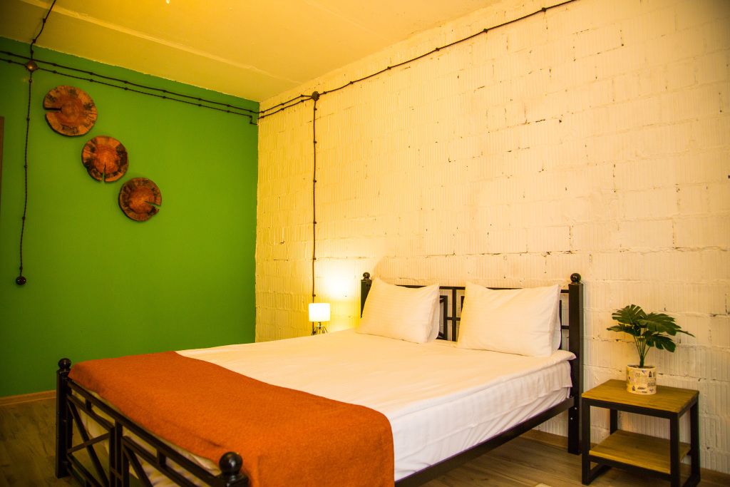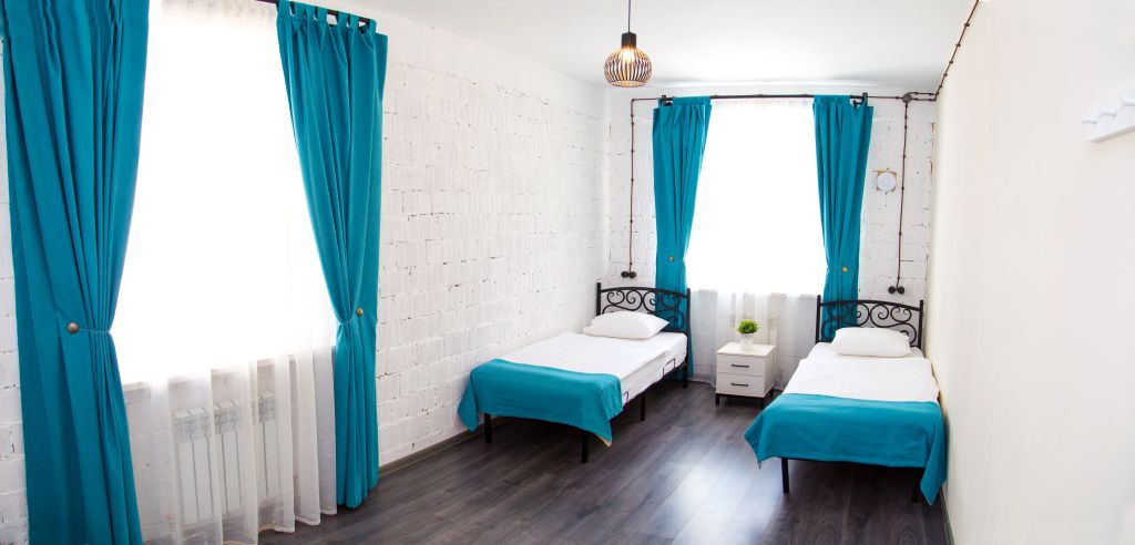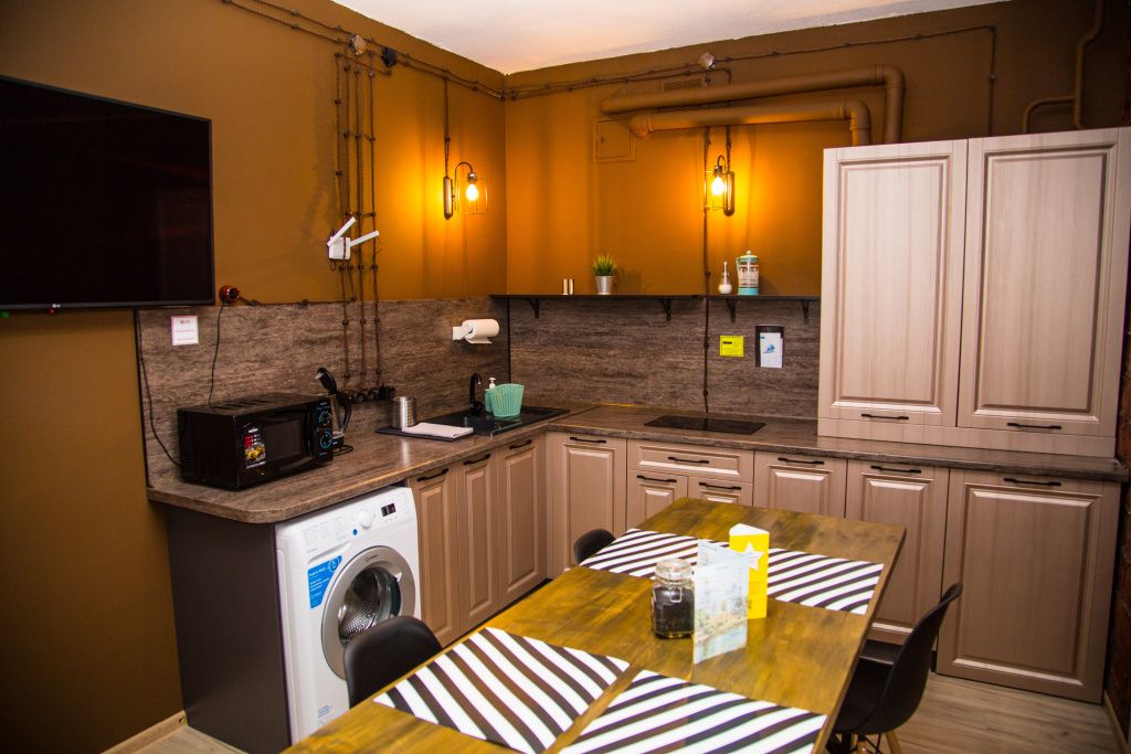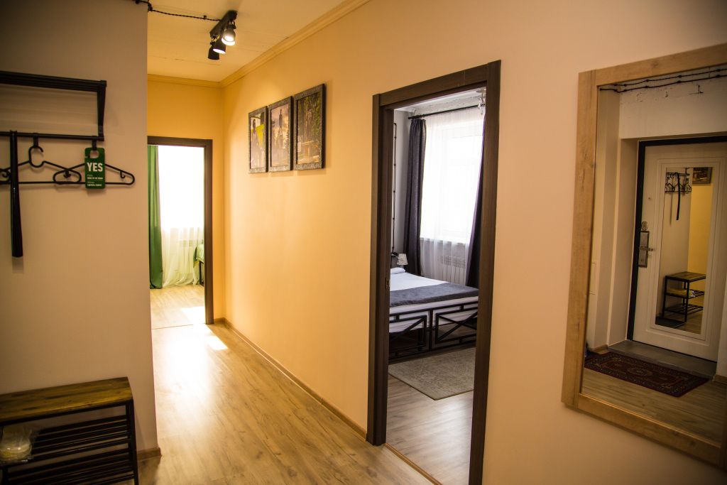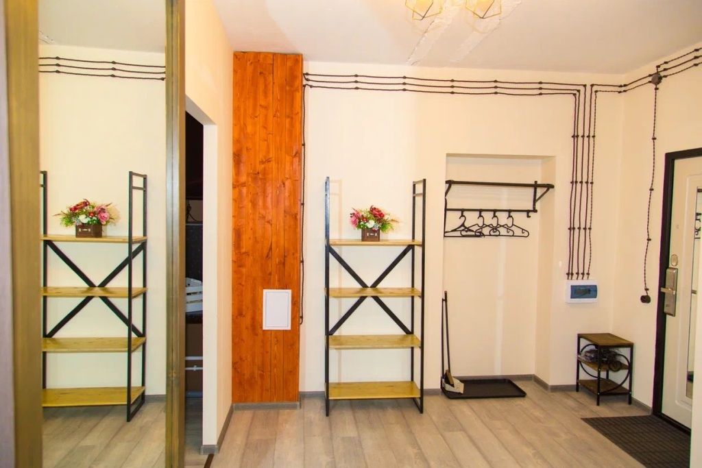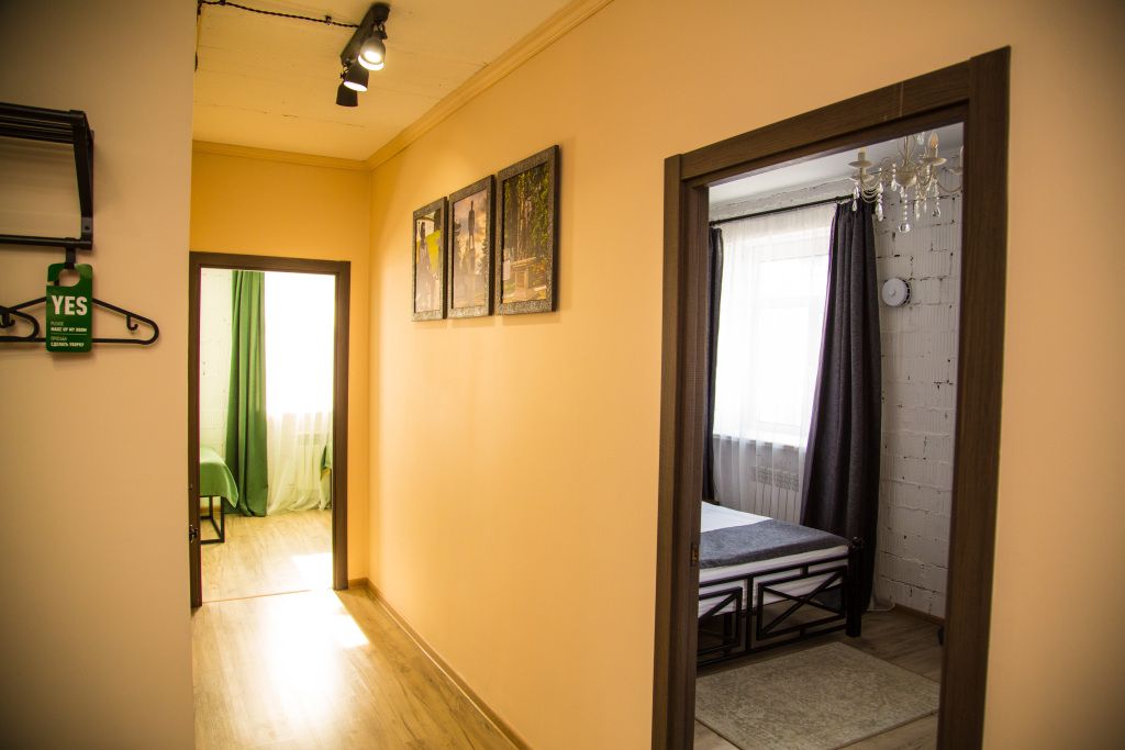 Просторные двухуровневые апартаменты. На втором этаже - двуспальная кровать (160х200), стеллаж, прикроватные тумбы; на первом этаже - двуспальный диван и двуспальная кровать (160х200). Апартаменты так же имеют собственную кухонную зону и ванную комнату. В зоне кухни-гостиной имеется телевизор; большой обеденный стол; кухня оборудована индукционной плитой, холодильником, микроволновой печью и чайником. В апартаментах есть утюг и гладильная доска. В ванной комнате имеется фен, халаты и необходимые одноразовые гигиенические принадлежности. Постельное белье в апартаментах заправляется по количеству гостей. Полотенца так же предоставляются по 2 на гостя; есть одноразовые тапочки. В номере бесплатный wifi.Услуги и удобства