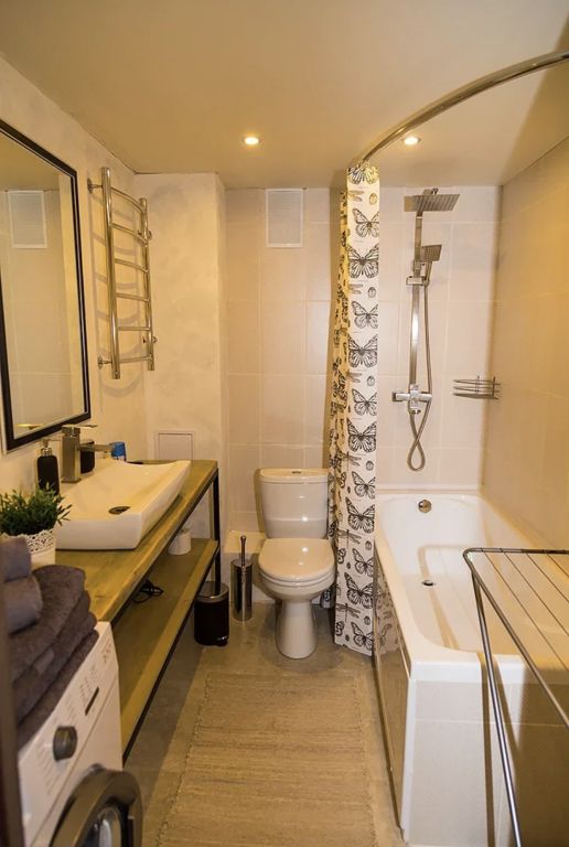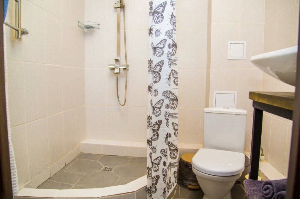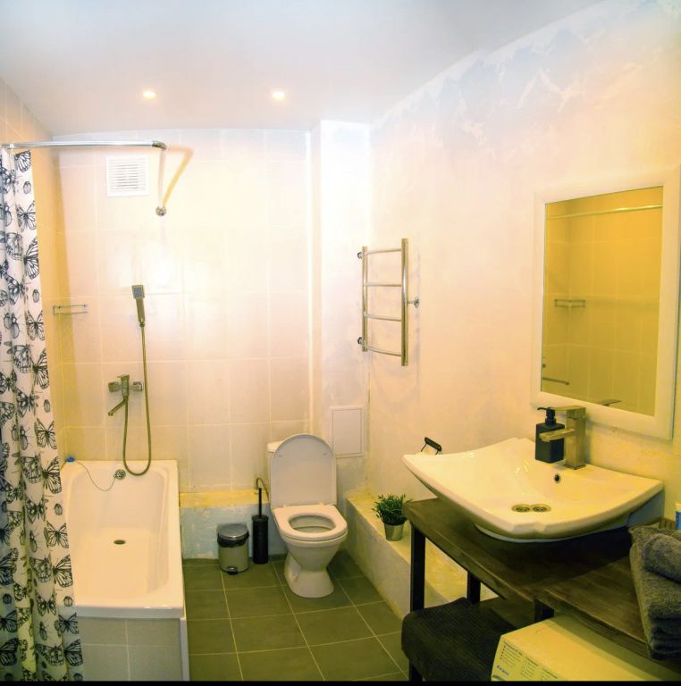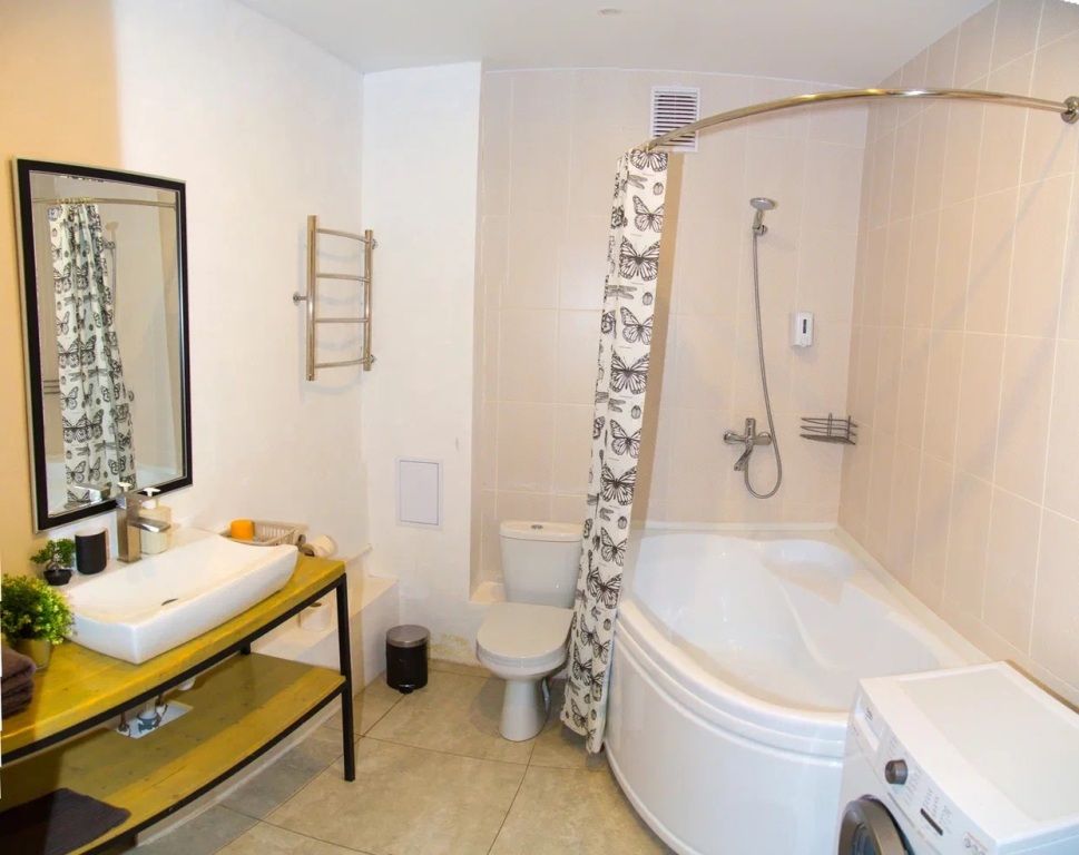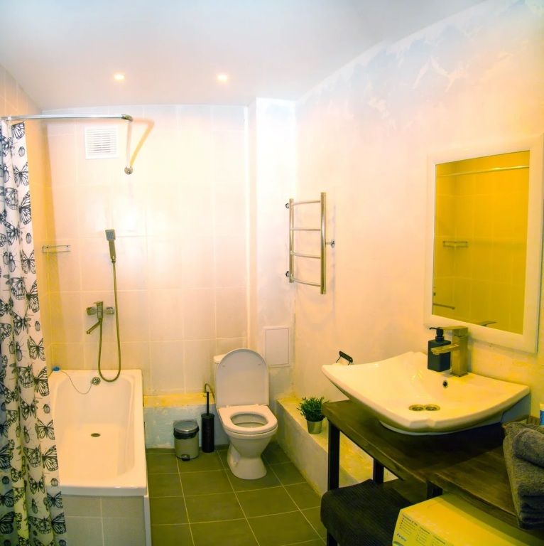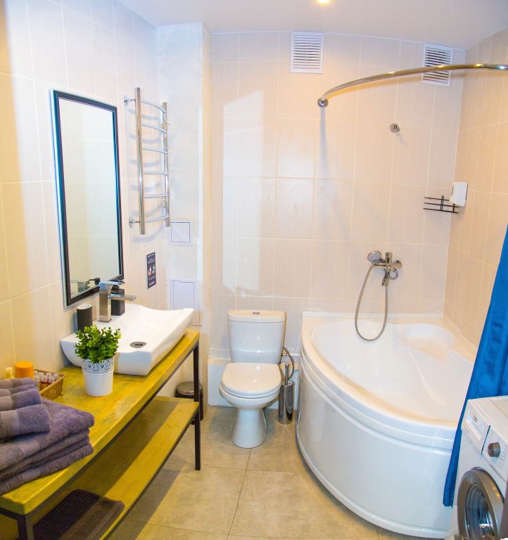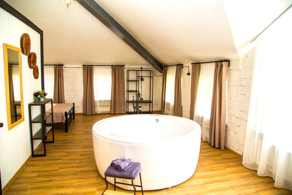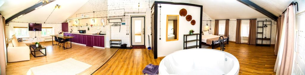 Просторные апартаменты-студия с ванной. Апартаменты не имеют раздельных спален - в едином пространстве находится гостиная с двуспальным диваном и за перегородкой двуспальная кровать. Посередине апартаментов - круглая ванная. Апартаменты так же имеют собственную ванную комнату. В зоне кухни-гостиной имеется телевизор; большой обеденный стол; кухня оборудована индукционной плитой, холодильником, микроволновой печью и чайником. В апартаментах есть утюг и гладильная доска. В зоне спальни - кондиционер. В ванной комнате имеется фен, халаты и необходимые одноразовые гигиенические принадлежности. Постельное белье в апартаментах заправляется по количеству гостей. Полотенца так же предоставляются по 2 на гостя. Есть одноразовые тапочки.Услуги и удобства