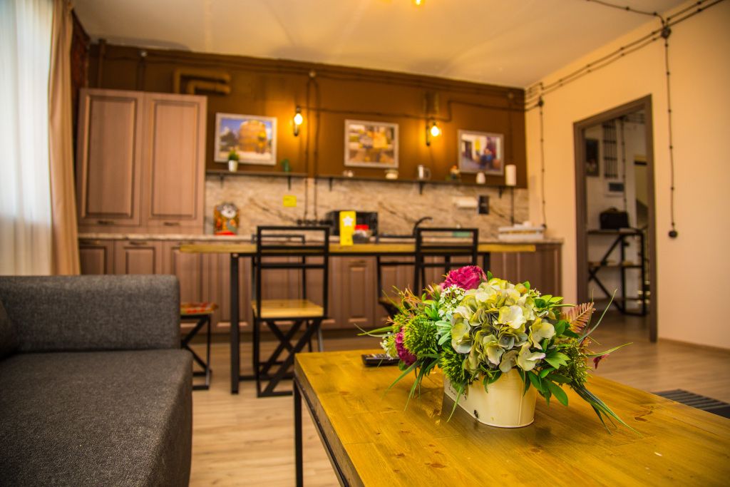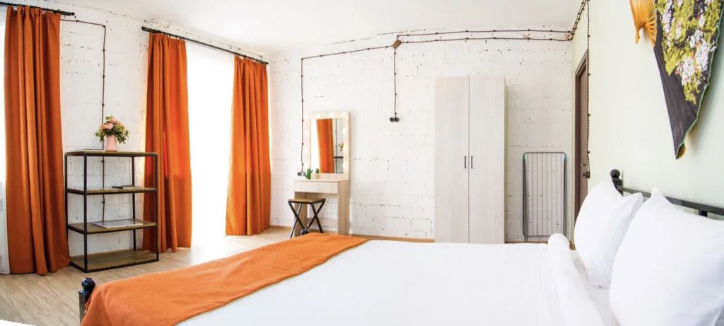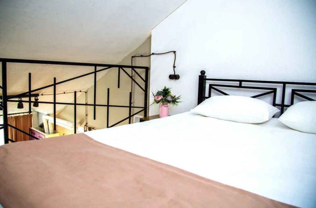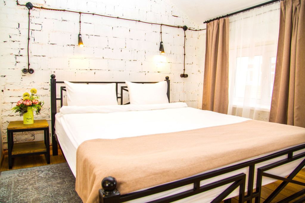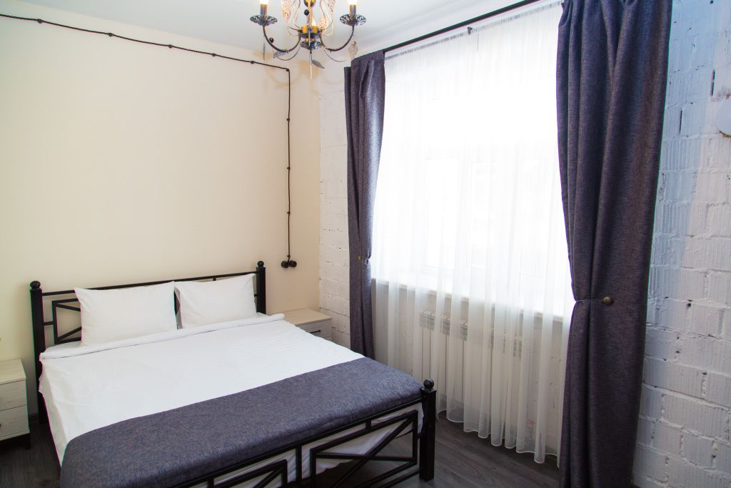 Апартаменты в стиле Loft с двумя спальнями и кухней-гостиной с балконом, расположенные на 2-ом этаже. Вид из окон во внутренний дворик отеля. Спальня №1 - двуспальная кровать 160Х200. Спальня №2 - 2 односпальные кровати 90х200. Кухня-гостиная - двуспальный диван-кровать, тв , холодильник (полноразмерный), микроволновая печь, индукционная плита, посуда, большой обеденный стол. В апартаментах так же есть стиральная машина, сушилка для белья, утюг и гладильная доска. Постельное бельё заправляется по количеству гостей, указанных в брони; полотенца (по 2 штуки на человека); одноразовые гигиенические принадлежности по количеству гостей. Есть мини-бар (платно). В апартаментах совмещенный санузел с угловой акриловой ванной. На балконе этих апартаментов можно курить. В самих апартаментах курить строго запрещено.Услуги и удобства