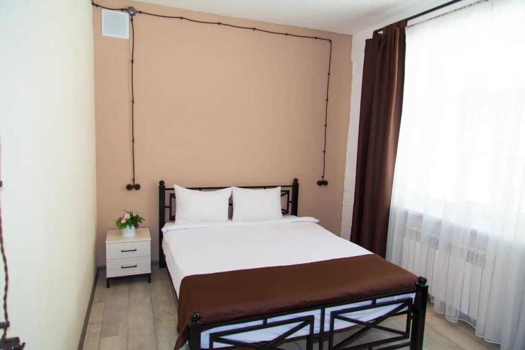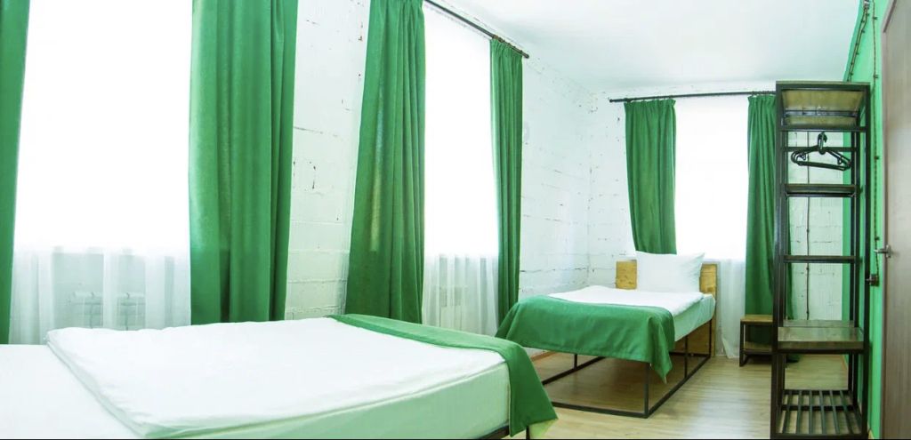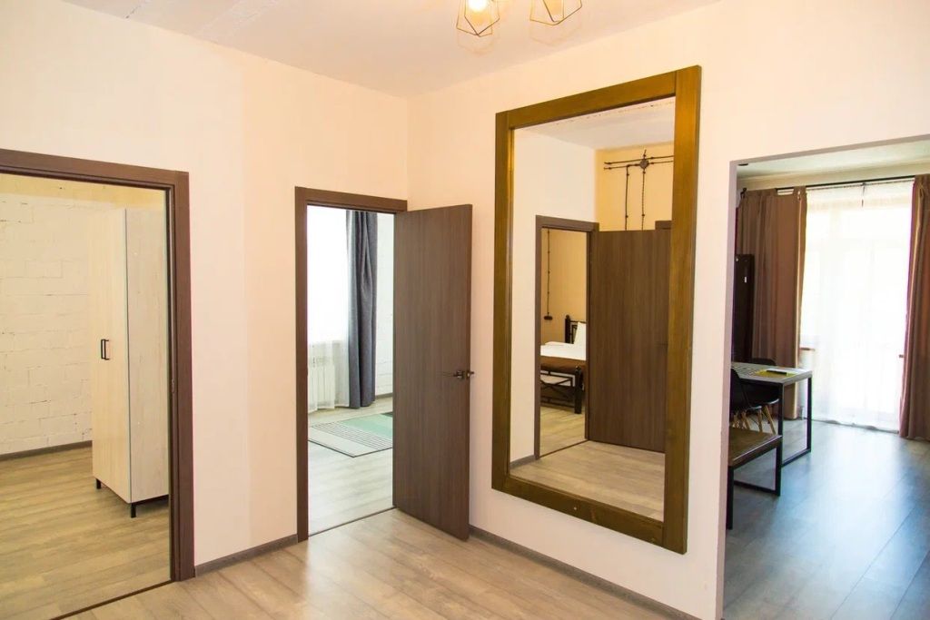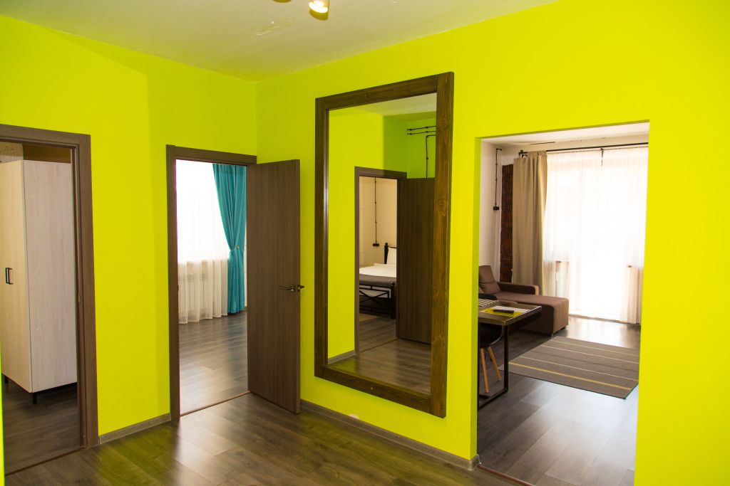 Апартаменты в стиле Loft с двумя спальнями и кухней-гостиной с балконом, расположенные на 1-ом этаже. Вид из окон во внутренний дворик отеля. Спальня №1 - двуспальная кровать 160Х200. Спальня №2 - 2 односпальные кровати 90Х200. Кухня-гостиная - двуспальный диван-кровать, тв , холодильник (маленький), микроволновая печь, индукционная плита, посуда, большой обеденный стол. В апартаментах так же есть стиральная машина, сушилка для белья, утюг и гладильная доска. Постельное бельё заправляется по количеству гостей, указанных в брони; полотенца (по 2 штуки (большое и маленькое) на гостя); одноразовые гигиенические принадлежности по количеству гостей. Есть мини-бар (платно). В апартаментах совмещенный санузел с угловой акриловой ванной. На балконе этих апартаментов можно курить.Услуги и удобства