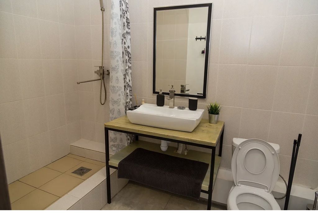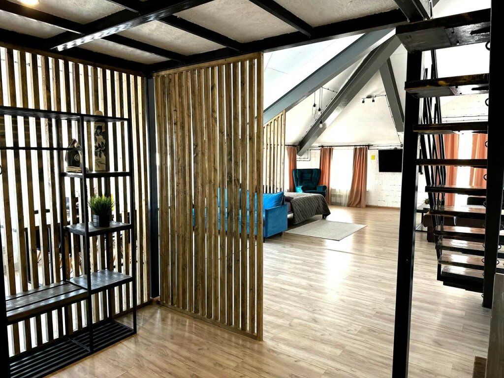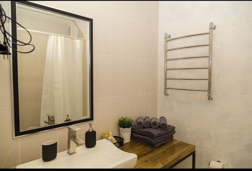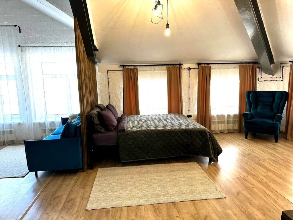 Просторные апартаменты, оформленные в стиле loft с балконом. Вид на реку. В апартаментах 2 спальни, кухня-гостиная и собственный санузел (душ). Спальня 1: двуспальная кровать, прикроватные тумбы, шкаф для одежды. Спальня 2: 2 односпальные кровати, прикроватные тумбы, открытый гардероб. Кухня-гостиная: двуспальный диван; холодильник, тв , кухонный гарнитур, микроволновая печь, индукционная плита, чайник, посуда, большой обеденный стол. В апартаментах так же есть стиральная машина, сушилка для белья, утюг и гладильная доска. Постельное бельё заправлено по количеству гостей в брони; полотенца (по 2 штуки на человека); одноразовые гигиенические принадлежности по количеству гостей.Услуги и удобства