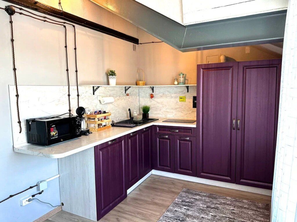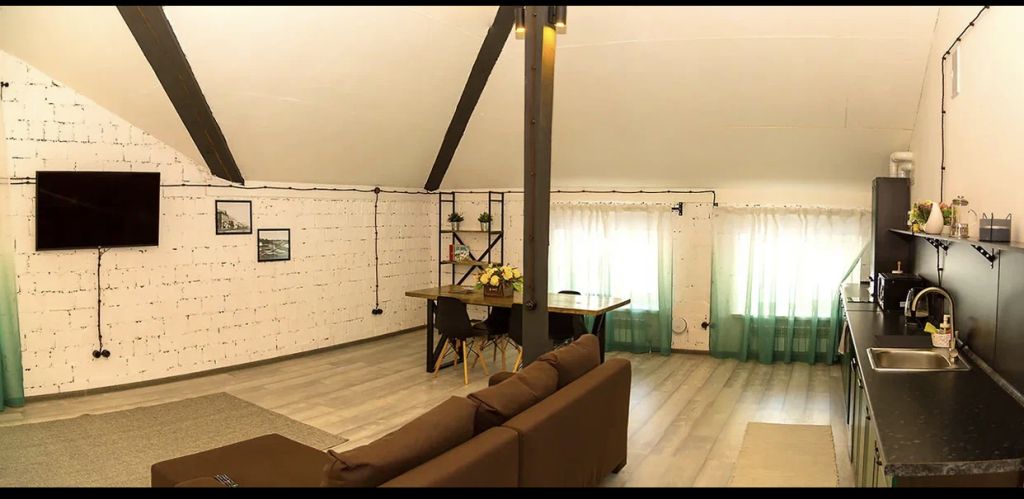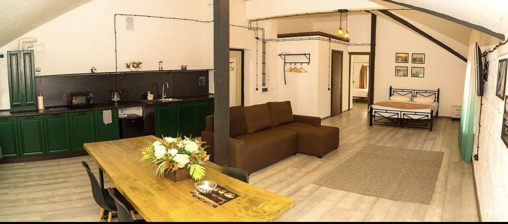 Просторные двухуровневые апартаменты - студия, расположенные на третьем этаже. Апартаменты состоят из просторной кухни-гостиной и открытой спальни на втором этаже. Кухня-гостиная оборудована всем необходимым для приятного отдыха. Имеется большой обеденный стол, индукционная двухкомфорочная плита, микроволновая печь, холодильник (маленький), ТВ, чайник, угловой нераскладной диван, кондиционер. В спальне - двуспальная кровать (160х200). Санузел совмещённый. Так же в апартаментах имеется гладильная доска и утюг. Максимальная вместимость номера 3 человека. Апартаменты для некурящих.Услуги и удобства