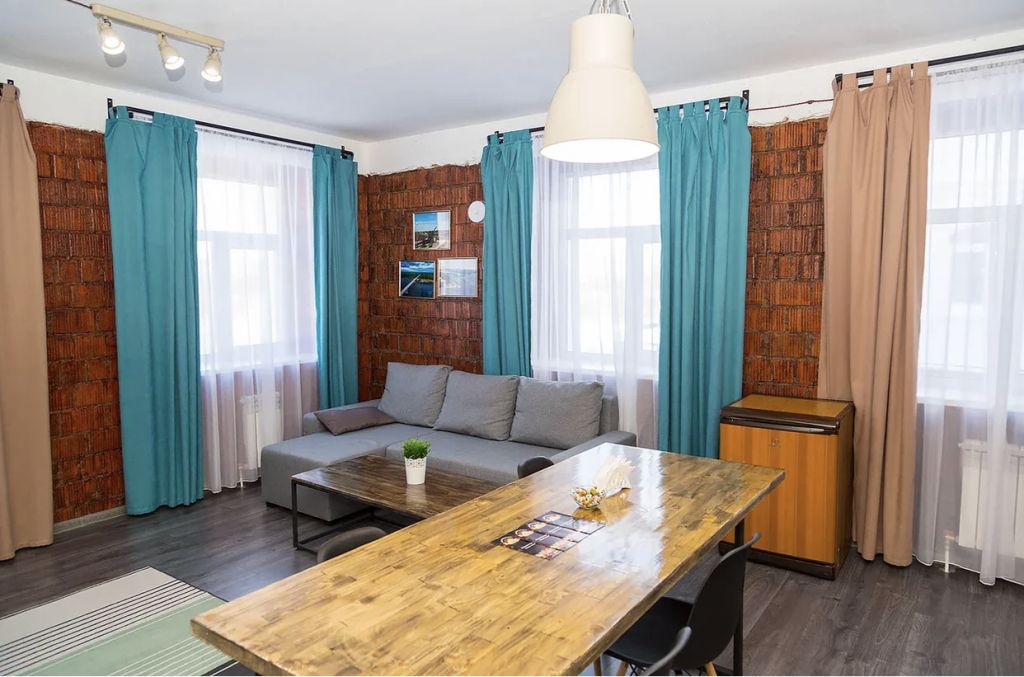 Современные апартаменты в стиле Loft на втором этаже с балконом. Вид из окна на реку и на внутренний дворик отеля. В апартаментах 2 спальни и кухня гостиная. Комплектация спальных мест. Спальня 1: 2 односпальные кровати (90х200), открытый гардероб; спальня 2: двуспальная кровать (160х200), туалетный столик, кресло, ТВ; кухня-гостиная - раскладной двуспальный диван. В апартаментах есть все необходимое для проживания: кухонный гарнитур, холодильник (маленький); микроволновая печь; индукционная плита; стиральная машина; утюг; гладильная доска; сушилка для белья; тв и бесплатный wifi. На кухне комплект посуды. Спальные места заправляются постельным бельём по количеству гостей в брони. На каждого гостя предоставляется комплект полотенец (большое и маленькое); одноразовые тапочки и одноразовые средства личной гигиены.Услуги и удобства