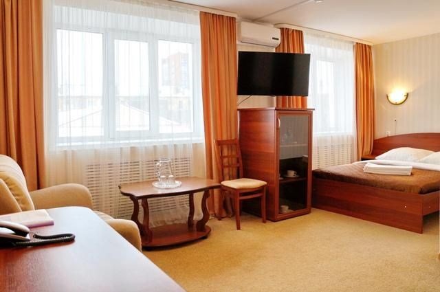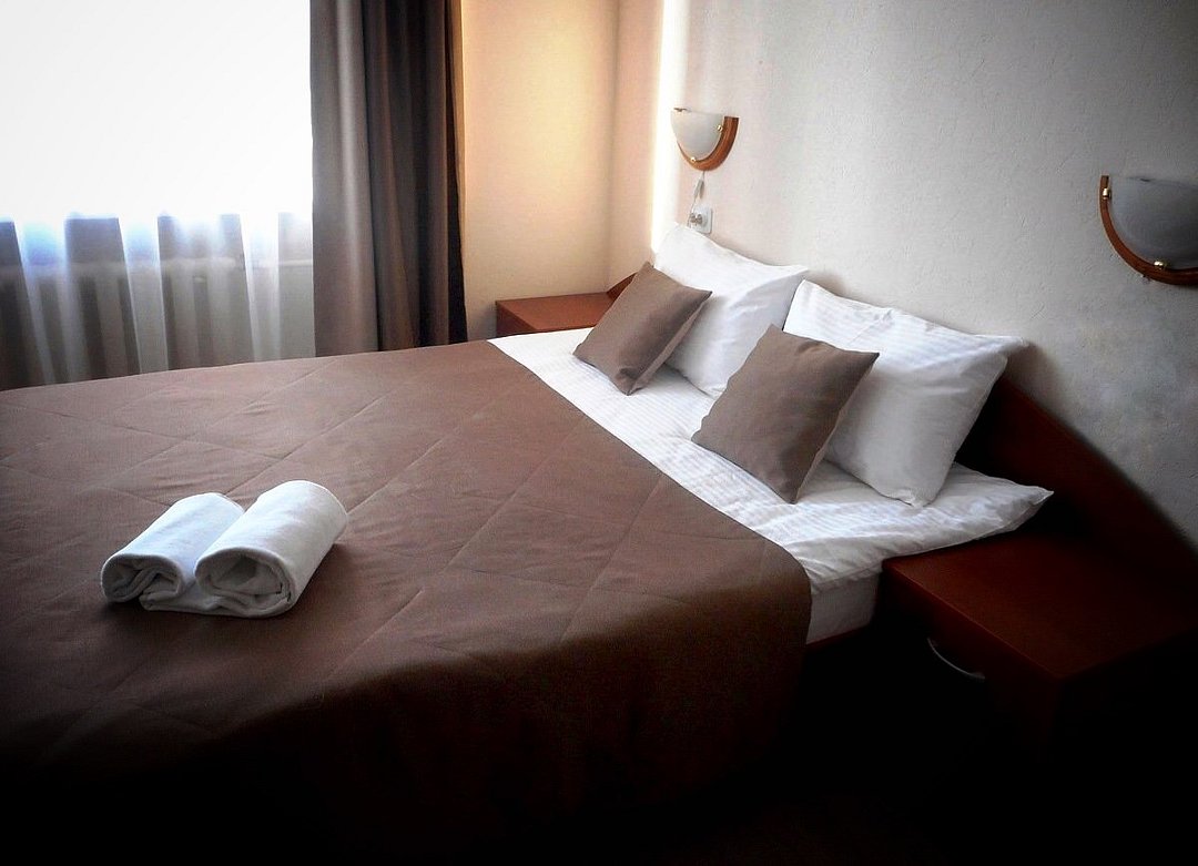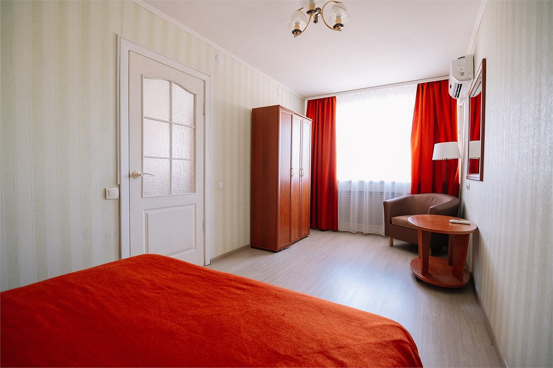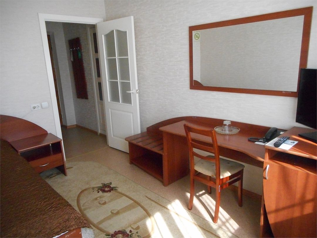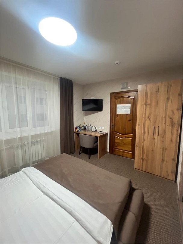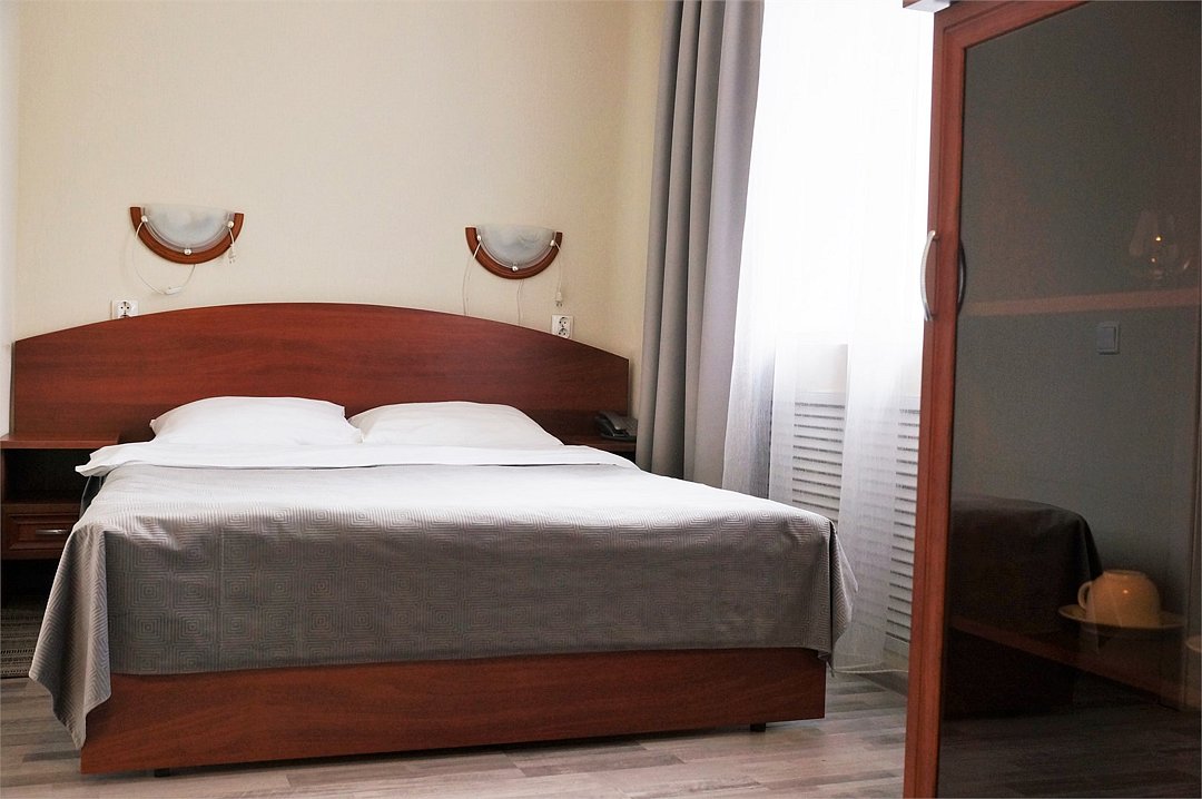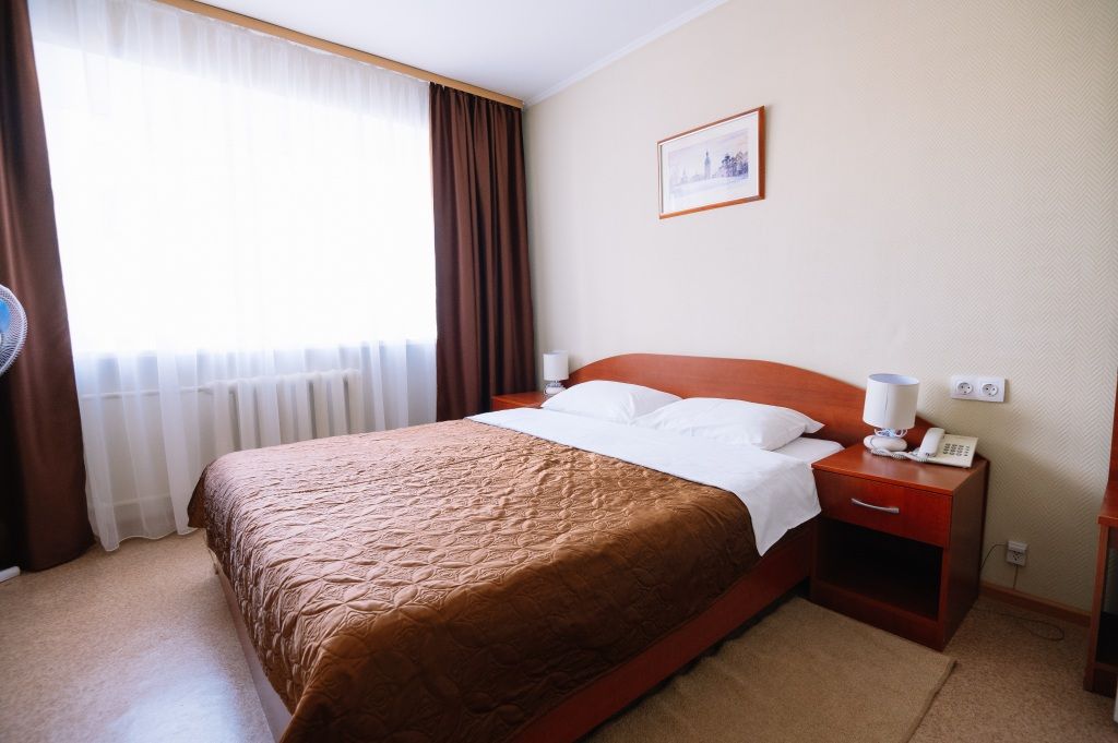 кровать двуспальная; шкаф, прикроватная тумбочка для размещения вещей и документов; стол, стул для приема пищи или работы; в ванной комнате унитаз и душ для проведения гигиенических процедур; зеркало; телевизор; мини холодильник. В таком номере с достаточным уровнем комфорта разместится один человек, путешествующий в деловых целях, или семья. Мы заинтересованы в хороших впечатлениях своих гостей и позитивных отзывах и стараемся сделать проживание в отеле более комфортным и обеспечить постояльцев необходимыми атрибутами. Например, бесплатным интернетом.Услуги и удобства