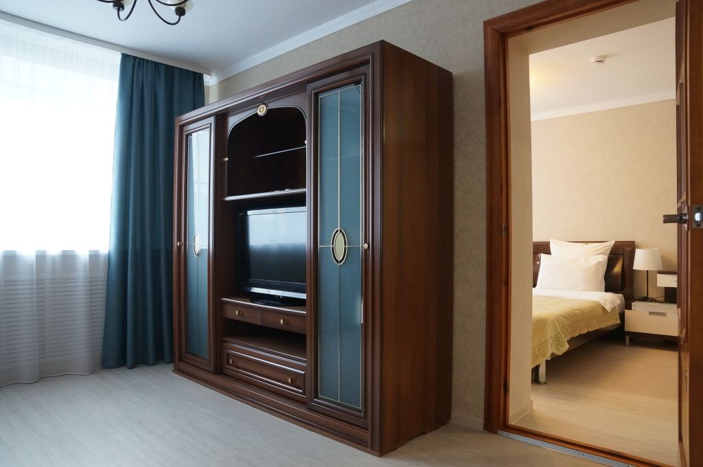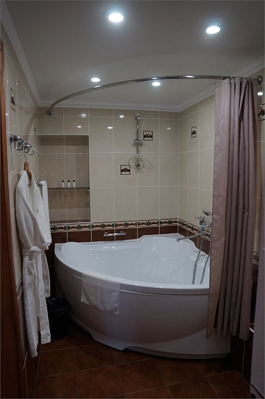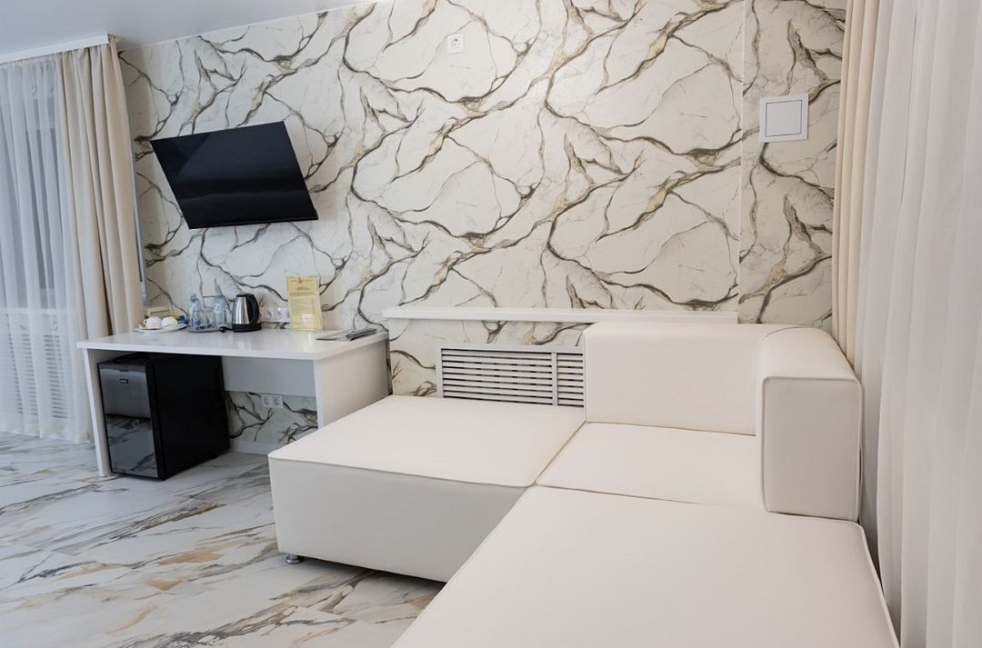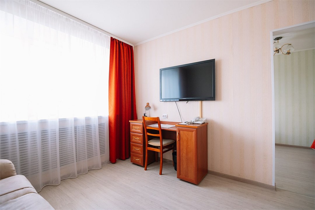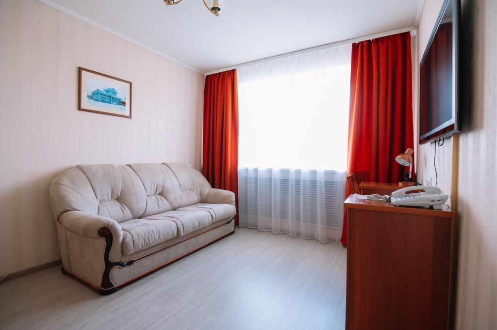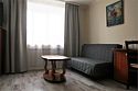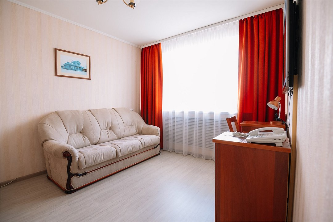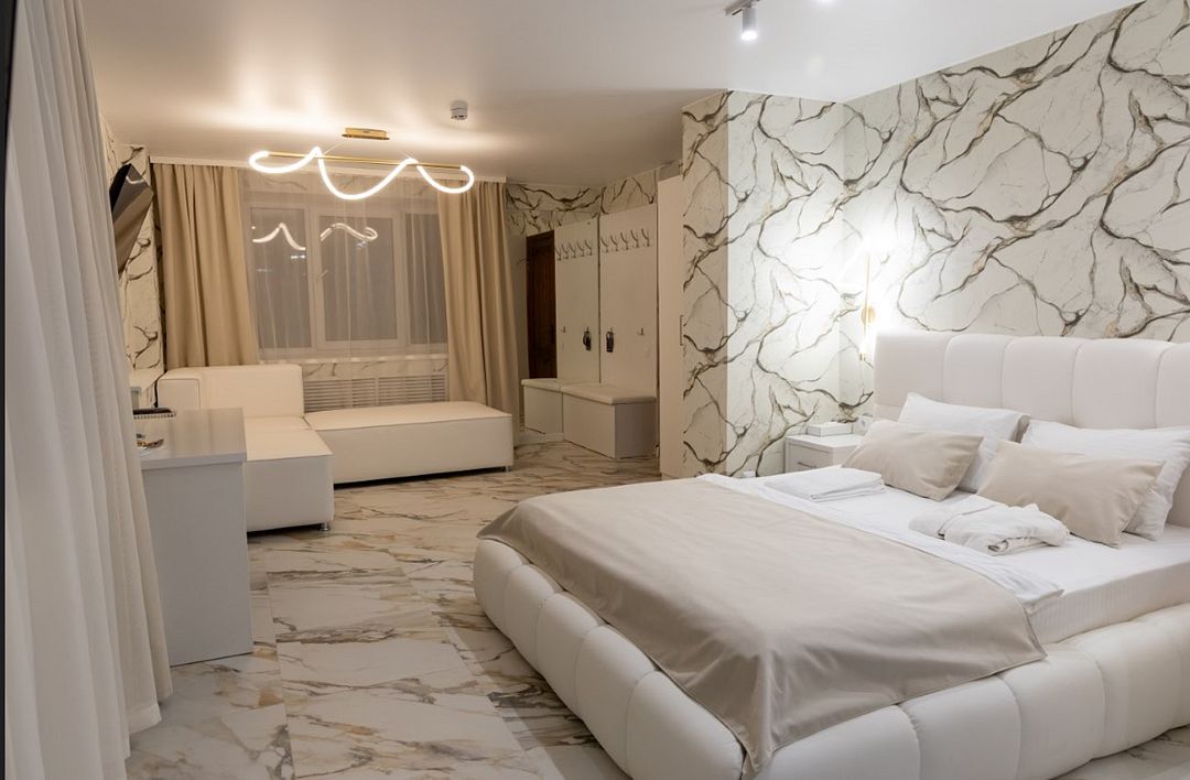 Однокомнатный номер высшей категории. В номере большая ванна-джакузи, санузел с душем, кровать 160 см, диван может использоваться в качестве дополнительного спального места на одного человека, бутилированная вода, фен, завтрак "шведский стол " включён. Двухместное размещение на раздельных спальных местах оплачивается дополнительно.Услуги и удобства