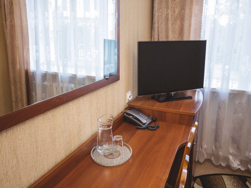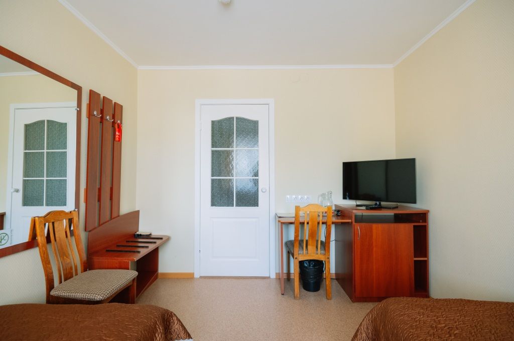 телевизор, кабельное телевидение, Wi-Fi, фен, система безопасности, ванна или душевая кабина, санузел, банные полотенца, гигиенические средства, две односпальные кровати, тумбы, стулья, шкаф для одежды, письменный стол, багажная тумба, зеркало, набор посуды, обслуживание номеров, информационная карта, меню, вид на город, кулер на этаже, стаканы, внутренний телефон, мини-холодильник, москитная сеткаВ гостиничном номере