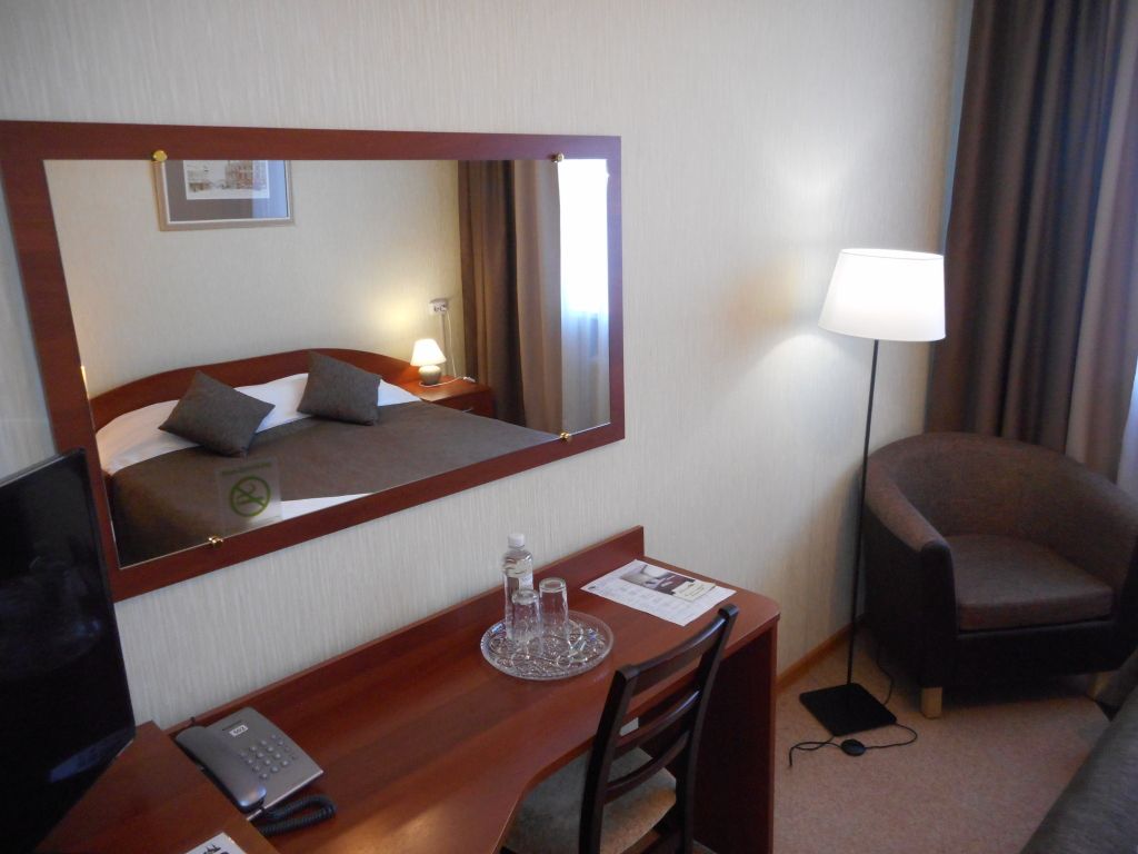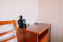 телевизор, кабельное телевидение, Wi-Fi, фен, система безопасности, ванна или душевая кабина, санузел, банные полотенца, гигиенические средства, односпальная кровать, шкаф для одежды, письменный стол, багажная тумба, зеркало, набор посуды, обслуживание номеров, информационная карта, меню, вид на город, кулер на этаже, стул, тумба, внутренний телефон, мини-холодильникВ гостиничном номере