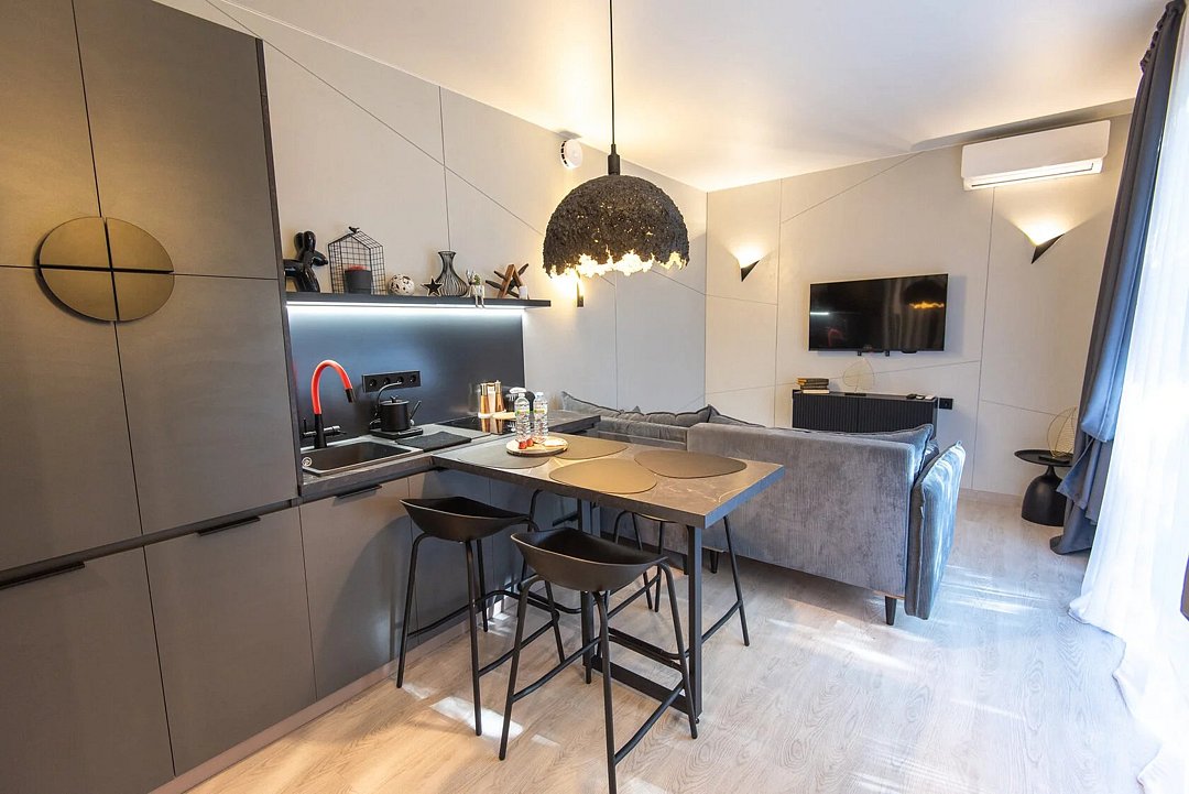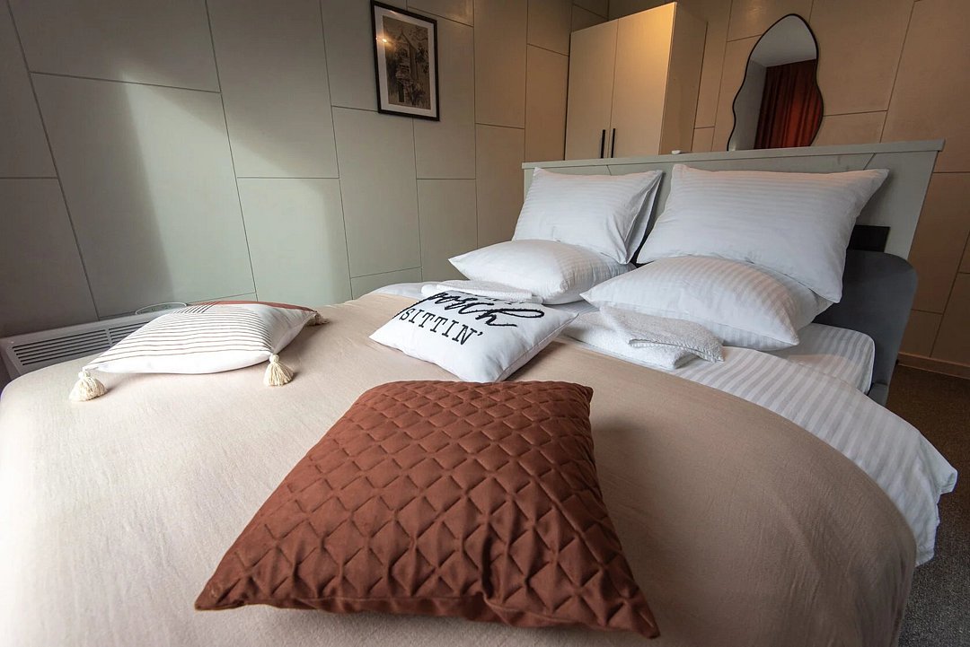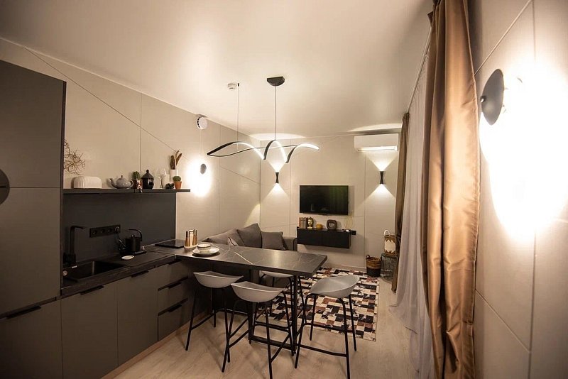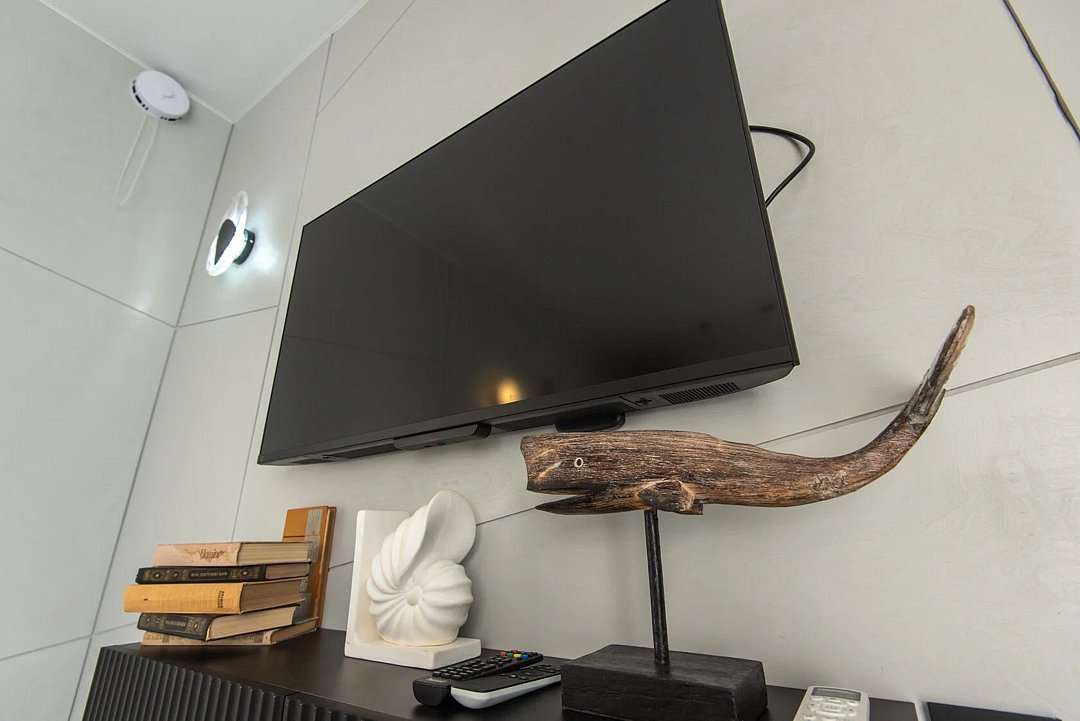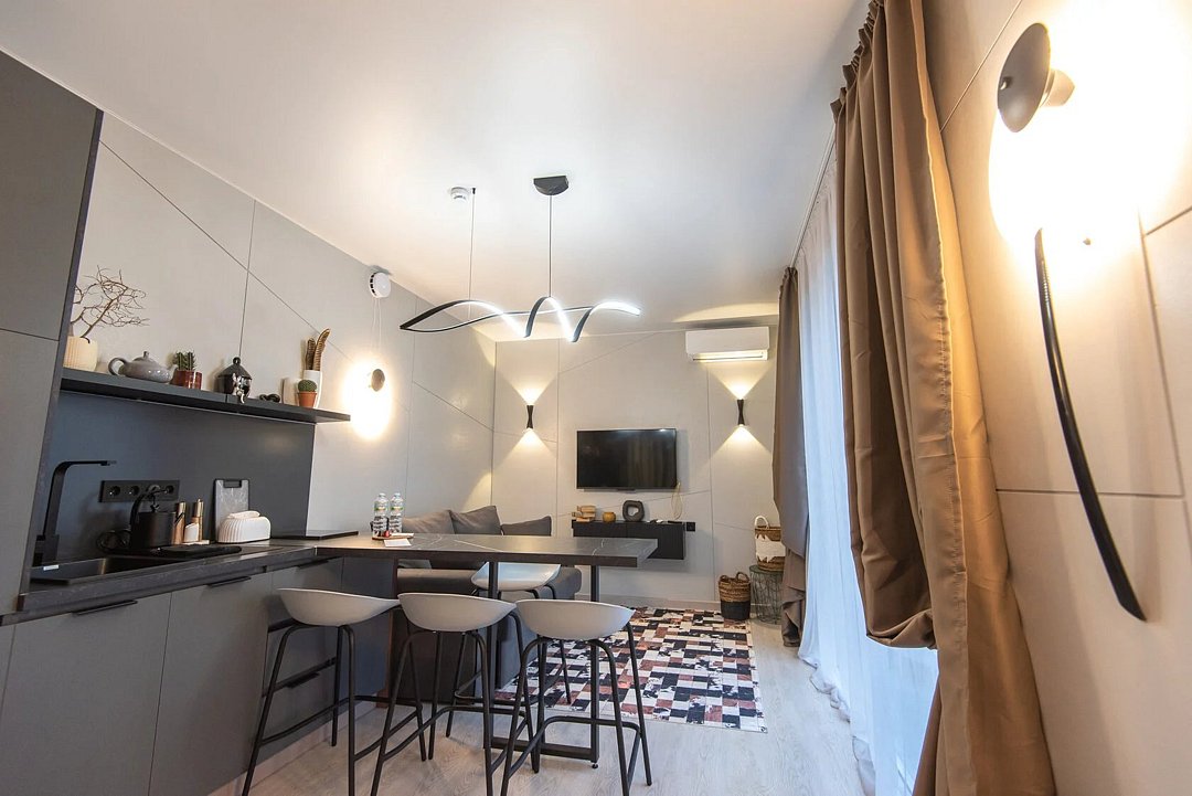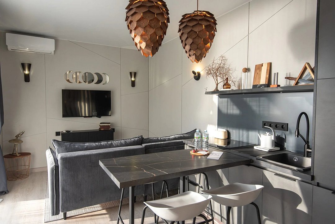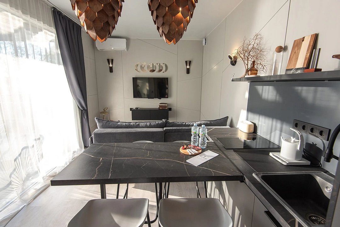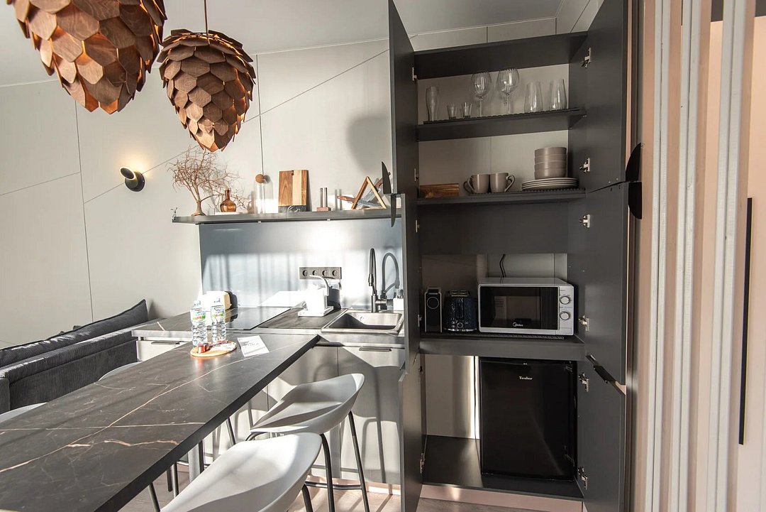 Авторский дизайн интерьеров. Оборудованная всей необходимой техникой мини-кухня (плита, СВЧ печь, чайник, холодильник, тостер, капсульная кофемашина), полный комплект посуды, постельное белье, полотенца, халаты, тапочки, панорамные окна.
